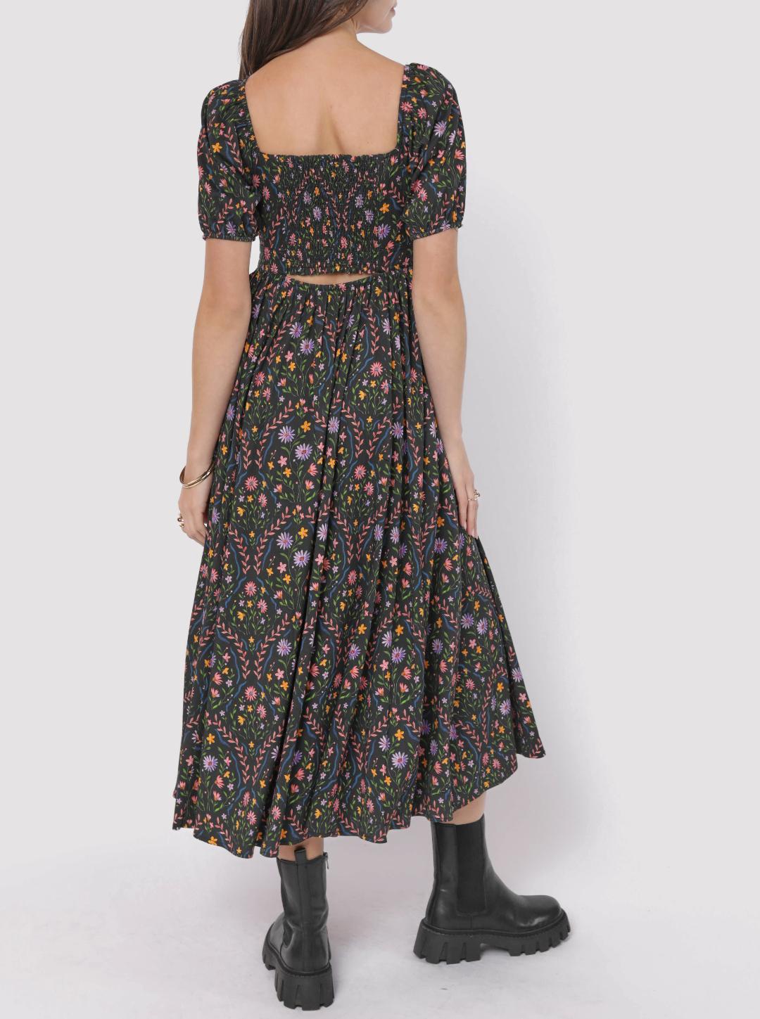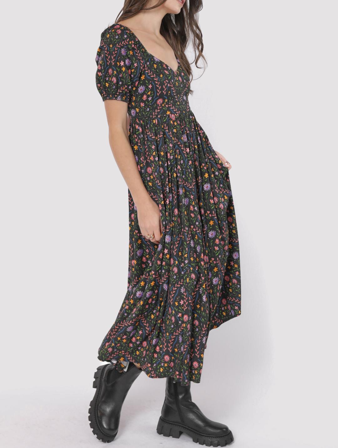 A little sweet, a little unexpected — the Garden Party Cutout Maxi Dress brings whimsical charm with a modern twist. Featuring a romantic sweetheart neckline and puff sleeves, this flowy black-based maxi is covered in a vibrant floral print with hints of lavender, coral, yellow, and green. The smocked bodice offers a flattering fit, while the surprise back cutout adds a playful peek of skin. Finished with pockets and a breezy tiered skirt, it’s perfect for brunches, outdoor weddings, or simply feeling your prettiest any day of the week.