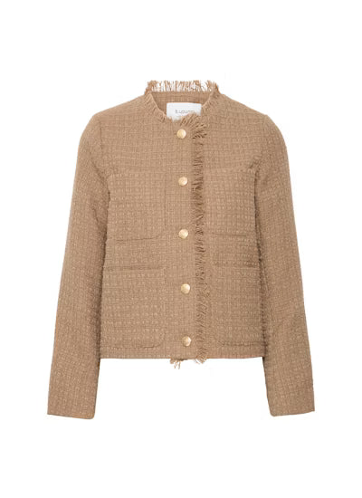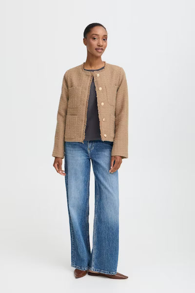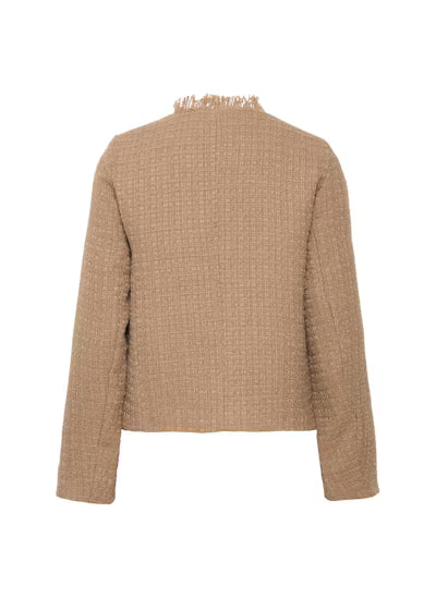 This tweed camel blazer is a timeless layering piece that blends sophistication with modern versatility. Crafted in a warm camel tweed, it offers a textured finish that feels both polished and approachable. The blazer is cut in a tailored silhouette with structured shoulders, a notched lapel, and classic button closure with fringe detail, giving it a sharp yet wearable shape. Front patch pockets add a refined detail, while the length provides just enough coverage to make it flattering over trousers, skirts, or dresses. This blazer easily transitions from office-ready styling with tailored pants to off-duty chic when layered over denim or even draped casually over a slip dress.