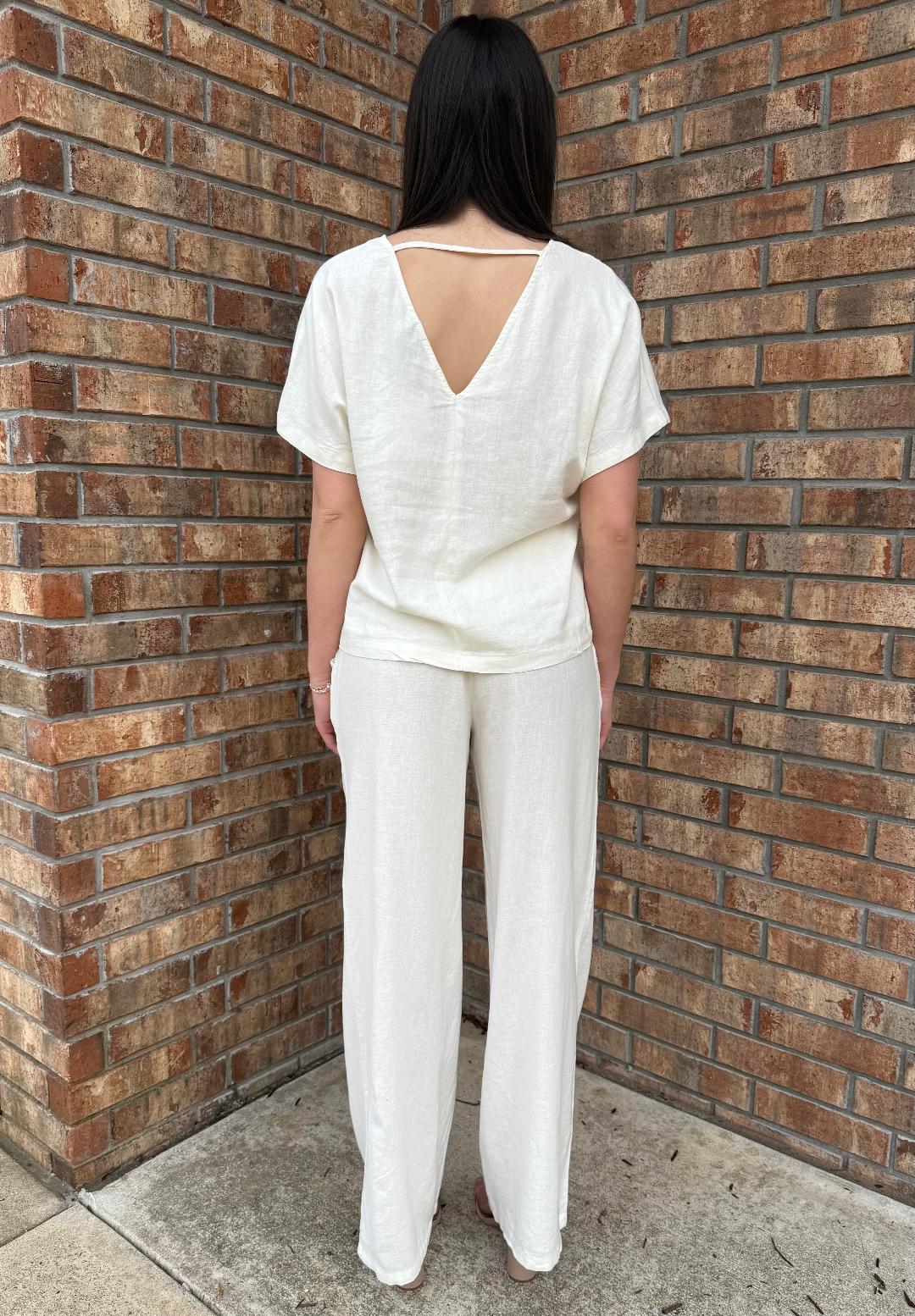 Perfect for warm weather and effortless style, this cream wide/straight leg pant features an elastic waistline and pockets, combining comfort with easy elegance. Lightweight and breathable - ideal for summer days, travel or casual outings. This pant will give you lots of styling options but we love it with the matching Cream Linen Blend V-Neck Top.
