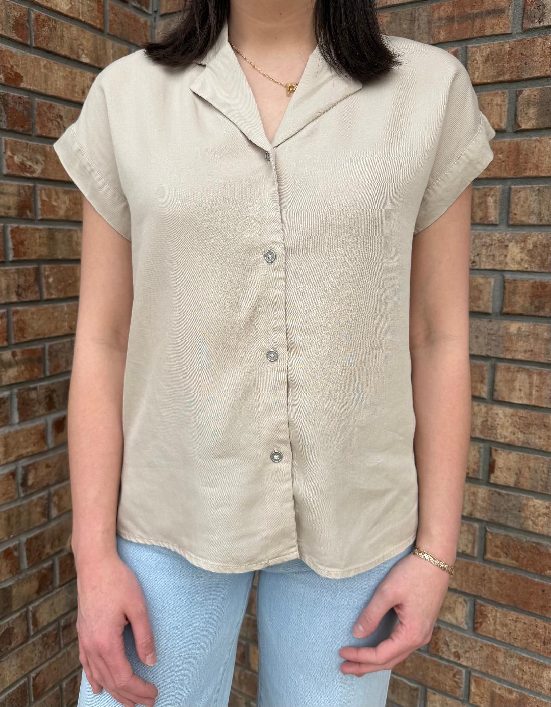 Timeless pieces like this are essential for your wardrobe. This notched lapel button up shirt is made in a smooth, soft lyocell fabric and the neutral go-with-anything khaki color gives versatility.