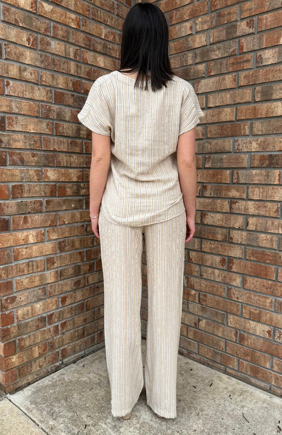 Relaxed yet polished. The earthy khaki, white and black stripes are figure flattering and elongating in this vertical pattern. Comfortable, breathable linen/viscose fabric with an elastic waist and the side pockets add practicality without compromising the clean, chic look. Pair with the matching top and sandals for a laid back vibe or elevate it with wedges and jewelry.