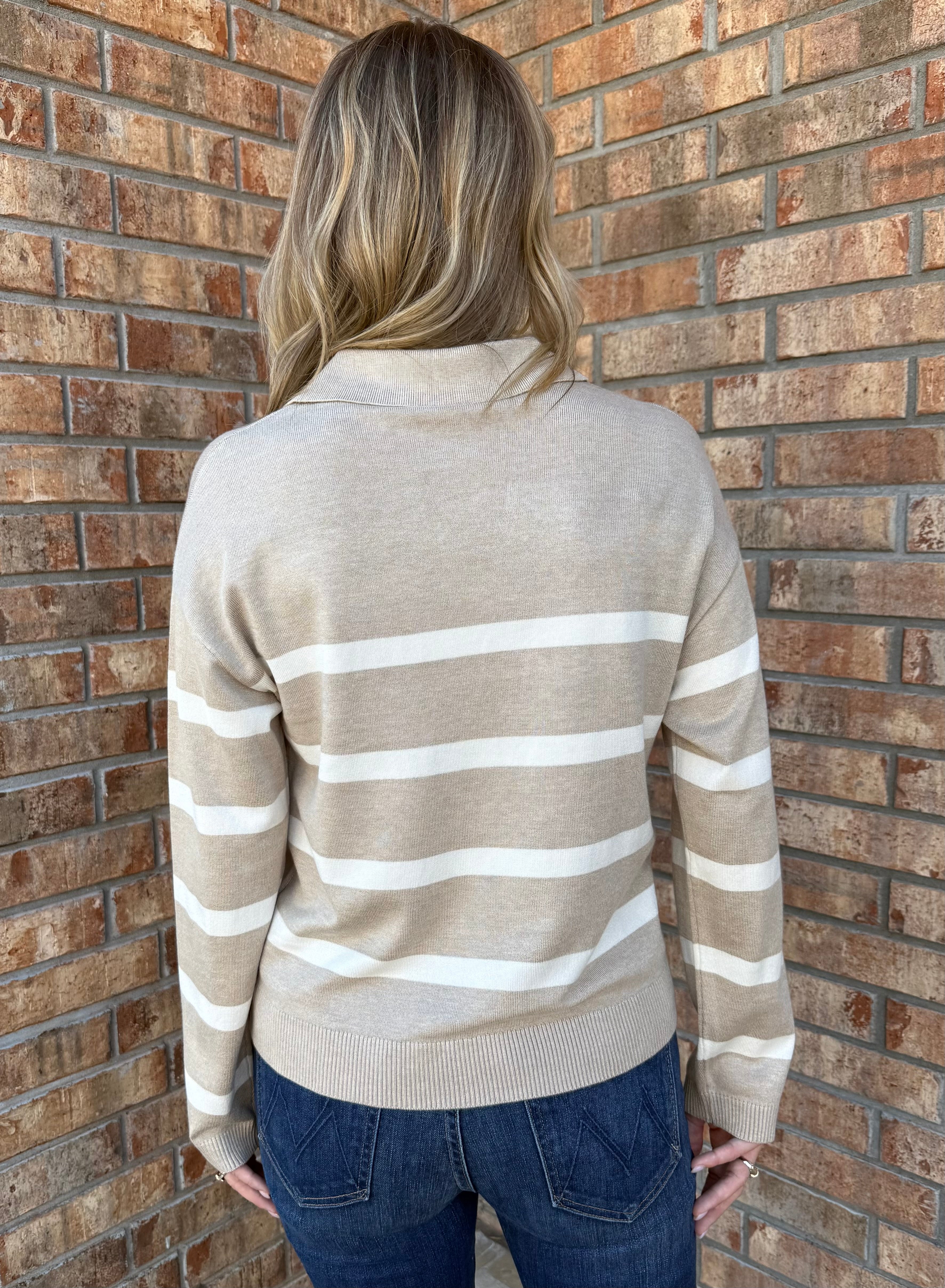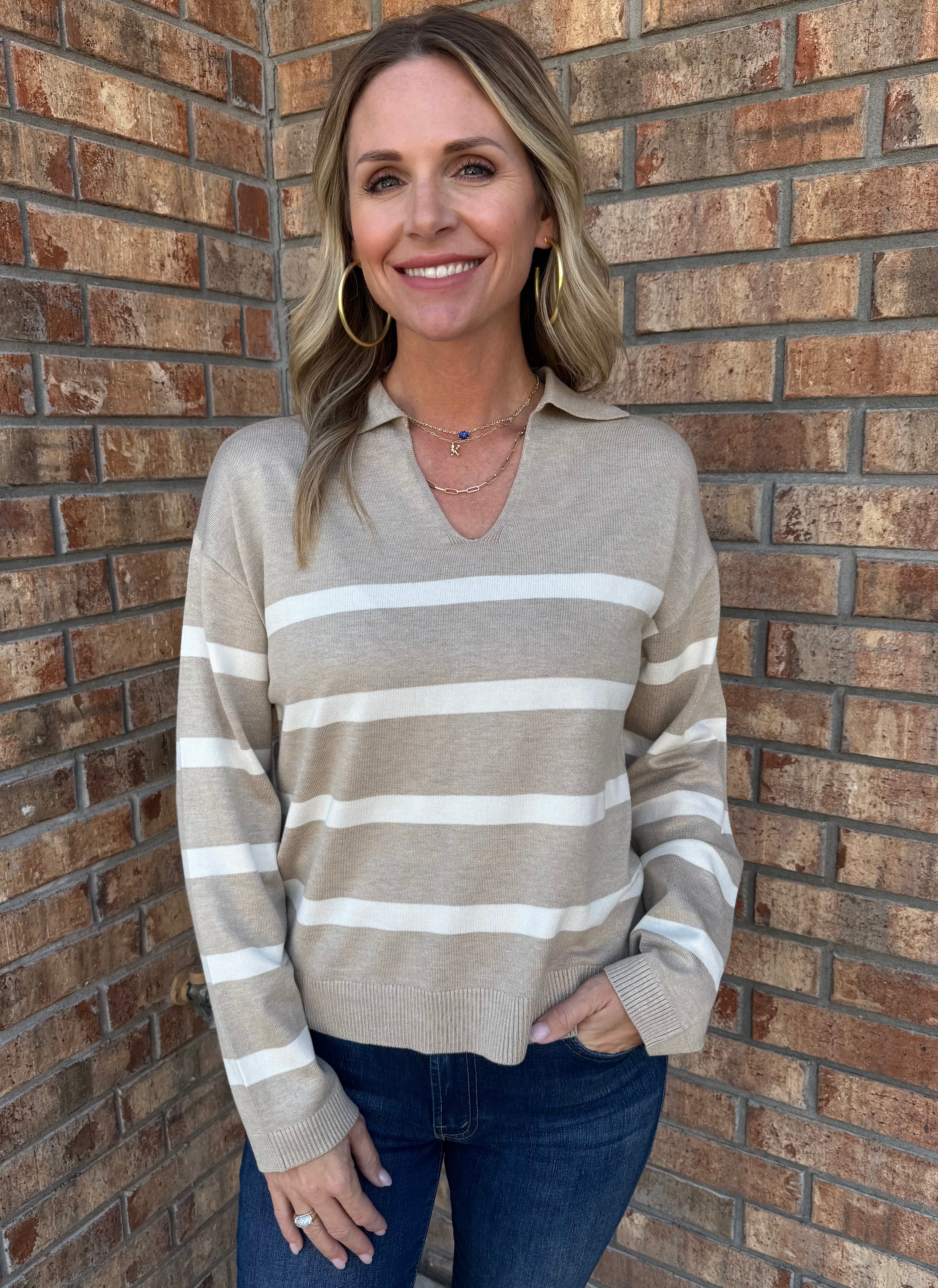 Crafted in a soft, lightweight knit, this sweater features wide horizontal stripes in a neutral beige and ivory palette, making it versatile for year-round wear. The relaxed silhouette is elevated by a polished open polo collar with a V-neckline, striking the perfect balance between casual ease and refined style. Long sleeves with ribbed cuffs and hemline give it a cozy finish, while the drop-shoulder design adds to its laid-back appeal. Perfect for pairing with denim, shorts, tailored trousers, or layered under a blazer, this sweater is an effortless wardrobe staple that transitions seamlessly from work to weekend.