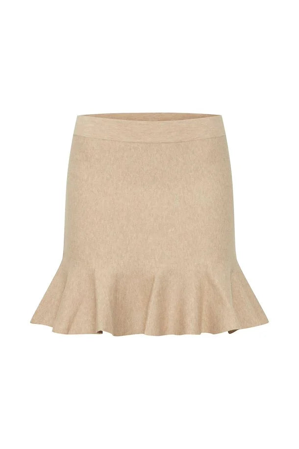Super soft, tightly woven, medium weight knit sweater skirt with a flouncy hem. Elastic waistband and stretchy knit fabric makes this skirt comfortable while the neutral beige color can be styled with endless options.