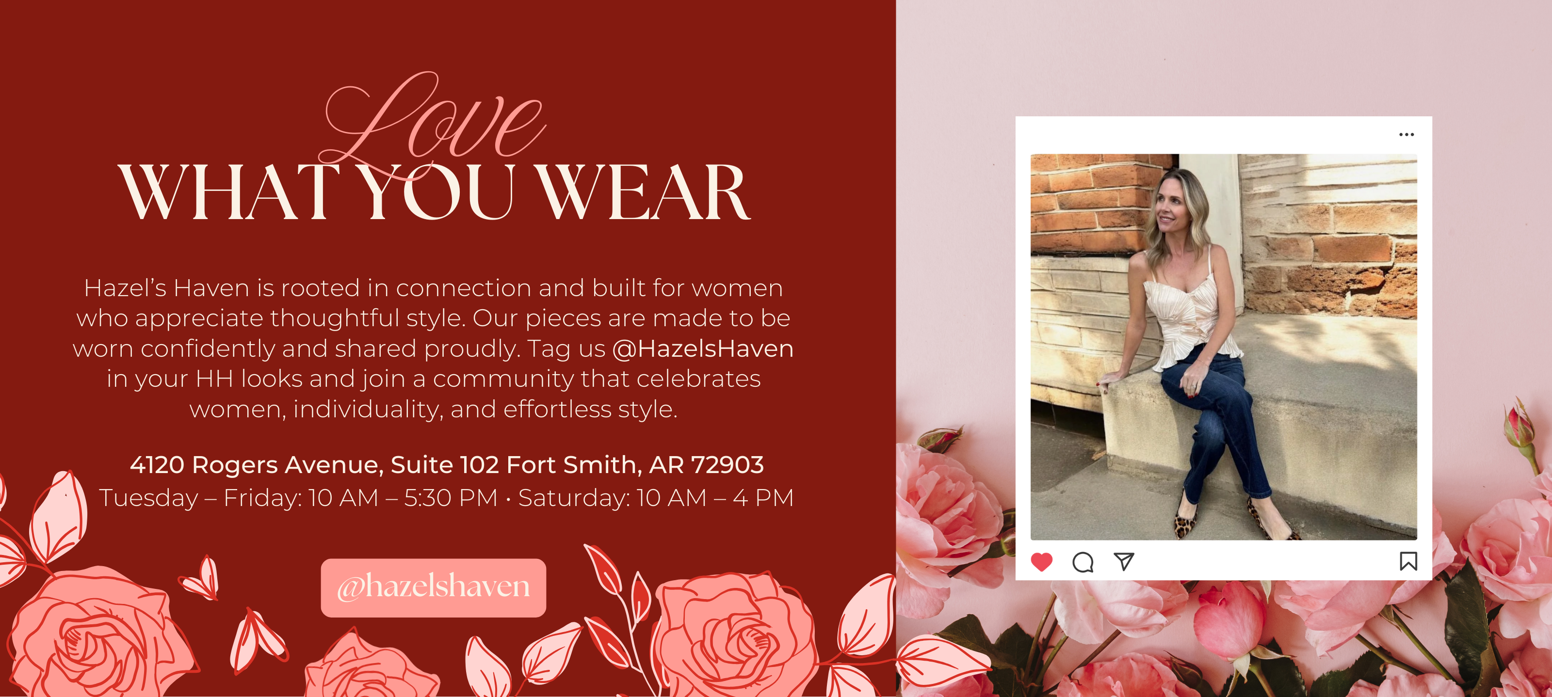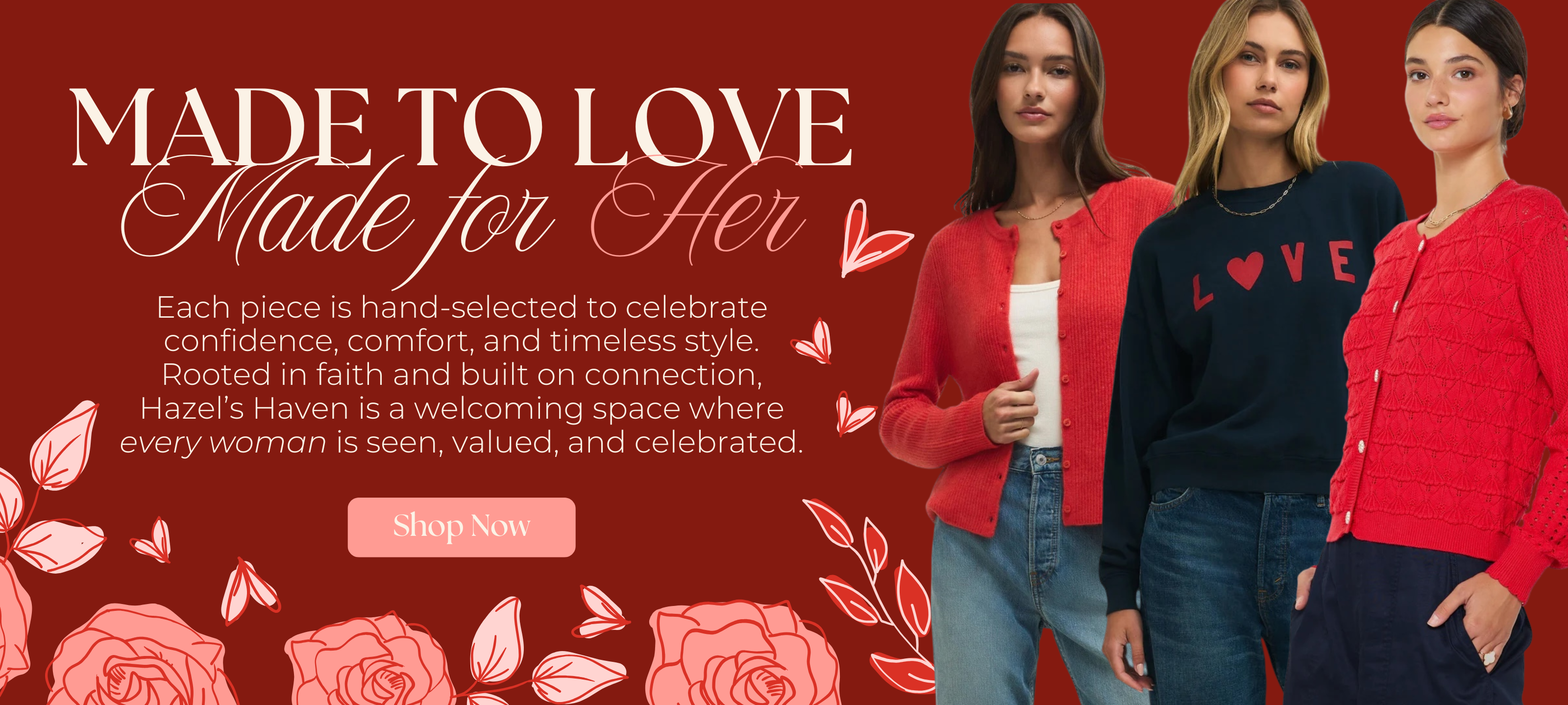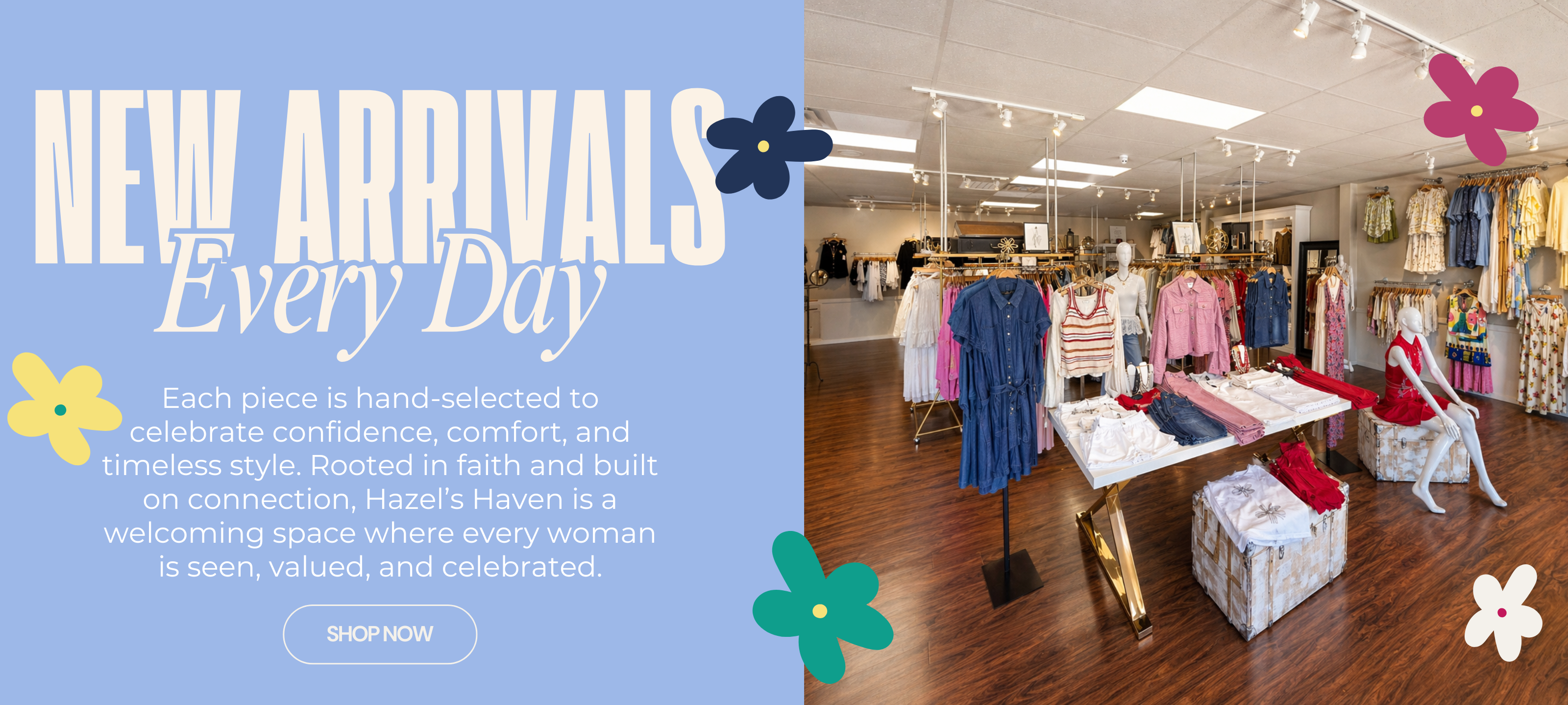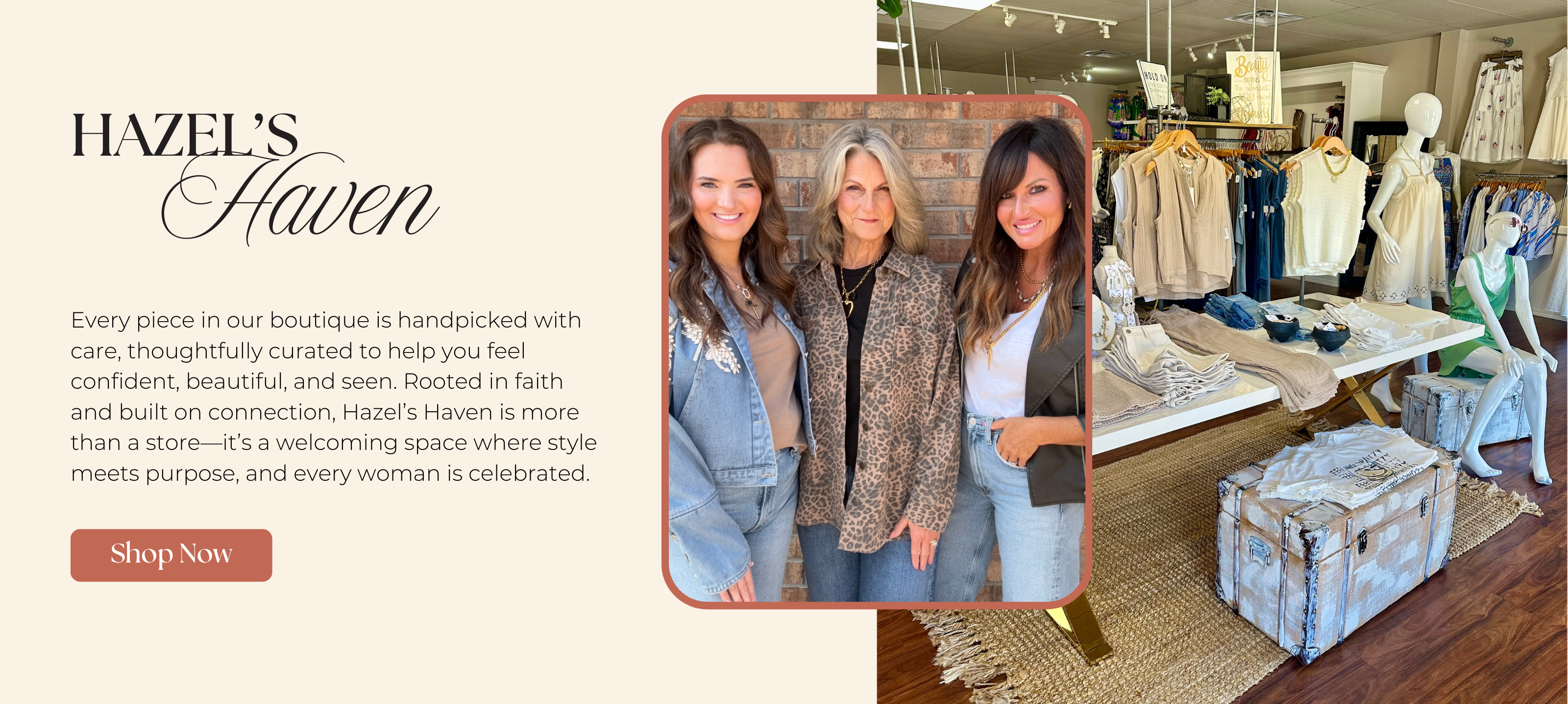 As a woman- and family-owned business, Hazel’s Haven takes pride in offering high-quality products at affordable prices. We believe that every woman deserves to feel radiant in her own skin, whether you’re at the office, running every day errands, or at a special event. We're here to help you achieve that perfect look for your style. Our knowledgeable staff is always available to offer personalized styling advice and answer any questions you may have. Let us help you find a gift or build a wardrobe that honors who you are, inside and out.