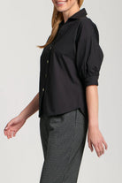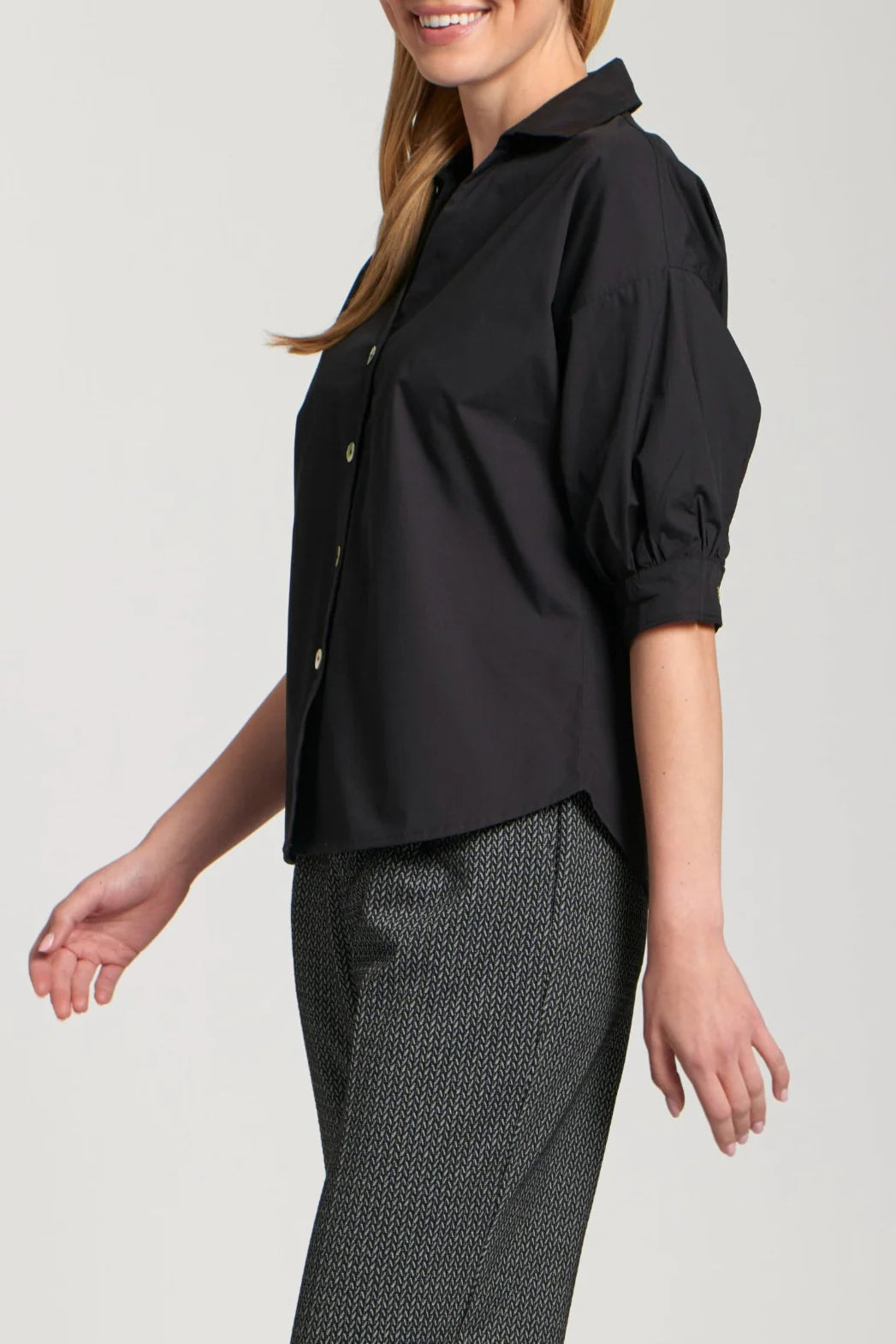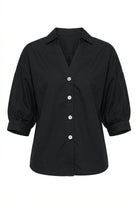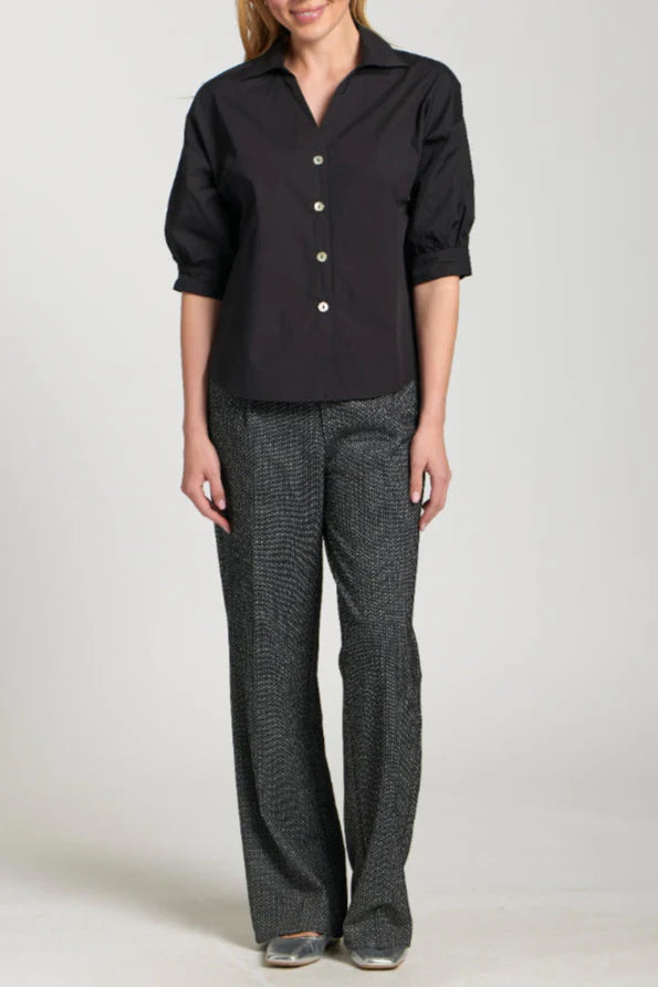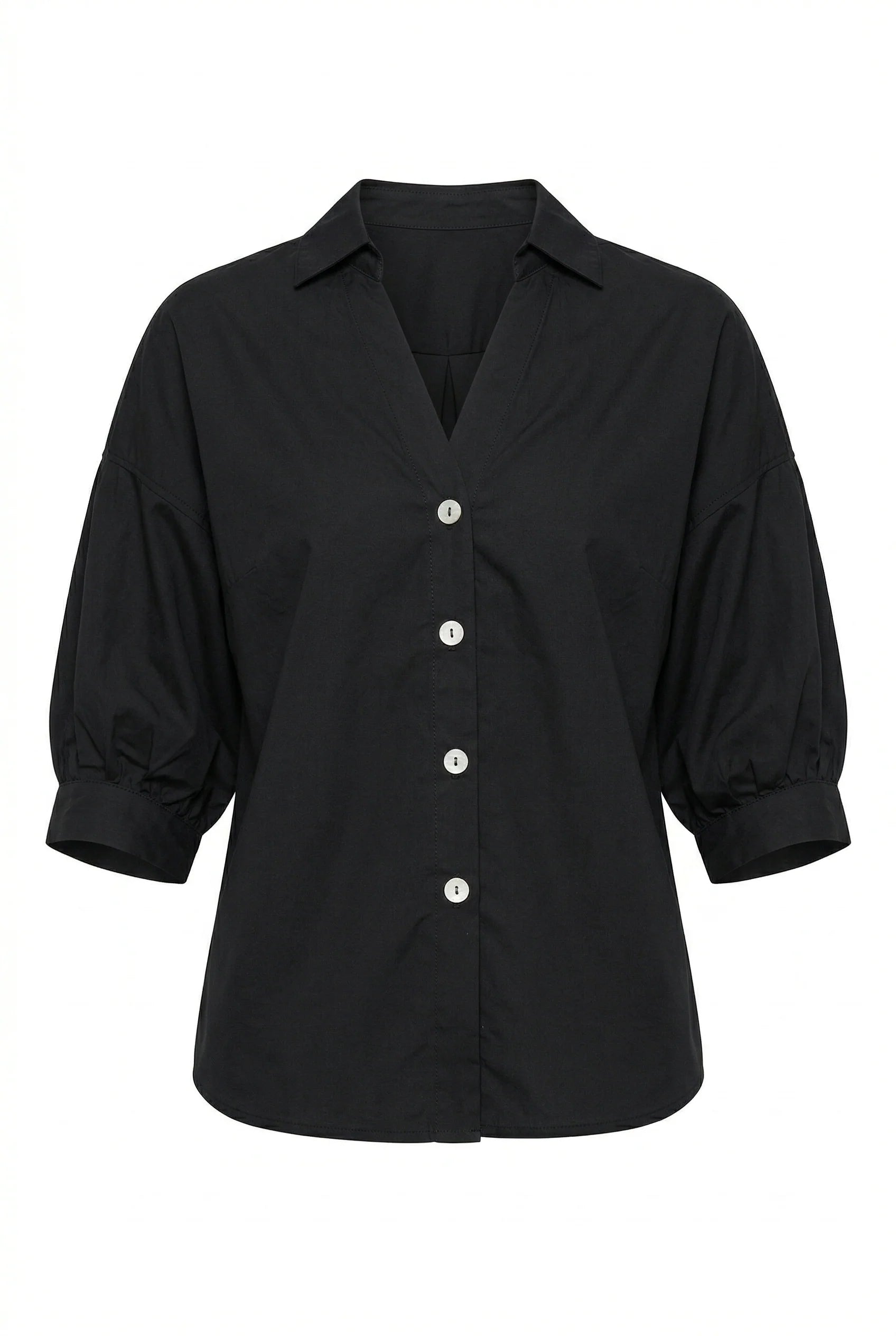 A polished black blouse crafted from lightweight cotton blend with a clean, structured feel. Designed with a relaxed silhouette, it features a soft collar, a subtle V neckline, and voluminous blouson sleeves finished with cuffed detailing. The front is accented with pearlized shell buttons that add a refined touch of contrast and understated shine. Effortless yet elevated, it’s the perfect piece to take you from work to weekend with ease. A closet essential!