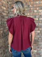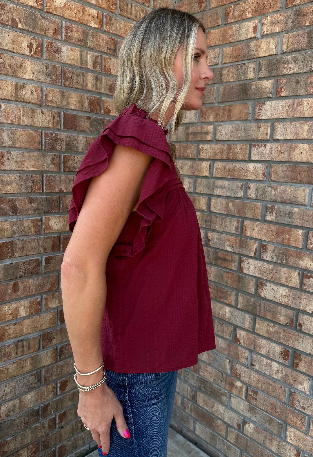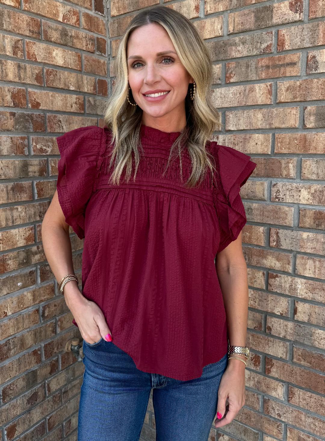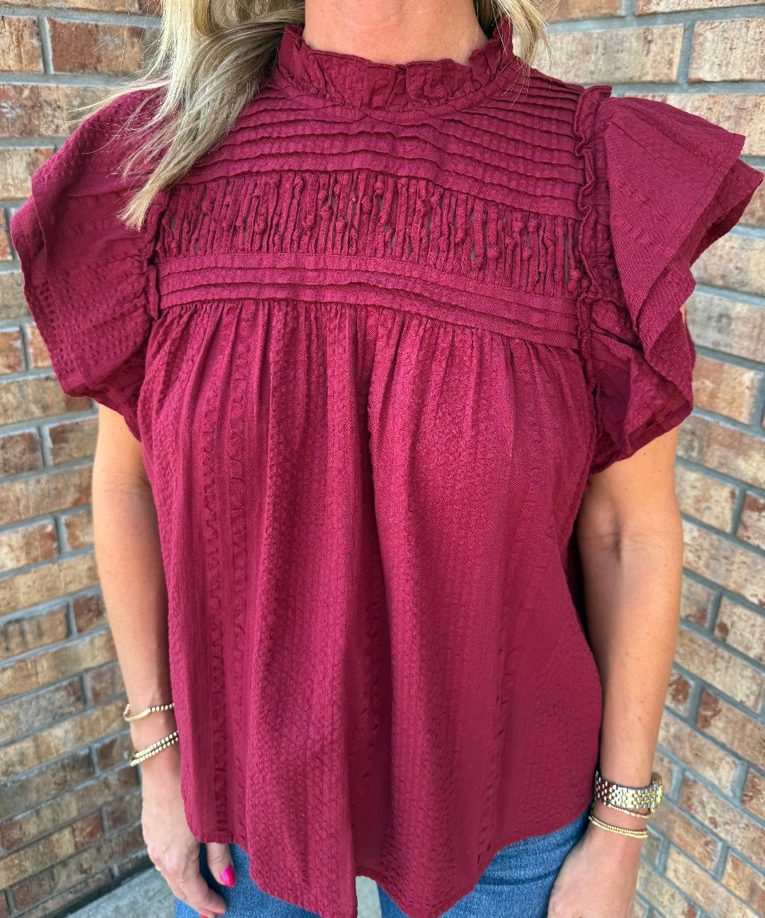 Elevate your everyday look with the Bordeaux Flutter Top, a rich burgundy blouse that blends timeless charm with modern flair. Designed with delicate pintuck pleating across the chest and a subtle textured jacquard fabric, it adds depth and dimension to this effortlessly chic piece. The flutter sleeves bring a feminine touch while the ruffled mock neck offers a polished finish. Lightweight with an easy, relaxed fit, this top pairs perfectly with denim for casual outings or can be dressed up with tailored pants or a skirt for an evening look. A versatile must-have for all seasons.