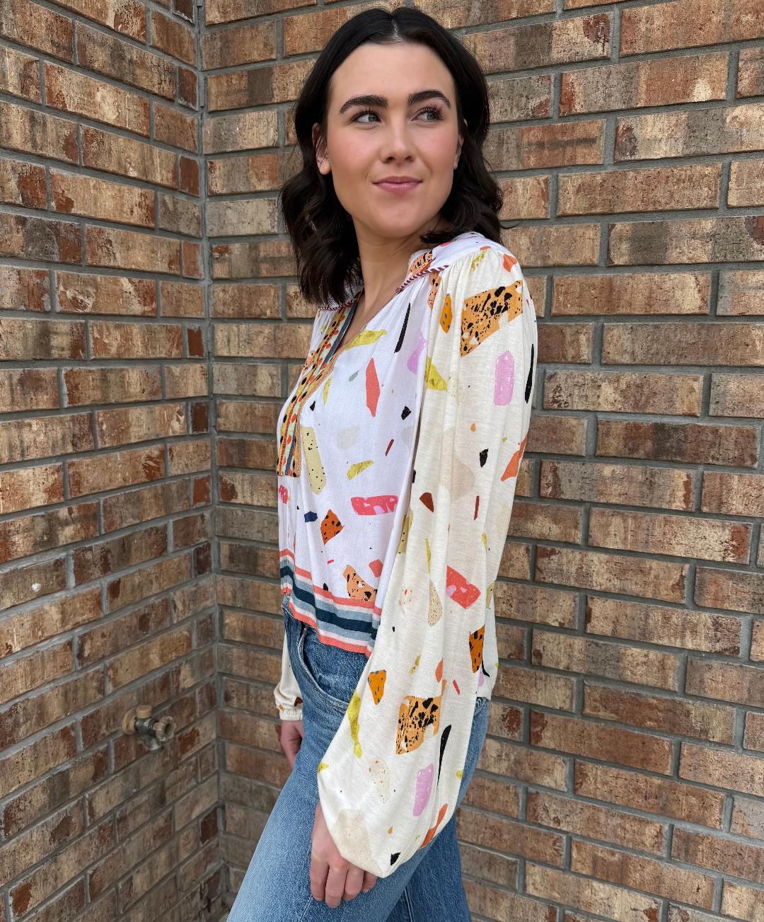 Need a new, super unique top? Add this one to your collection - it won't disappoint! A colorful abstract print with heavy embroidery on the neckline. Style with any of your favorite bottoms.