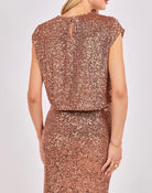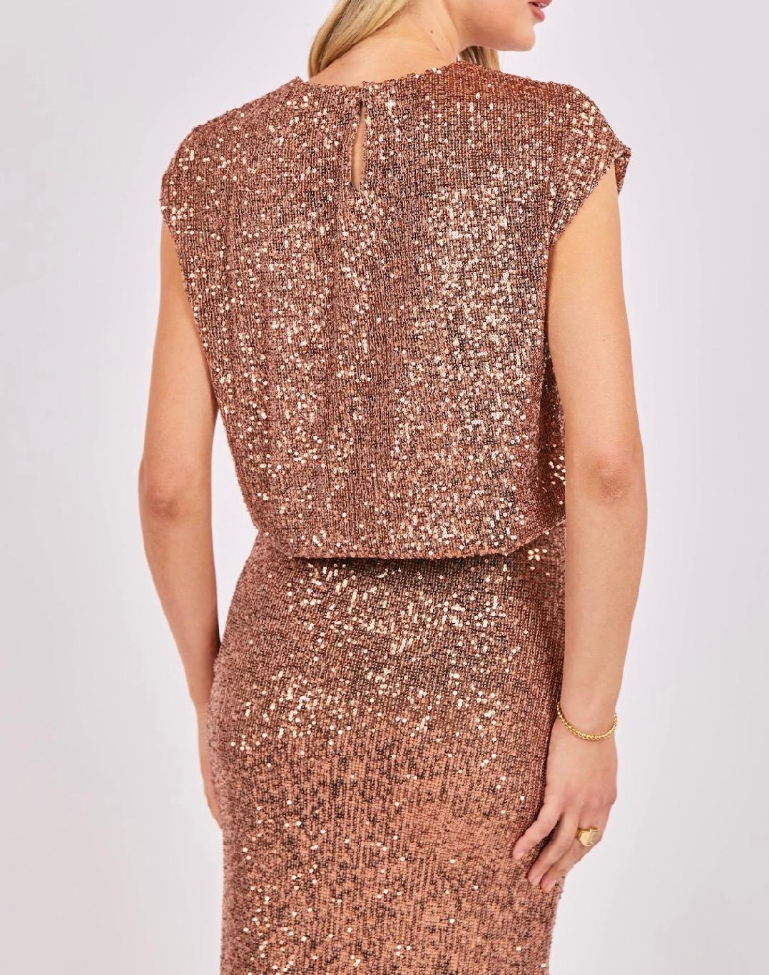 This top is a shimmering copper sequin dream—glamorous, modern, and perfect for any festive occasion. Fully embellished with tiny sequins that catch the light beautifully, it features a relaxed, boxy silhouette that pairs effortlessly with its matching skirt or can be styled on its own with denim for a more understated sparkle moment. The cap sleeves add a soft, feminine touch, while the round neckline keeps the look clean and polished. A small keyhole closure at the back offers easy wear and a touch of elegance. Whether worn as a full set or mixed with denim, trousers, or faux leather, this top brings instant holiday-ready shine.