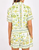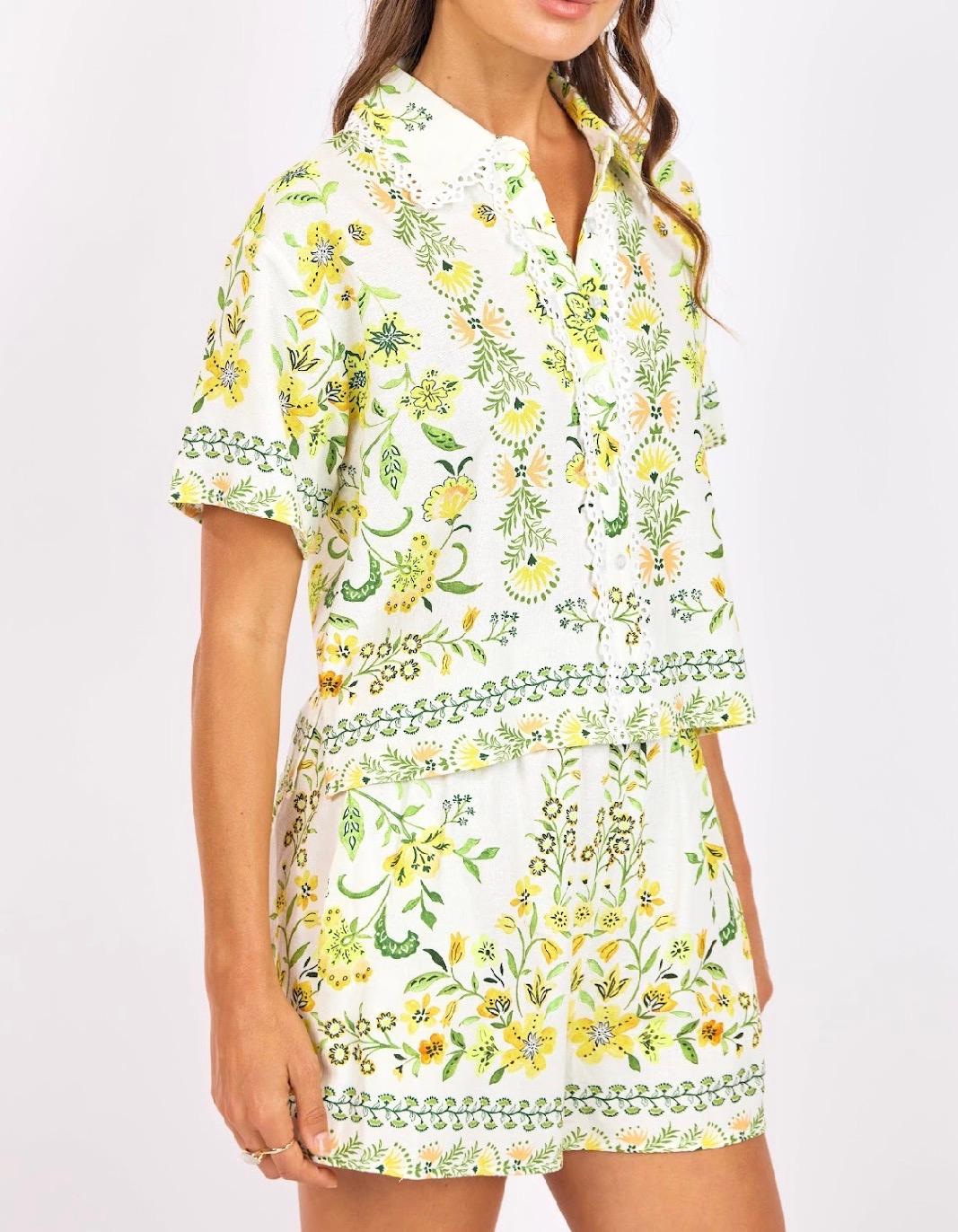 A fresh, feminine take on a classic button-up, this floral blouse features a soft ivory base with delicate yellow and green botanical print throughout. Designed with a relaxed silhouette, it’s finished with a collared neckline and intricate lace trim detailing along the placket and collar for an elevated, vintage-inspired touch. The short sleeves and lightweight rayon-linen-cotton blend make it breathable and easy to wear, whether styled as a set with the matching shorts or paired back to denim for a polished, everyday look.