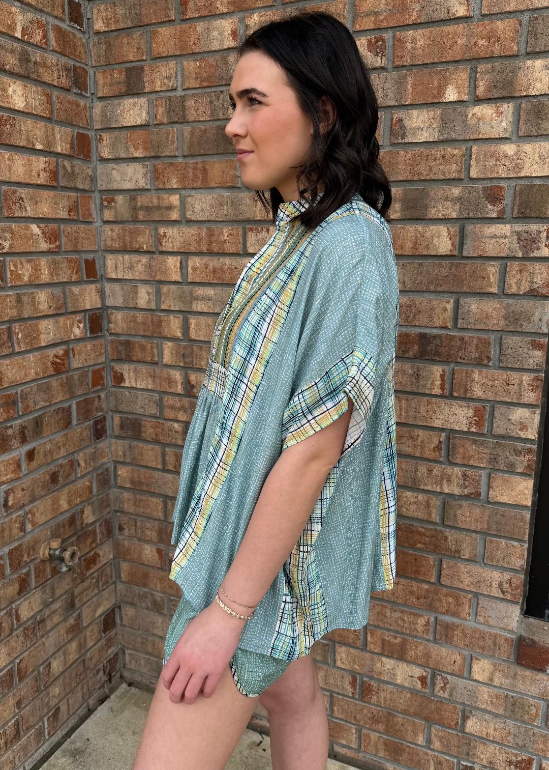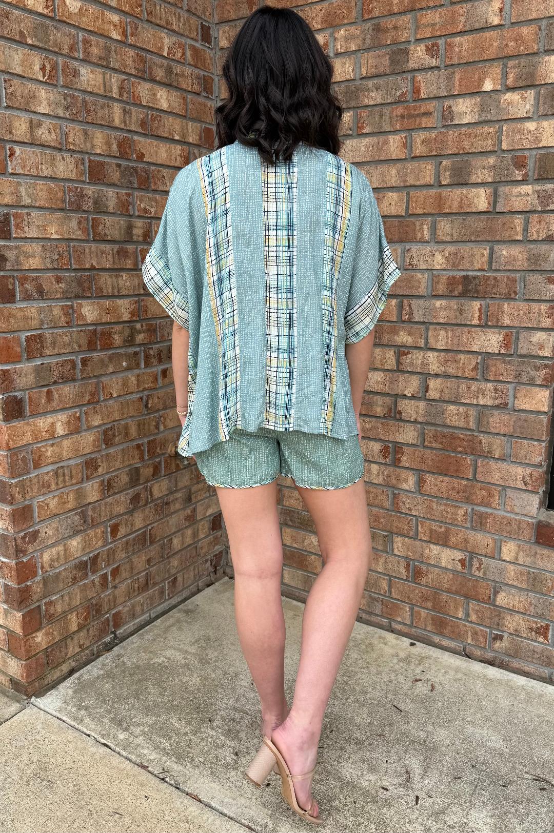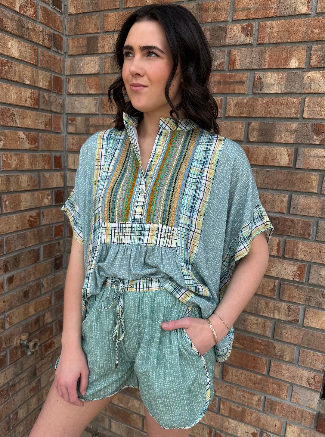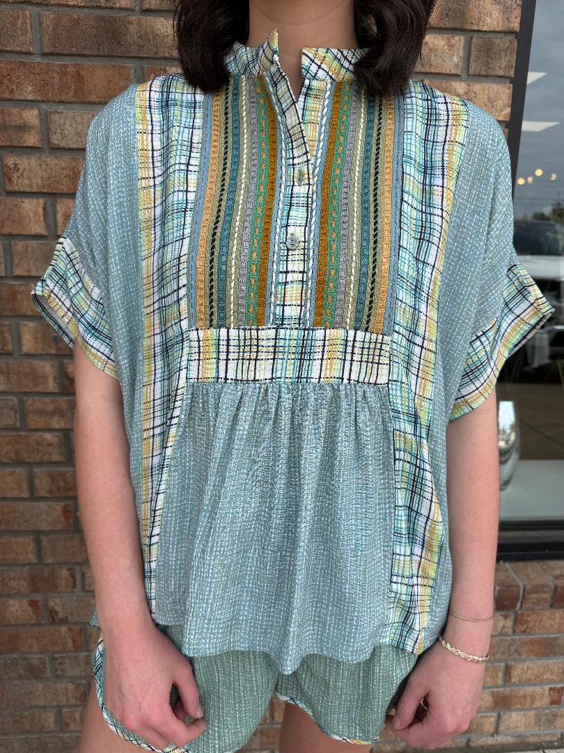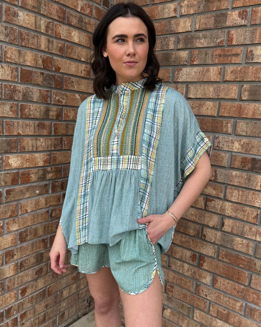 This one size kaftan style top stands out with its unique plaid prints and embroidery on the chest by the button placket. For a complete matching set, get the Vladana Shorts or change it up by styling it back to your favorite jeans.