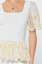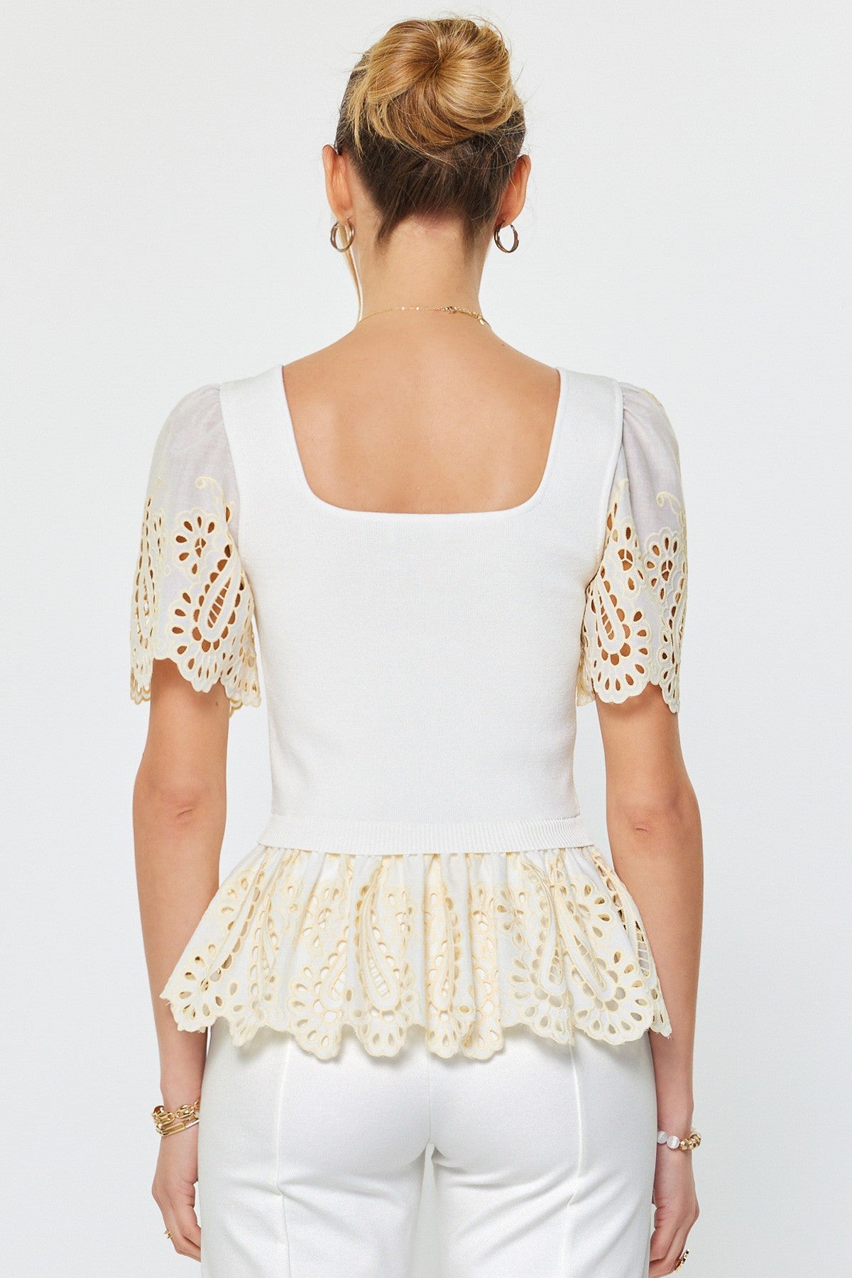 A beautifully crafted mixed-media top featuring a soft, stretch knit bodice paired with delicate embroidered woven details. The fitted upper body offers a smooth, flattering silhouette, while the square neckline adds a clean, modern touch. Statement puff sleeves are designed in a sheer woven fabric with intricate eyelet embroidery, giving it that feminine, airy feel. The look is finished with a scalloped embroidered peplum hem that adds movement and a romantic, polished finish.