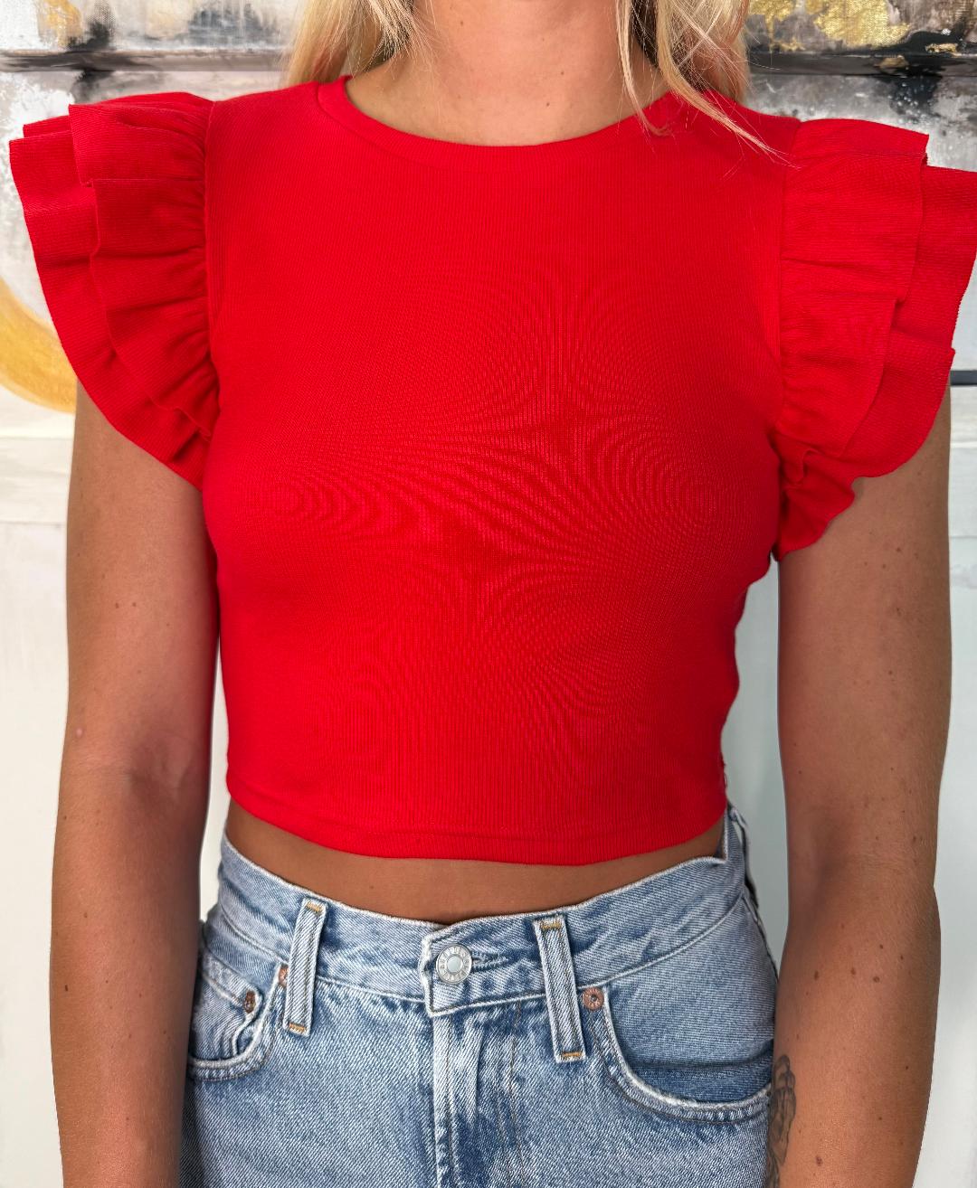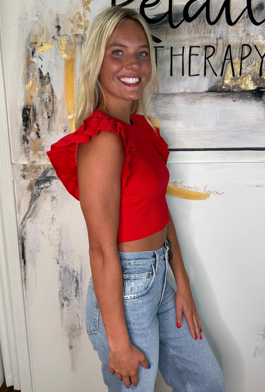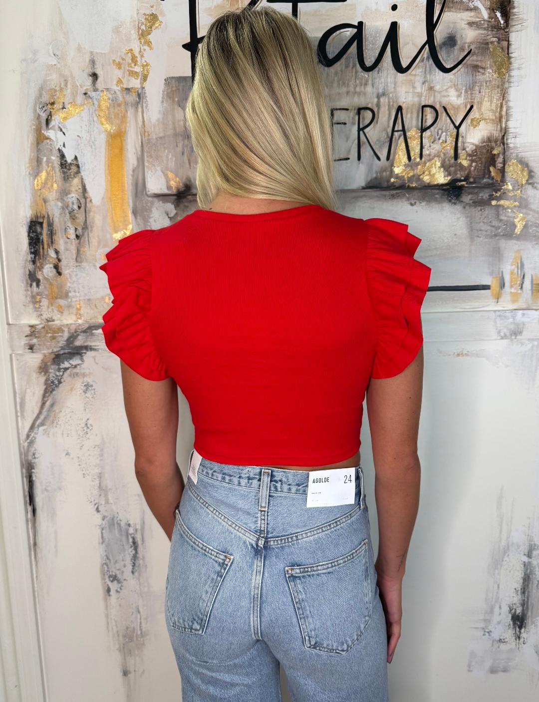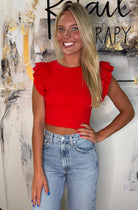 Bring the heat in the Firecracker Ruffle Crop, a bold red top that’s as fun as it is flattering. The ribbed knit hugs your figure just right, while the playful layered ruffle sleeves add a flirty twist. Cropped and confident, this one pairs perfectly with high-rise denim for an effortlessly cool game day look.