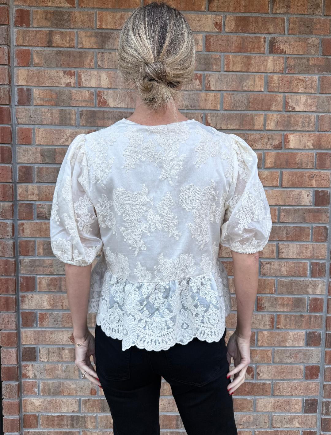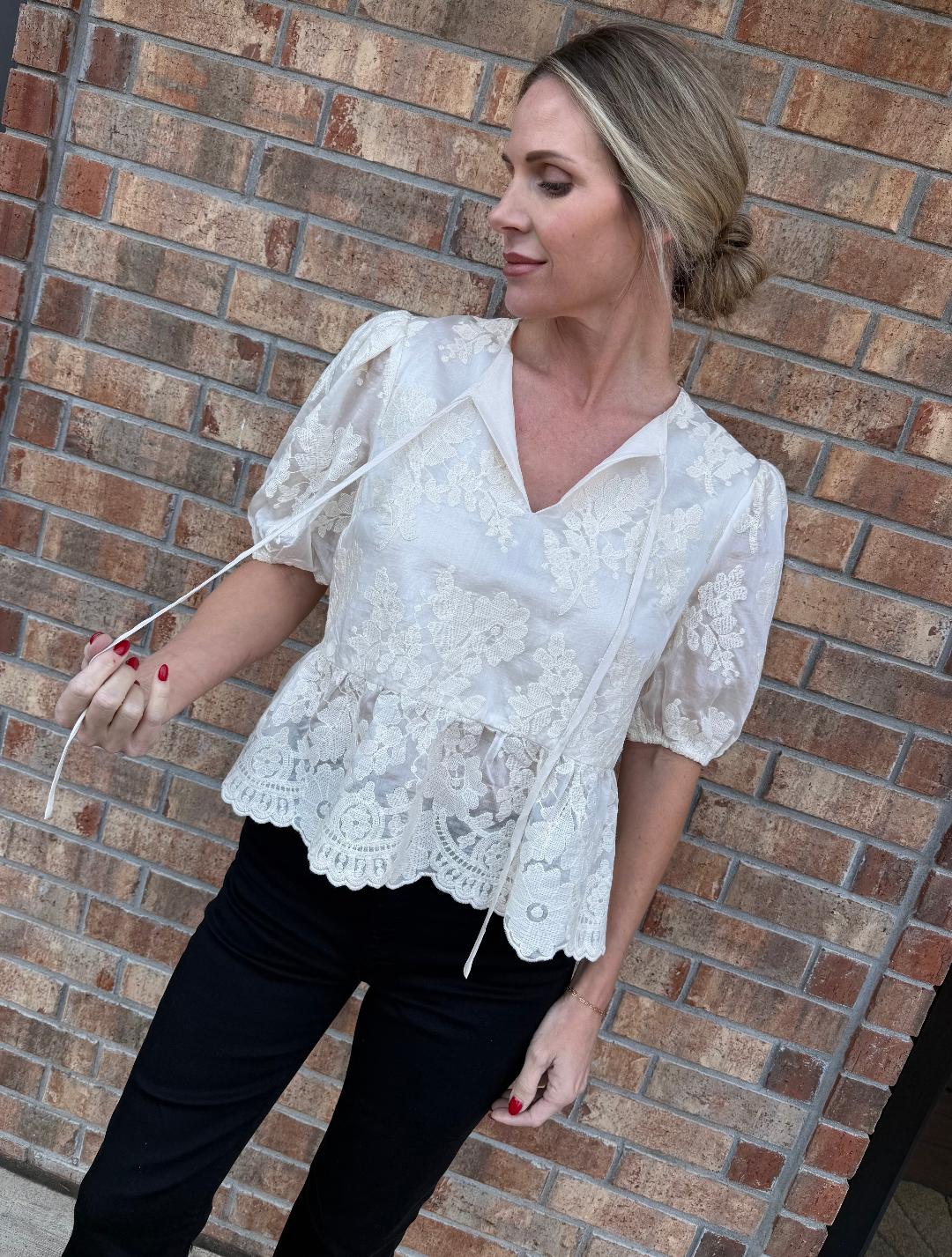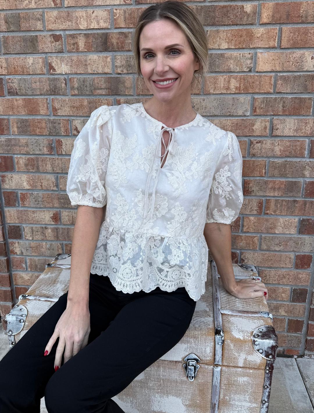 Romantic and timeless, this ivory peplum blouse is crafted from delicate embroidered fabric with a soft, airy feel. The subtle floral embroidery adds beautiful texture throughout, while the flattering peplum silhouette creates gentle shape without feeling fussy. Designed with short puff sleeves for a feminine touch and a tie-front neckline that can be worn loosely open or softly cinched. Finished with a scalloped lace hem that adds vintage-inspired charm, this blouse pairs effortlessly with denim, tailored pants, or a skirt for an elevated everyday look or a special occasion moment.