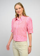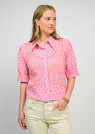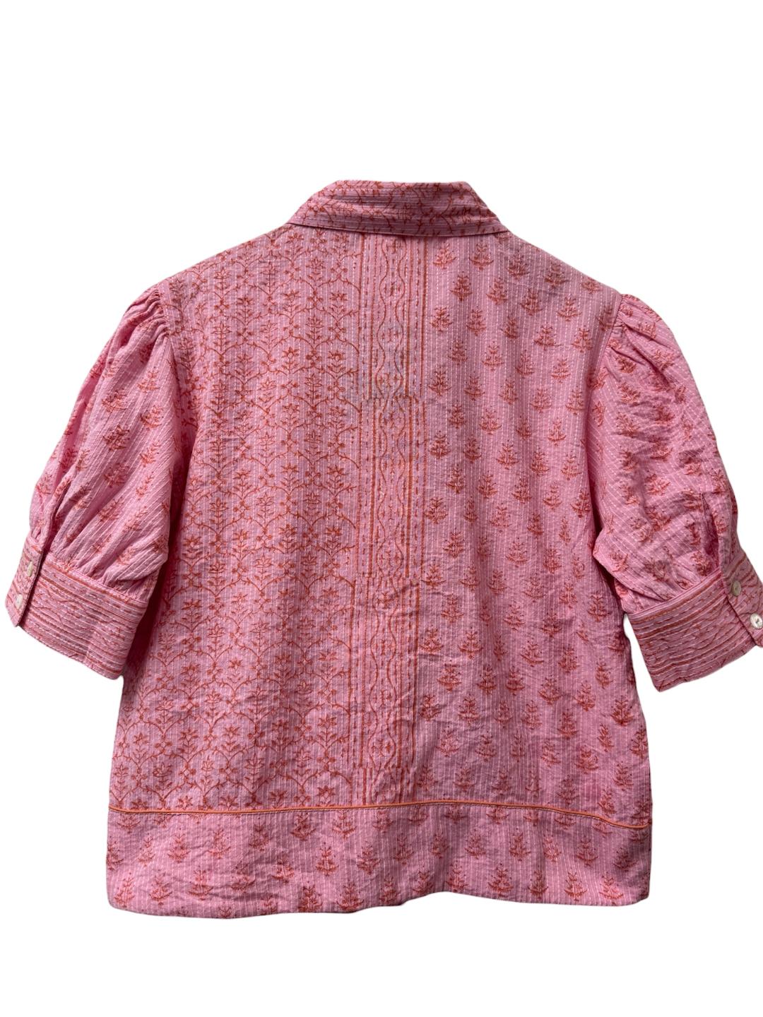 A beautifully detailed top that blends artisanal texture with an easy, polished silhouette. Designed in a soft pink base with orange stamped print throughout, this piece features delicate white vertical stitching lines that add subtle dimension and a handcrafted feel. The collared neckline and button-front closure give it a classic structure, while the slightly puffed short sleeves with banded cuffs bring a feminine touch. The body has a gently tailored shape that flatters without feeling restrictive. The back mirrors the intricate patterning with the same mix of stamped print and vertical stitching, creating a cohesive, elevated look from every angle. Perfect styled with denim or light neutrals for an effortlessly put-together outfit.