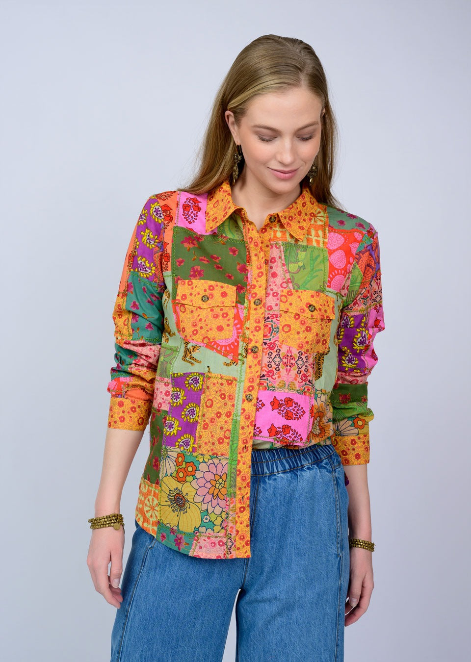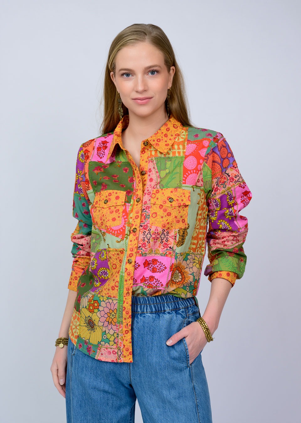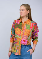 This top is a vibrant patchwork camp shirt that radiates retro charm with a modern twist. Designed in a button-front silhouette with a classic collar, it features a lively mix of colorful prints—florals, paisleys, and geometric motifs—in bold shades of pink, orange, green, yellow, and purple. The long sleeves can be worn full length or casually rolled up, giving it versatility for styling. Front flap pockets add a touch of utility, while the relaxed fit keeps it easy and comfortable. The patchwork design makes it a true statement piece, perfect for pairing with denim or layering over basics for a standout look. It has a playful boho-meets-70s vibe, making it ideal for anyone who loves bold, eclectic style.
