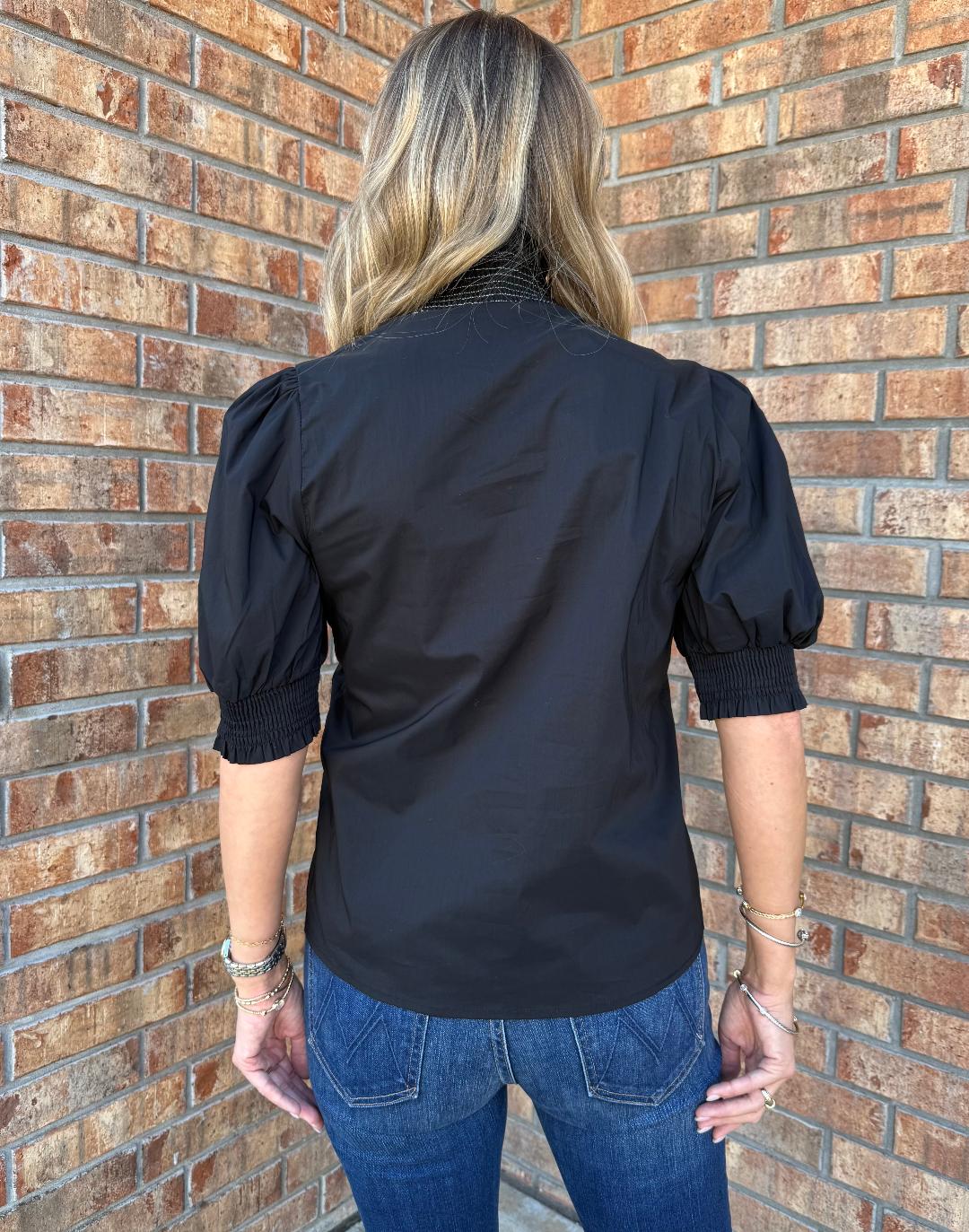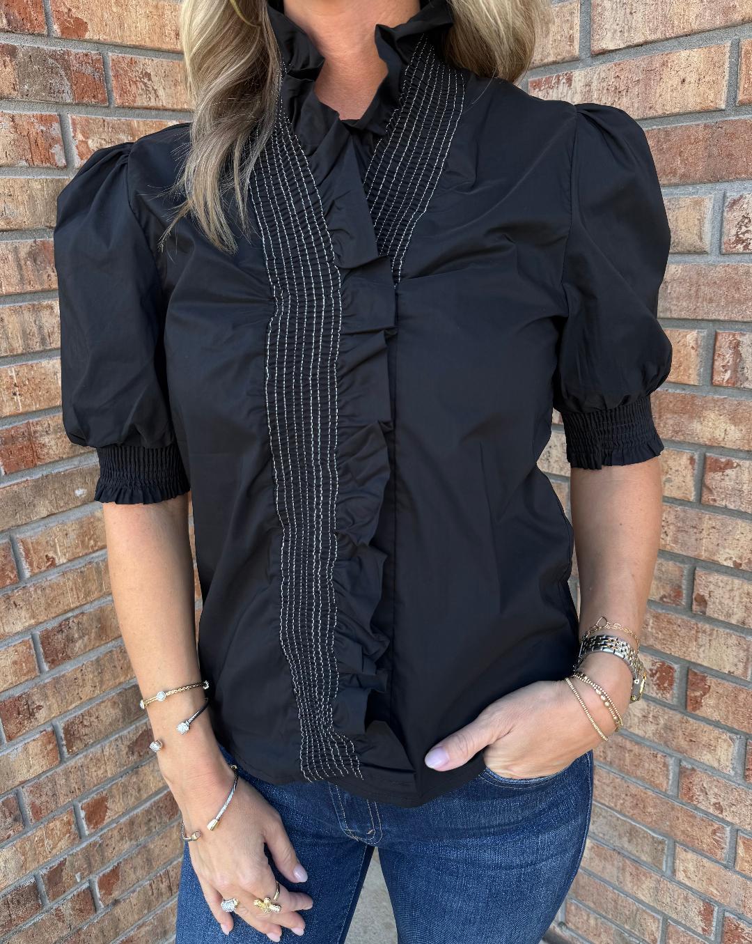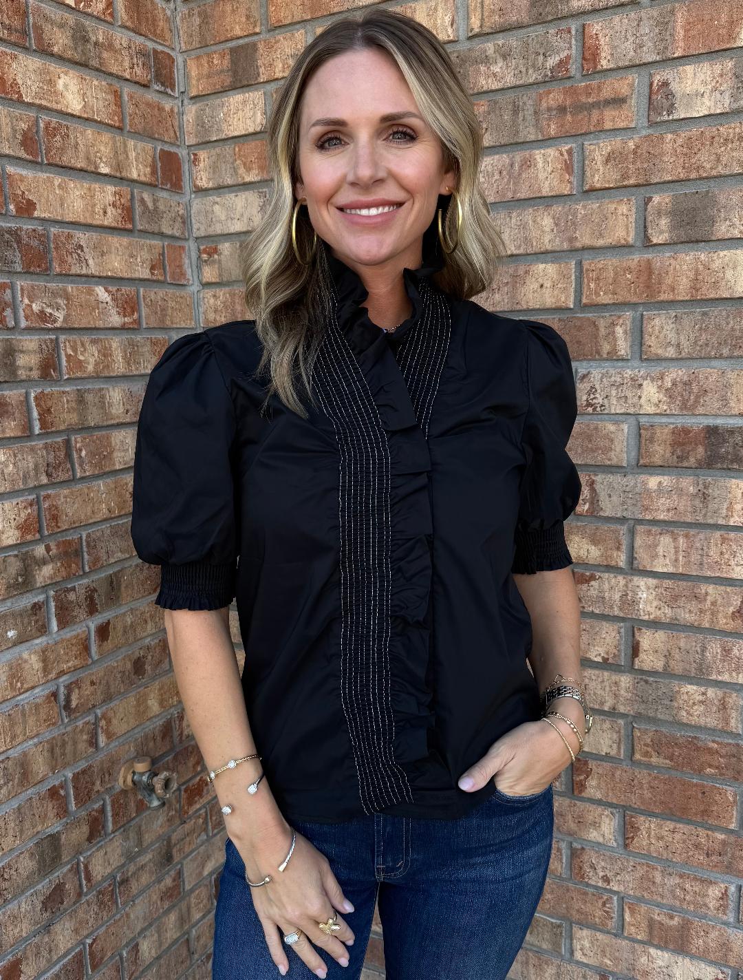 This polished black blouse adds a feminine twist to a classic silhouette. Designed with puff sleeves finished in smocked cuffs, it features a ruffled high neckline and cascading front placket detail. The hidden three-button closure sits neatly beneath the ruffle trim, keeping the look sleek and elevated. Lightweight yet structured, this top pairs beautifully with denim for casual chic or tailored trousers for a more refined outfit. A versatile piece that transitions effortlessly from office hours to evening plans.