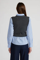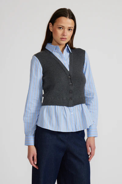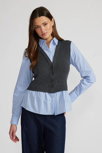 This top is designed to give the effortless look of layered pieces in one. It features a heather charcoal gray knit vest with a button-front detail, styled over a crisp collared shirt in a blue, white, gray and subtle orange stripe pattern. The shirt has long sleeves with button cuffs and a relaxed, slightly flared hem, while the vest adds structure with its ribbed finish and cropped cut. The combination creates a polished, pre-layered look that feels modern and easy to wear, perfect for styling with denim, skirts, or tailored trousers for the office and beyond.