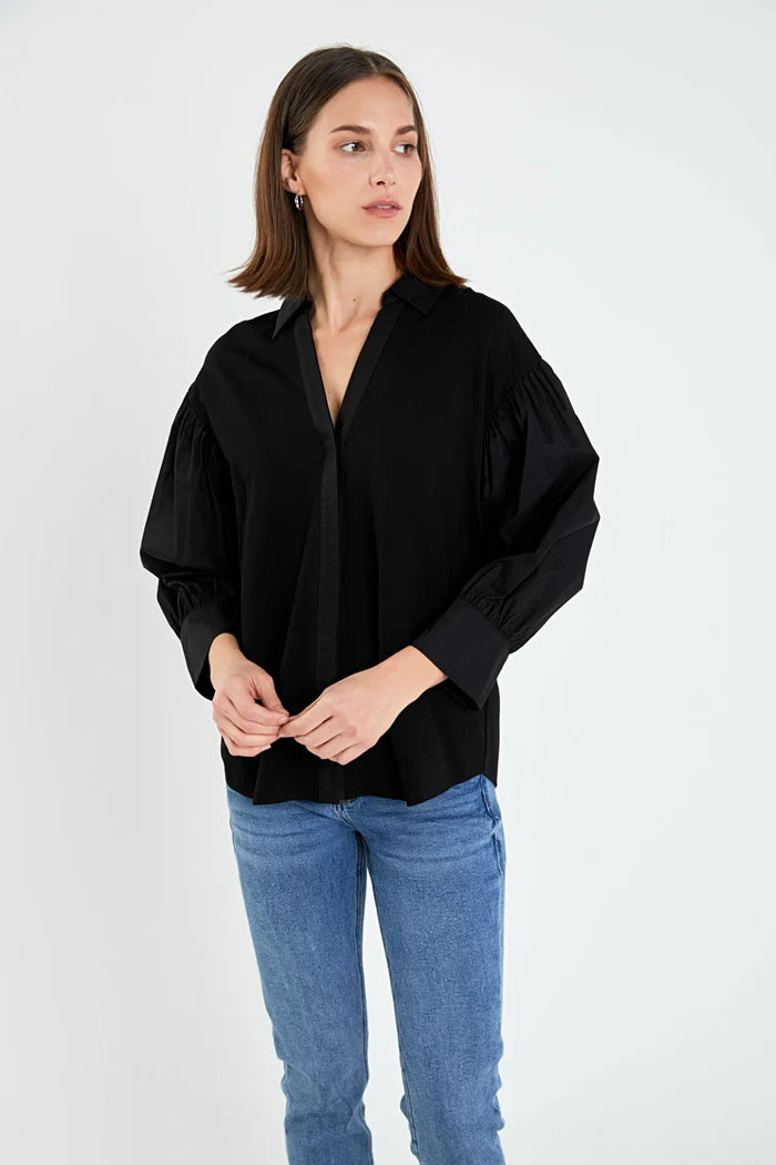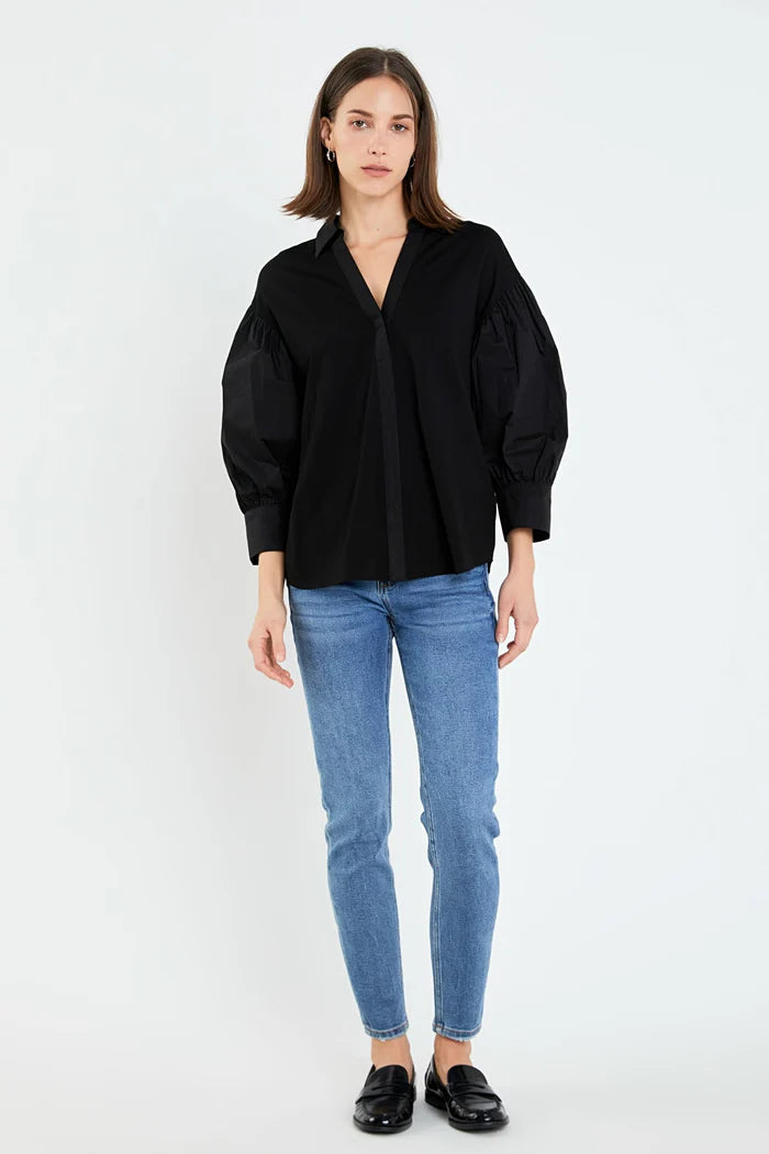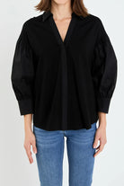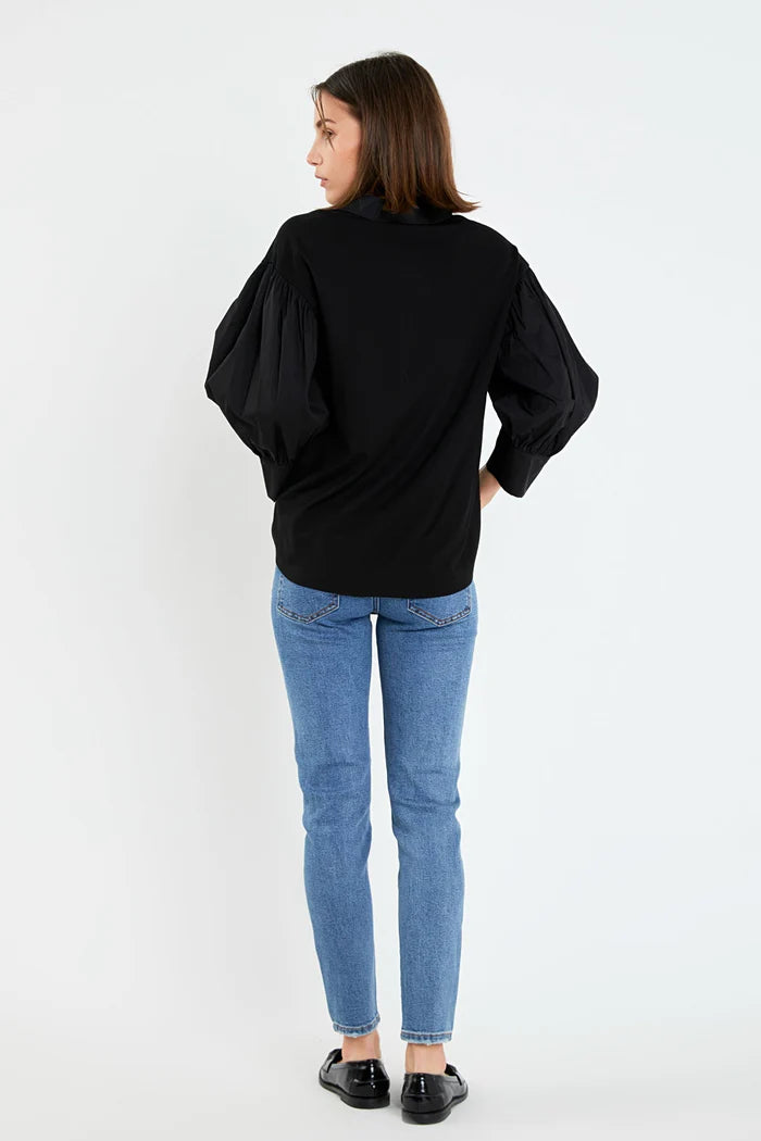 Effortlessly chic, this black mixed media top blends casual comfort with elevated style. The smooth, tailored body contrasts beautifully with dramatic puff sleeves crafted from crisp, structured fabric, adding volume and a touch of edge. A sharp collar frames the V-neckline, while the relaxed silhouette makes it perfect for tucking into jeans or pairing with sleek trousers. A versatile statement piece that transitions seamlessly from office to evening.