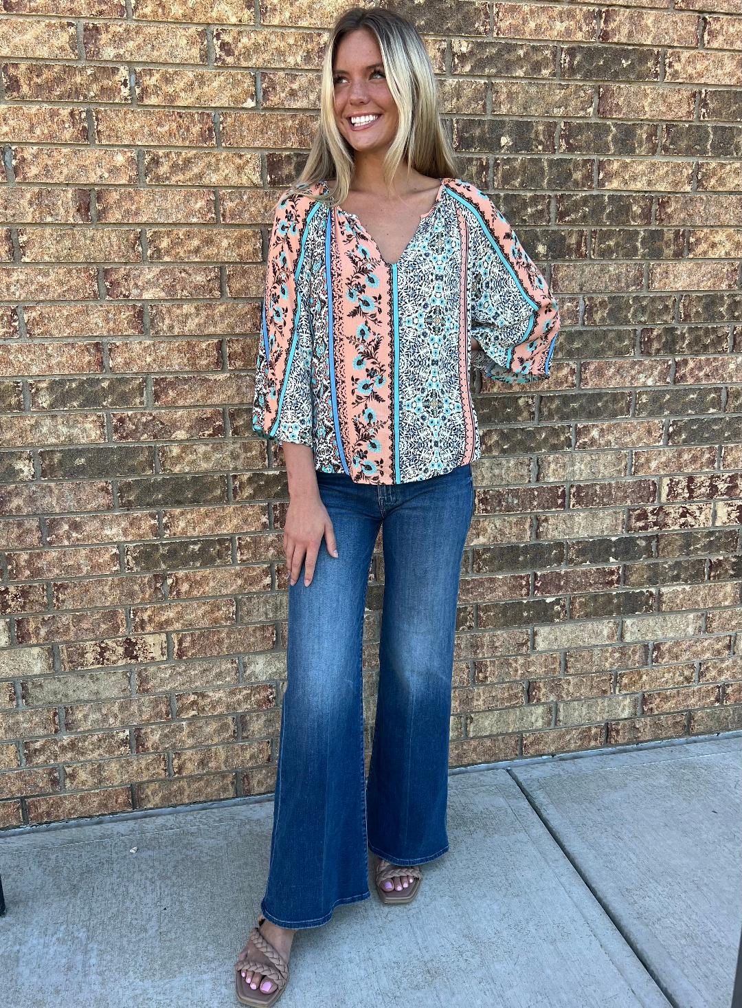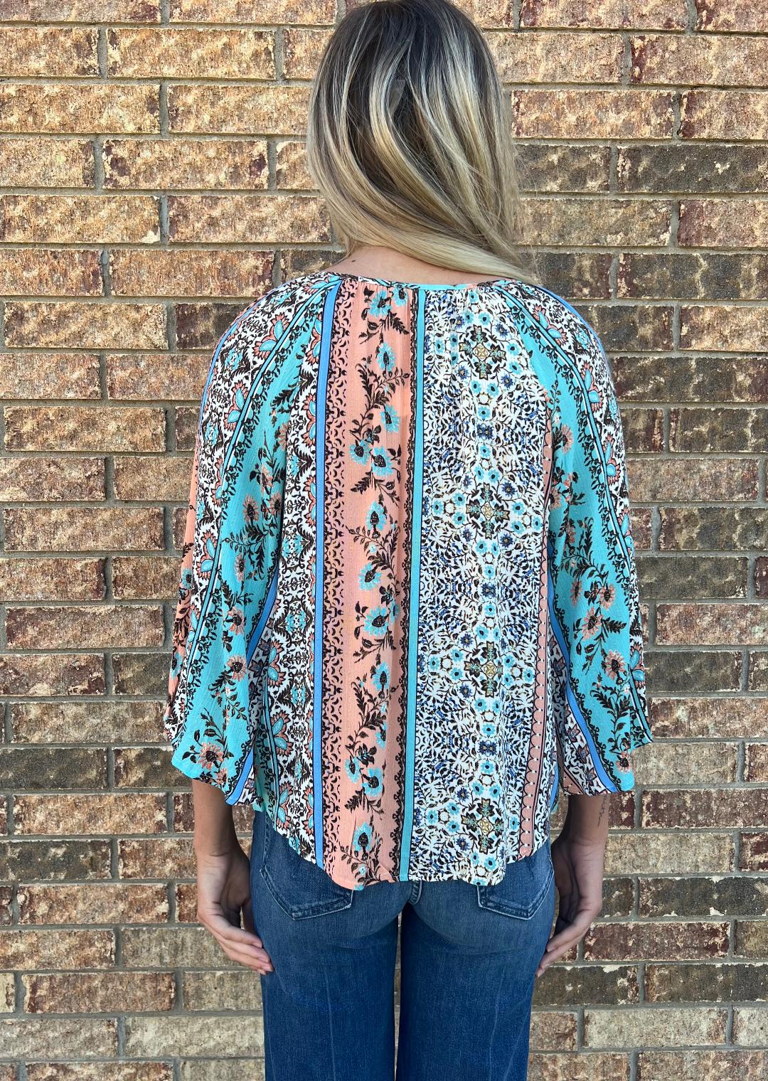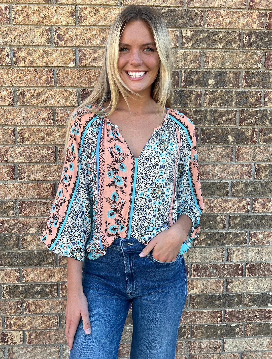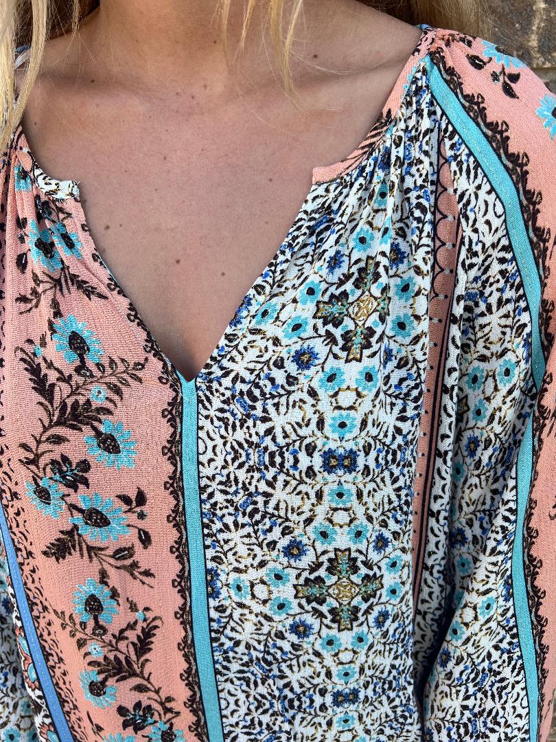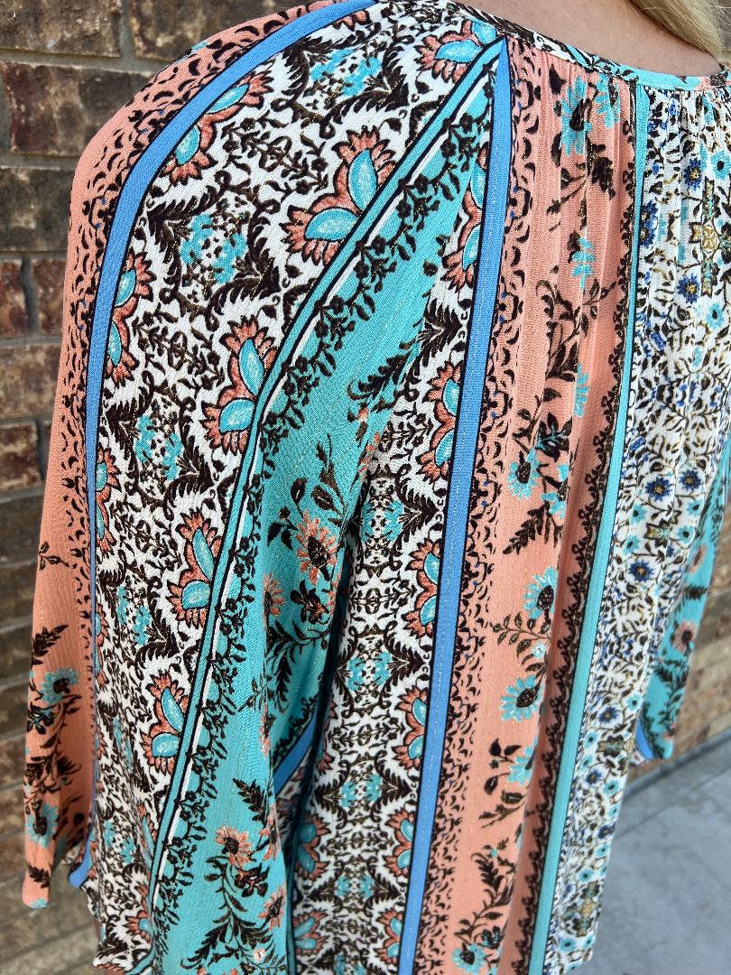 An ultra bohemian, relaxed fit top designed in a blue & coral patchwork floral print with a touch of gold threading throughout. Great for any occasion!