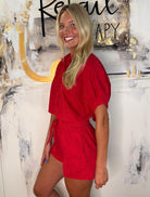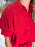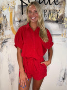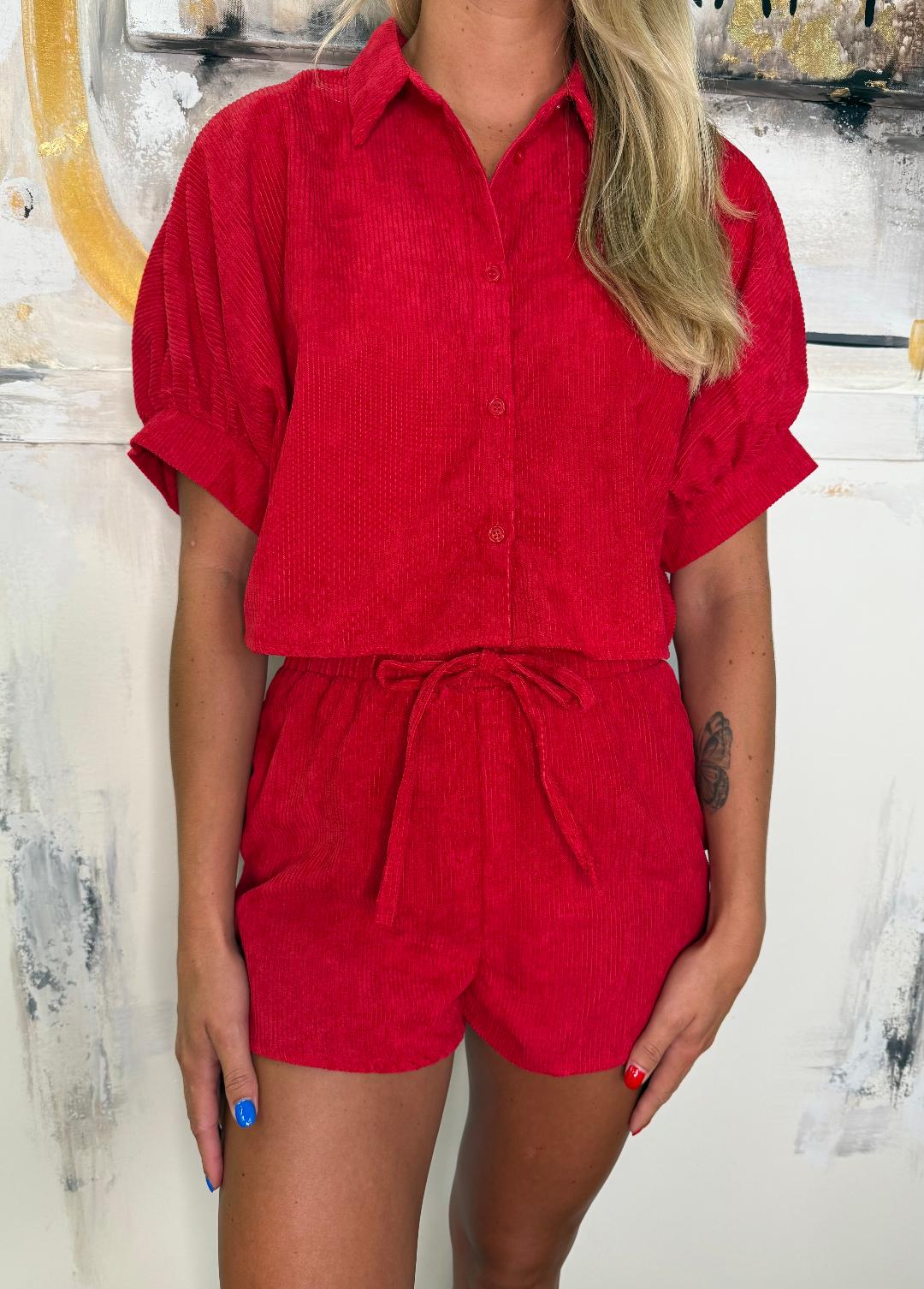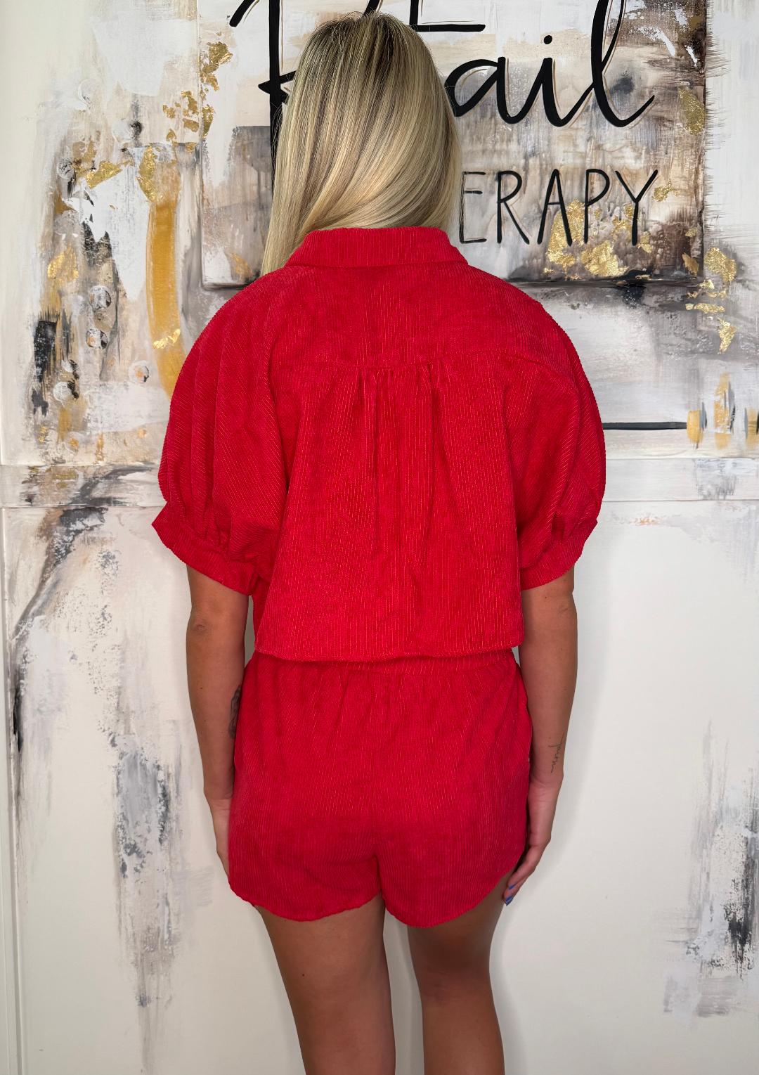 This vibrant red corduroy set is your new game day MVP! Featuring a relaxed button-up top with cuffed puff sleeves and matching drawstring shorts, it delivers both comfort and confidence. The soft corduroy texture adds a cozy fall feel, while the bright hue makes it clear who you’re rooting for. Whether you're tailgating or just wearing to any casual outing, this set is a win. Sold as a set.
