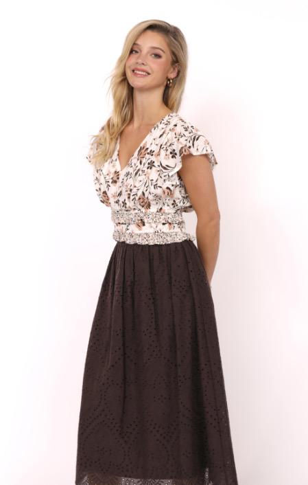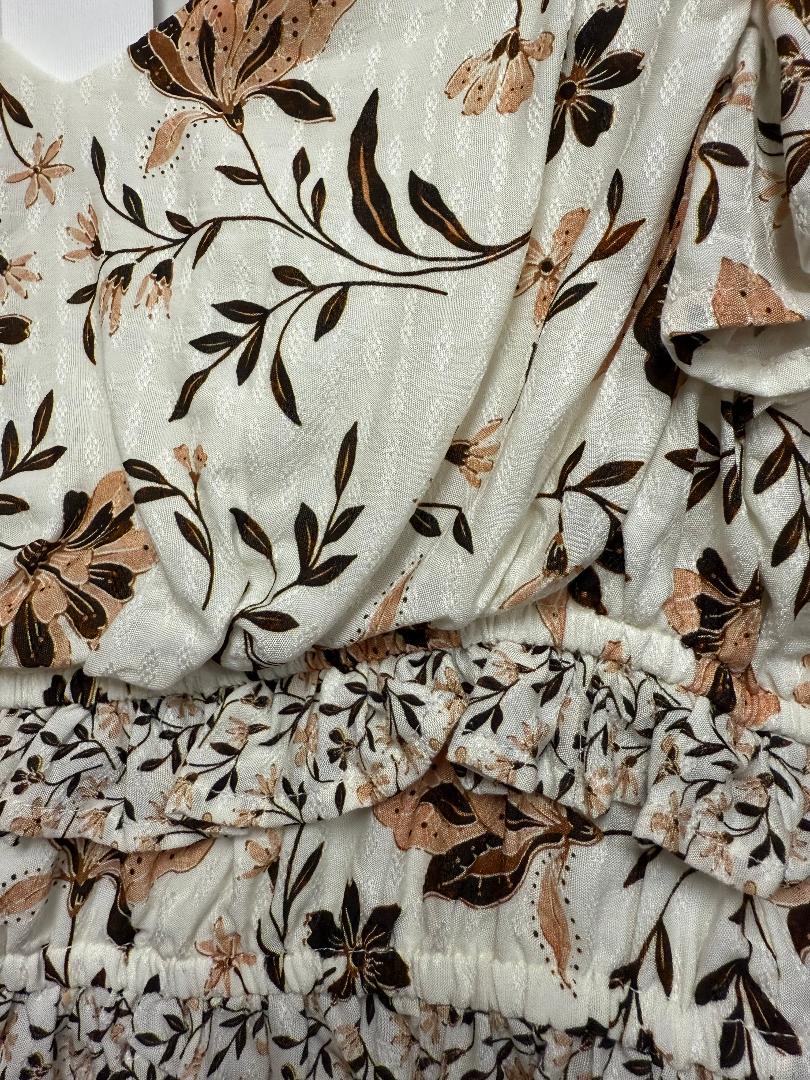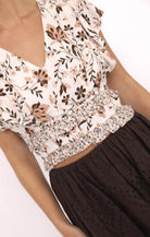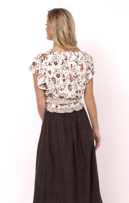 Feminine, flirty, and perfect for warm days — the Voila Ruffle Blouse features a romantic floral print in soft peach and mocha tones on an ivory background. Designed with a flattering V-neckline, flutter sleeves, and a wide smocked waistband with ruffle trim, this cropped blouse defines the waist while keeping things effortlessly breezy. Pair it with high-waisted skirts or denim for an easy, put-together look that transitions from brunch to evening strolls, summer into fall.
