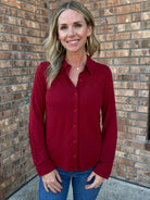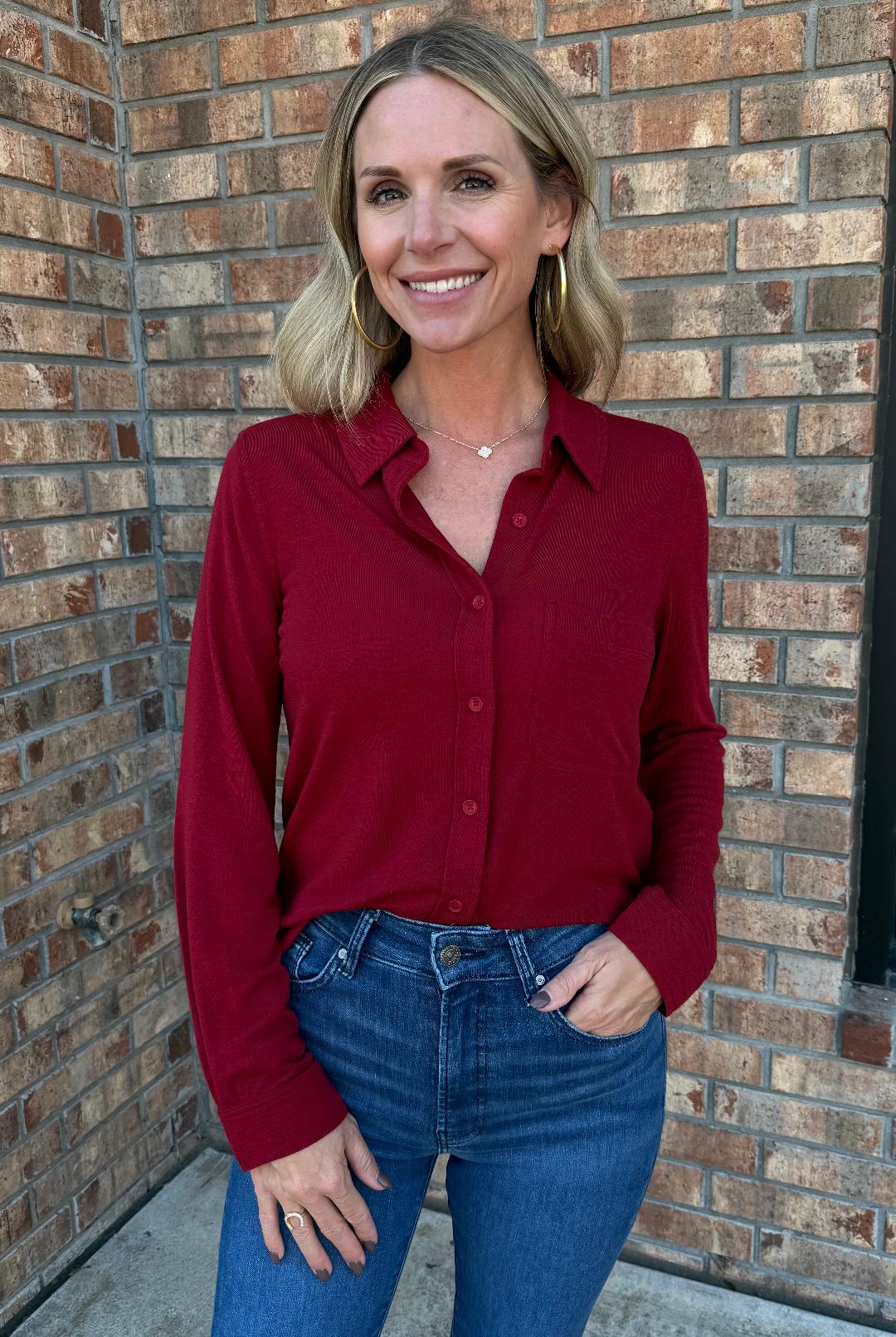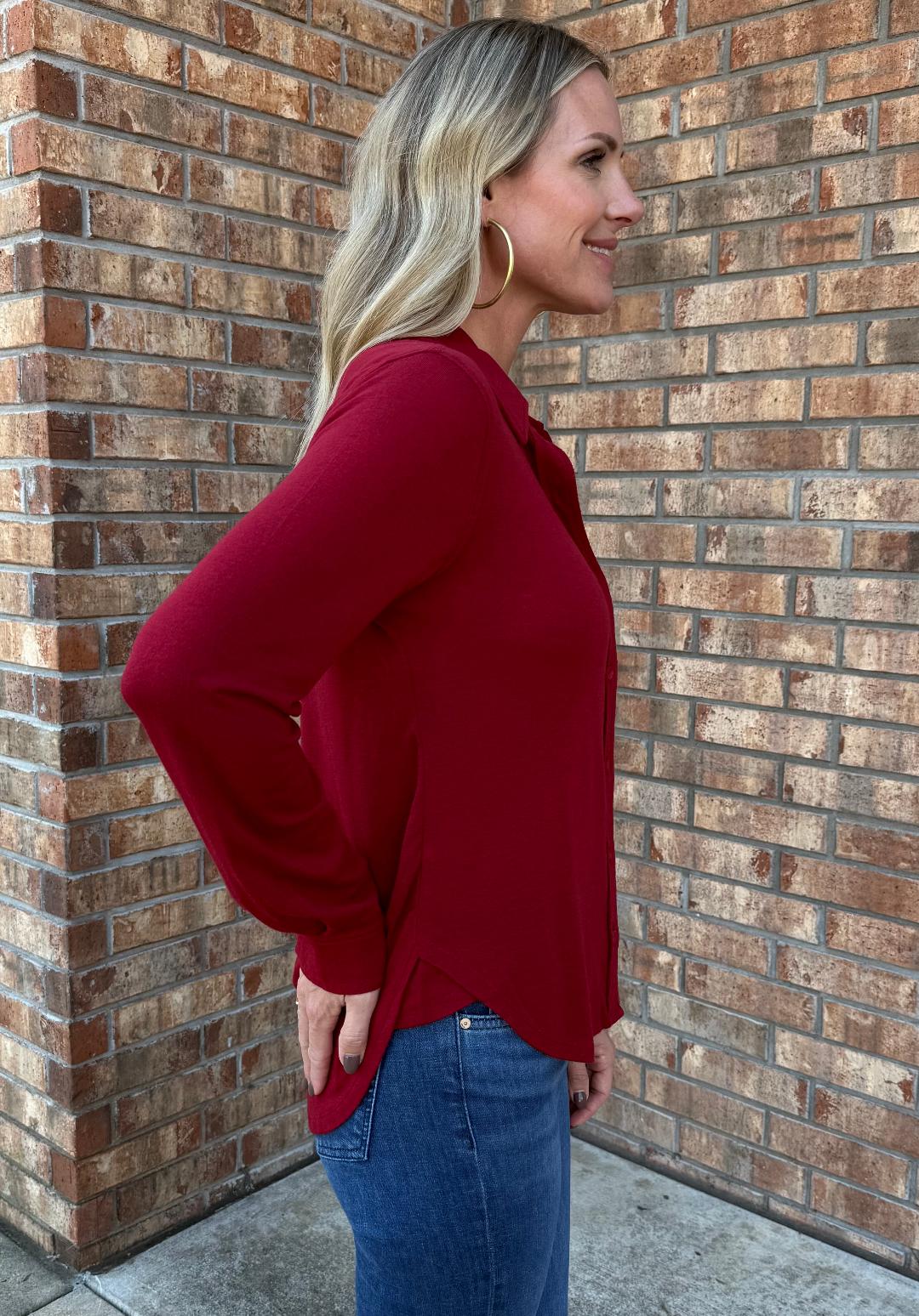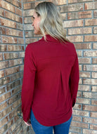 This Bobi top is crafted from a lightly brushed knit that feels unbelievably soft to the touch and stretches with ease for all-day comfort. The oxblood hue gives it a rich, elevated tone—perfect for transitioning seasons or adding warmth to your wardrobe. It features a button-front design with a classic collared neckline and chest pocket for a polished yet laid-back look. The back pleat adds a touch of movement and flow, while the slightly rounded hem makes it easy to wear tucked or untucked. A must-have for effortless style that feels as good as it looks.