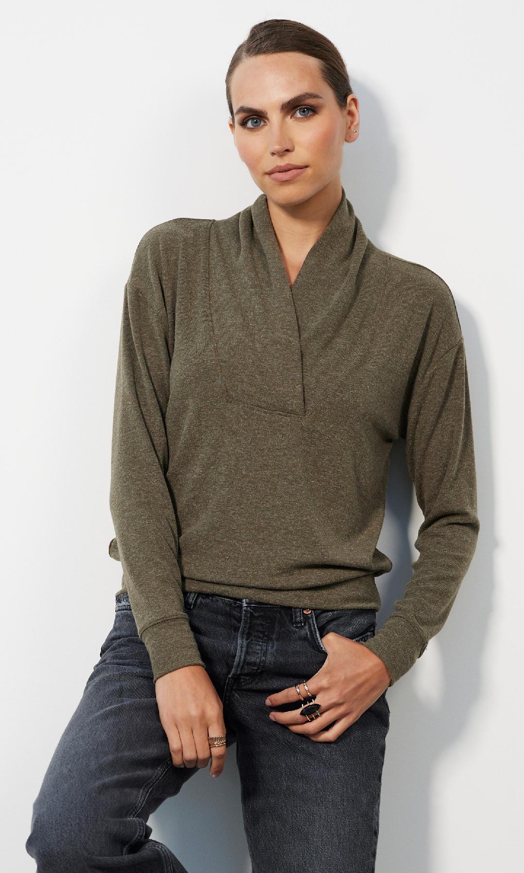 This Bobi Los Angeles top is made from a buttery soft jersey knit that drapes effortlessly for a relaxed yet refined feel. Designed in a versatile army green hue, it features a modern shawl neckline that adds subtle sophistication while keeping the look cozy and casual. The long sleeves and banded cuffs give it a clean, flattering shape, perfect for pairing with denim, faux leather, or tailored pants. Lightweight with a soft, lived-in feel, this top transitions seamlessly from lounge to lunch, offering that signature Bobi mix of comfort and cool.