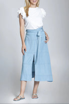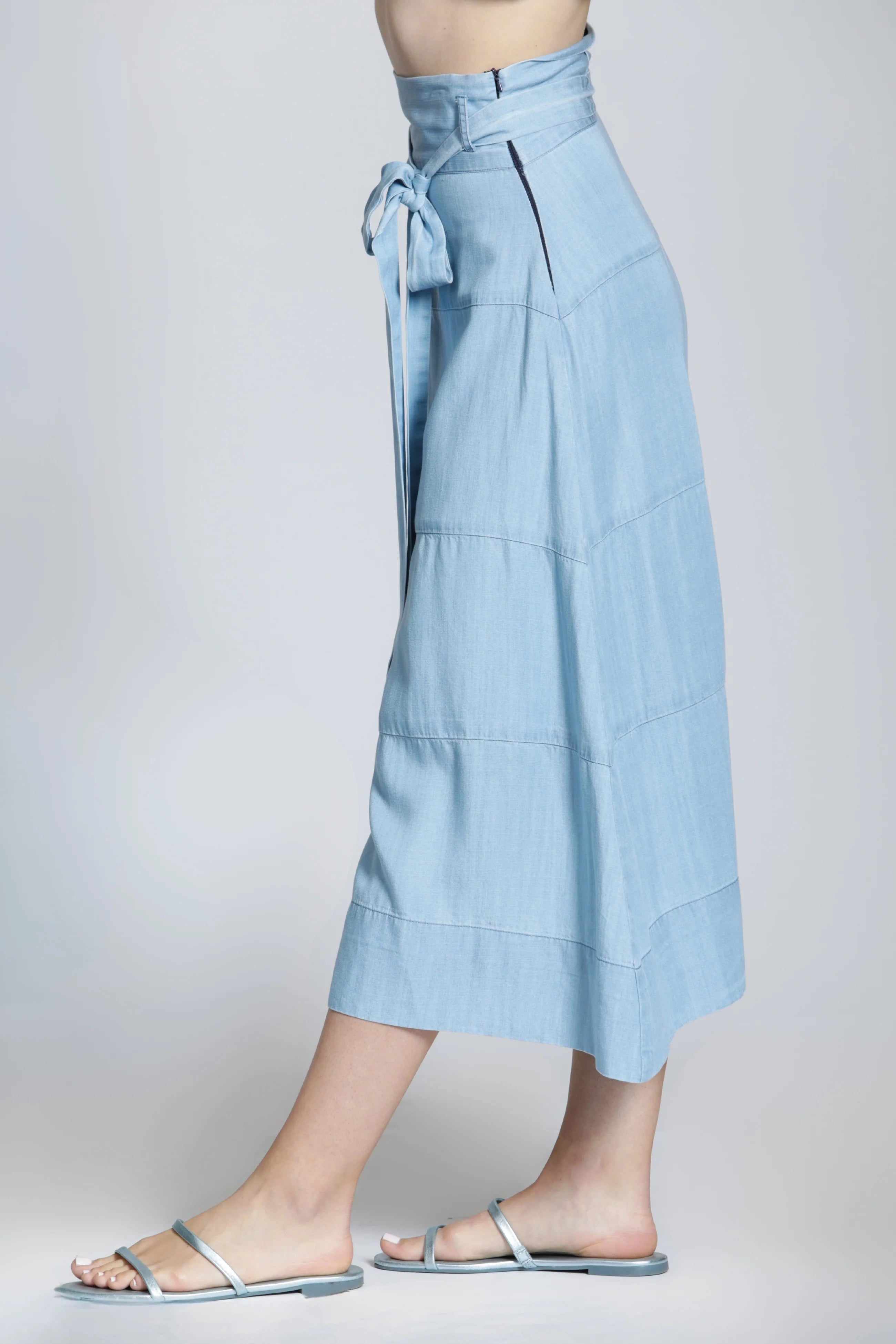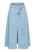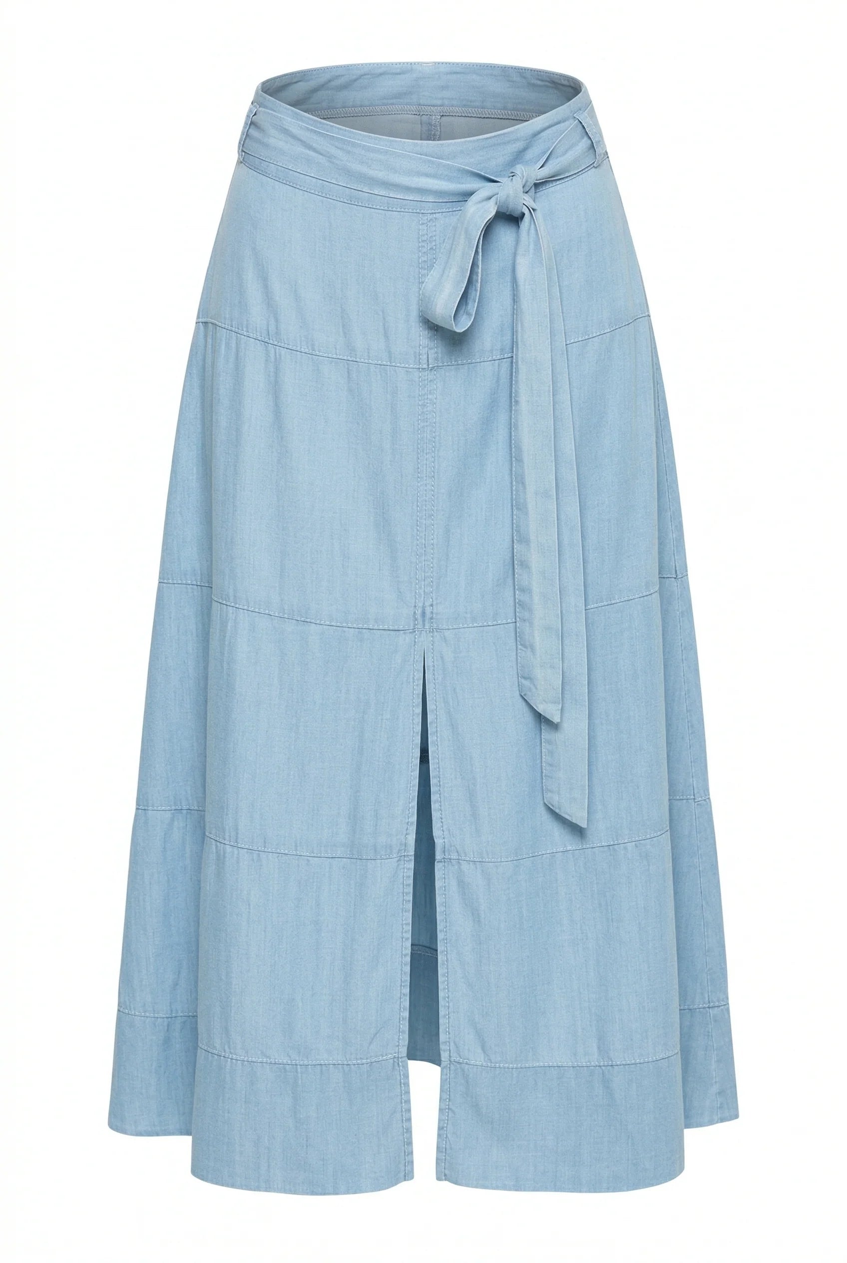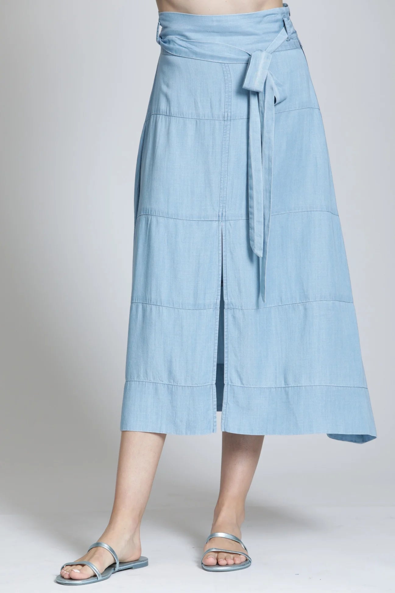 A soft and flowy midi skirt crafted from lightweight Tencel for a smooth, breathable feel with a subtle drape. Designed with a flattering high-rise waist, it features an a-line silhouette with a self-tie belt that cinches for a customizable fit. The paneled construction adds gentle movement and structure, while the front slit offers ease and a touch of modern edge. Effortless and versatile, it’s the perfect piece to dress up or down all season long.