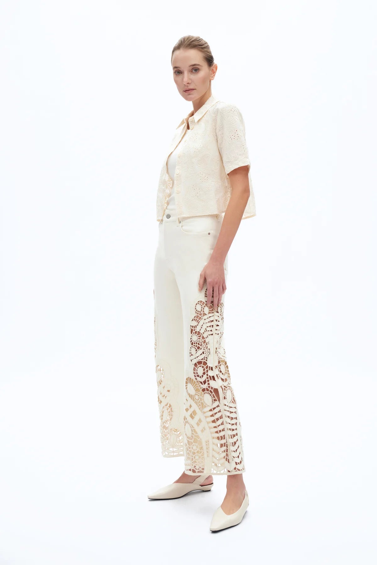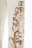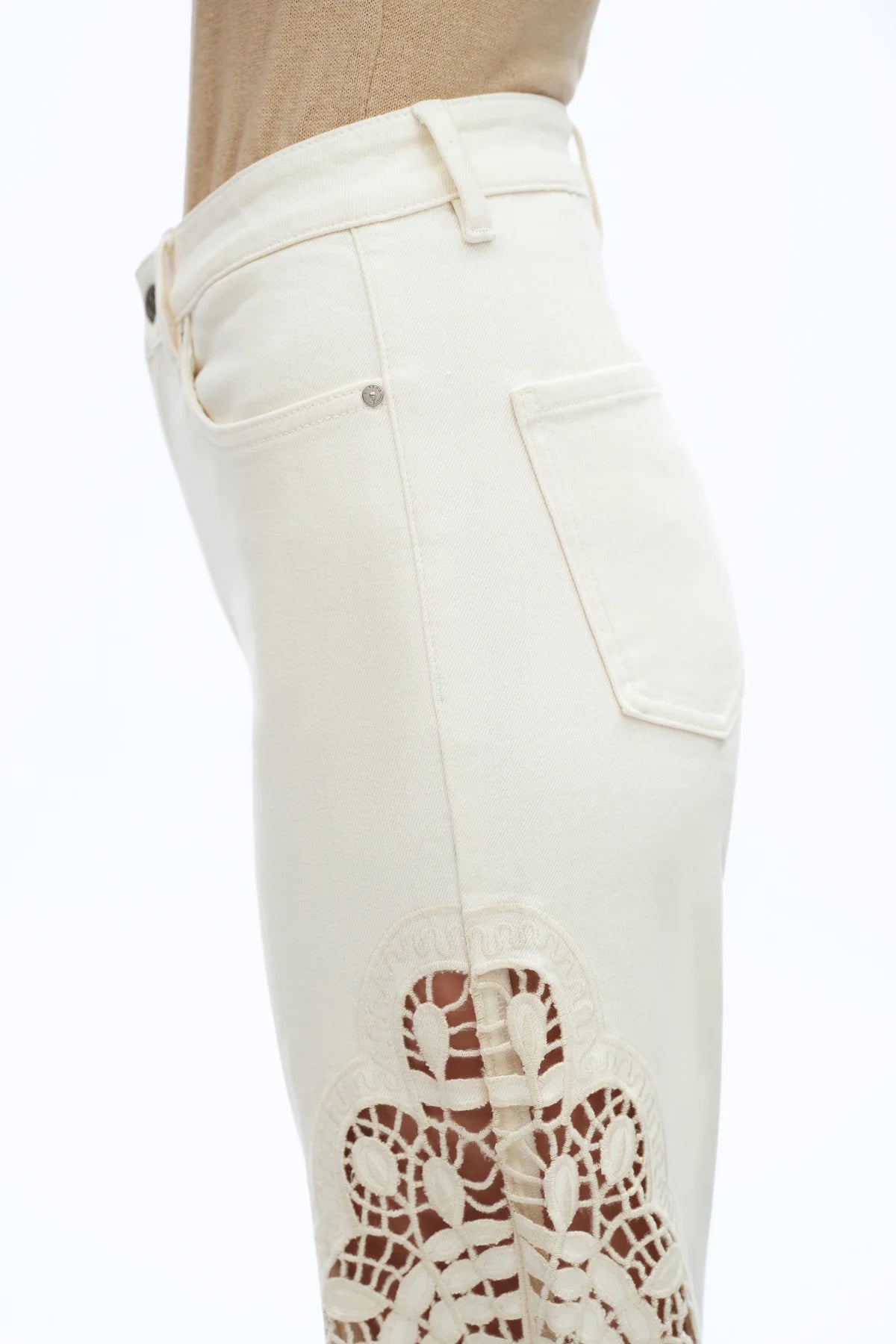 These high-rise wide leg jeans are such a statement piece — detailed and comfortable thanks to their stretch. Designed in a soft beige denim with built-in stretch, they hug through the waist and hips while still allowing ease of movement. The high-rise fit flatters and defines your waist, and the structured waistband with belt loops, classic button closure, and traditional front and back pockets keeps them polished and wearable. The standout detail is the intricate crochet embroidery that runs down the outer legs and wraps around the hem. The openwork lace panels create a beautiful, airy effect with subtle peek-through detailing, giving them that elevated, almost heirloom feel. The wide leg silhouette balances the ornate embroidery perfectly, creating movement and drama without feeling heavy. They’re the kind of denim that feels special enough for events but comfortable enough for all-day wear — pair with a simple tank, a crisp button-down, or a soft knit to let the detailing shine.