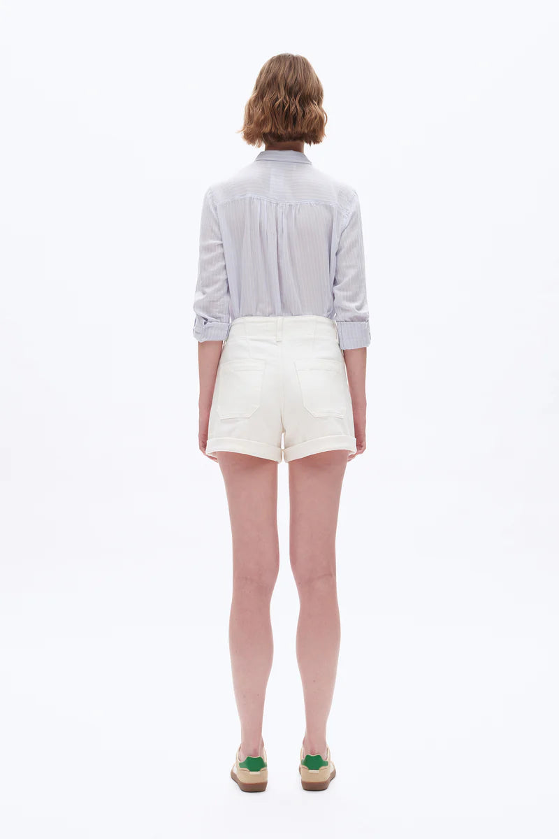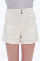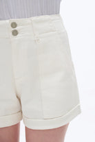 These comfy denim shorts with stretch offer an elevated casual style with a structured high-waist fit, cuffed hems, and a clean neutral tone perfect for versatile everyday looks.