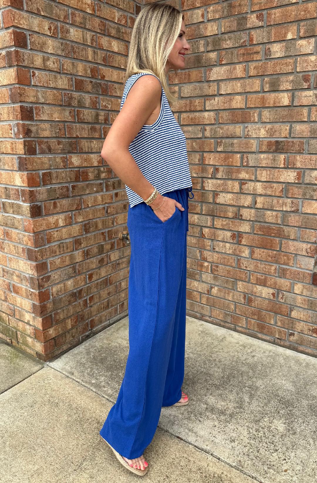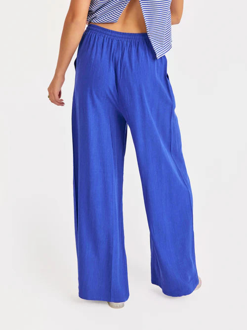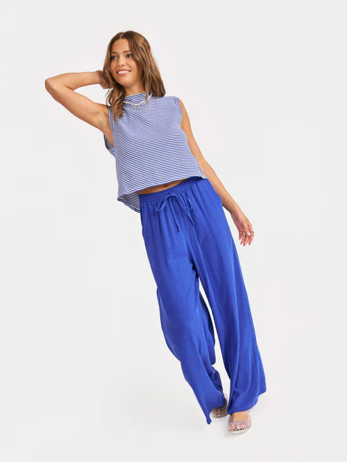 These Sugarloaf Pants feature a Cobalt Blue wash and a sophisticated wide-leg silhouette that perfectly balances coastal ease with polished style. The textured, lightweight fabric and fluid movement make these a must-have for elevated casual looks or seaside strolls. We love it with our Palms Sweater Vest or the Palma Overlap Back Top.
