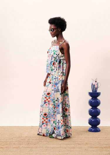 Statement-making and effortlessly flowy, these wide-leg pants feature a playful patchwork-inspired print in a mix of soft pastels and bold pops of color. Designed with a flattering high-rise fit, they have a side zip closure with an adjustable tie detail for a custom feel. Subtle pleating at the front hip adds shape and movement, while the lightweight fabric drapes beautifully. Lined to mid-thigh for coverage, they’re the perfect blend of comfort and standout style. Style with solid blouse, tee or the matching tank.