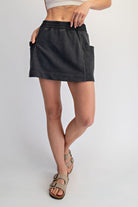 This "washed black" skort is the perfect blend of sporty and laid-back. Designed in a soft, lived-in French terry, it features a comfortable elastic waistband and a relaxed silhouette that moves with you. The standout detail is the contrast ribbed side pockets, adding texture and a subtle edge while keeping it functional. Built-in fitted shorts underneath give you that extra coverage and confidence, making it an easy go-to for everything from errands to off-duty days. Style with the matching top or any of your favorite basics.