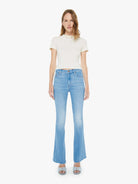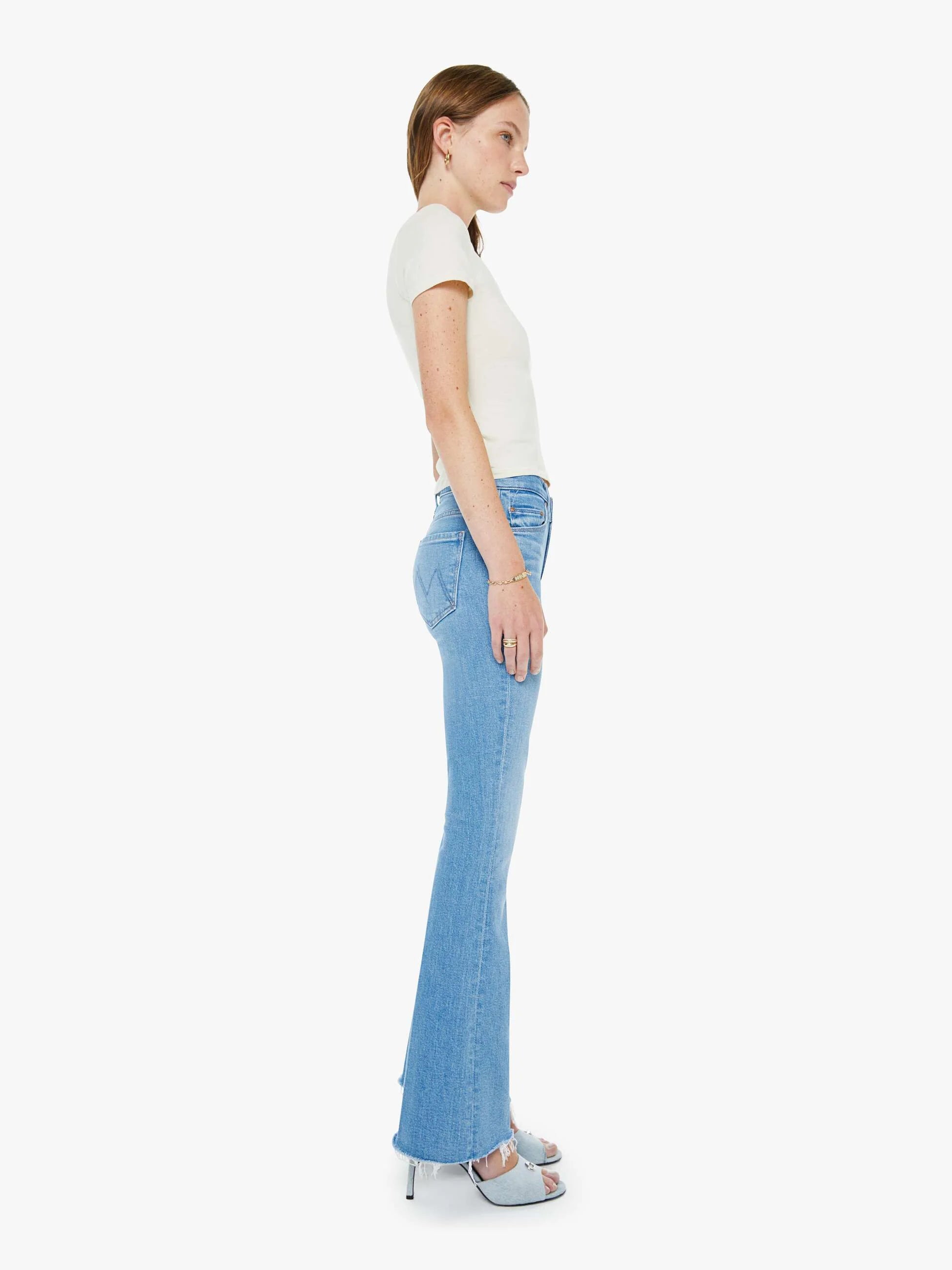 Hits the spot. Mother's most popular mid-rise flare has a zip fly, 31-inch inseam and a frayed hem. Made from a blend of recycled stretch denim, Satisfy Your Cravings is a light blue with subtle whiskering and fading at the knees.