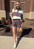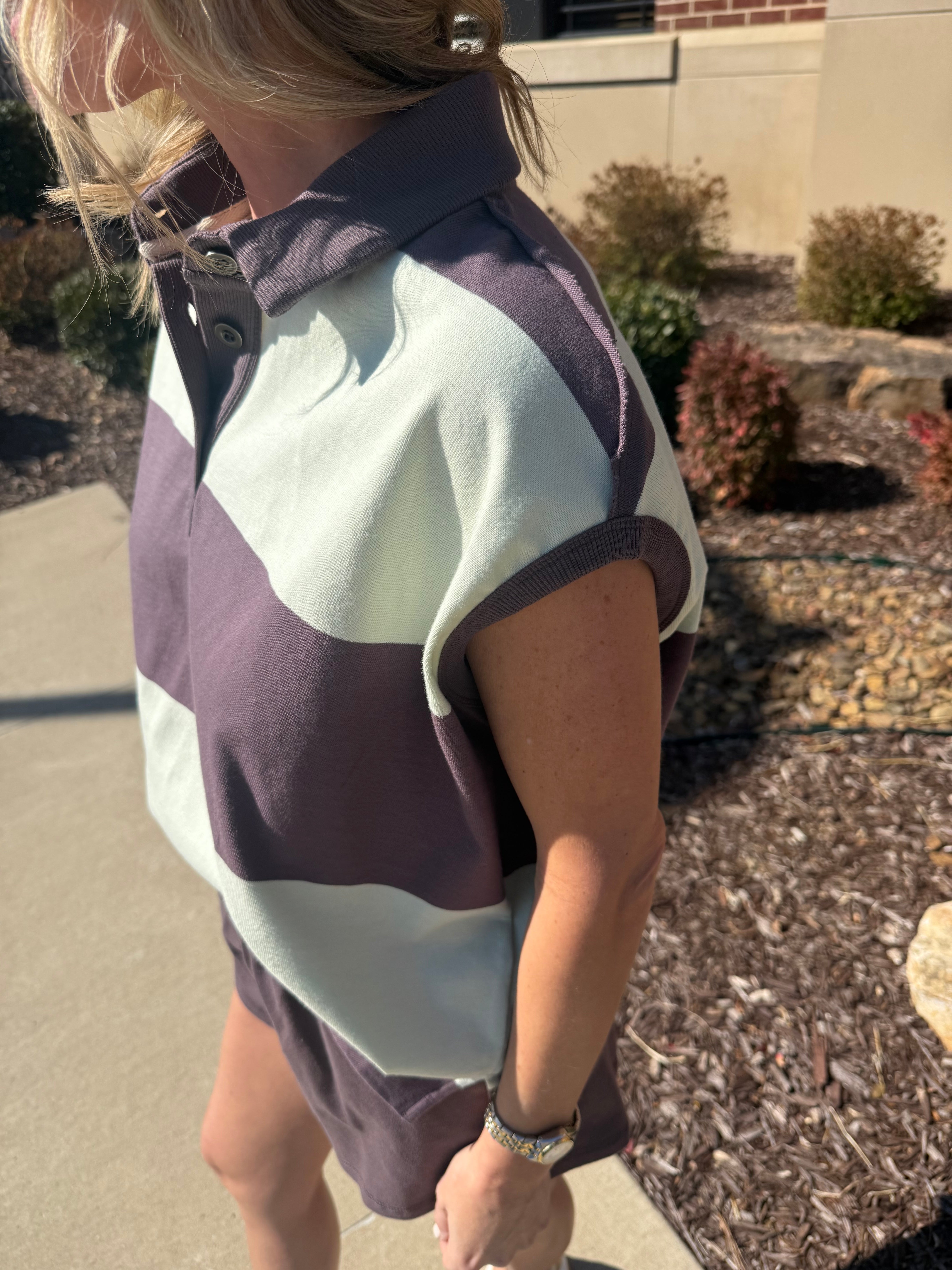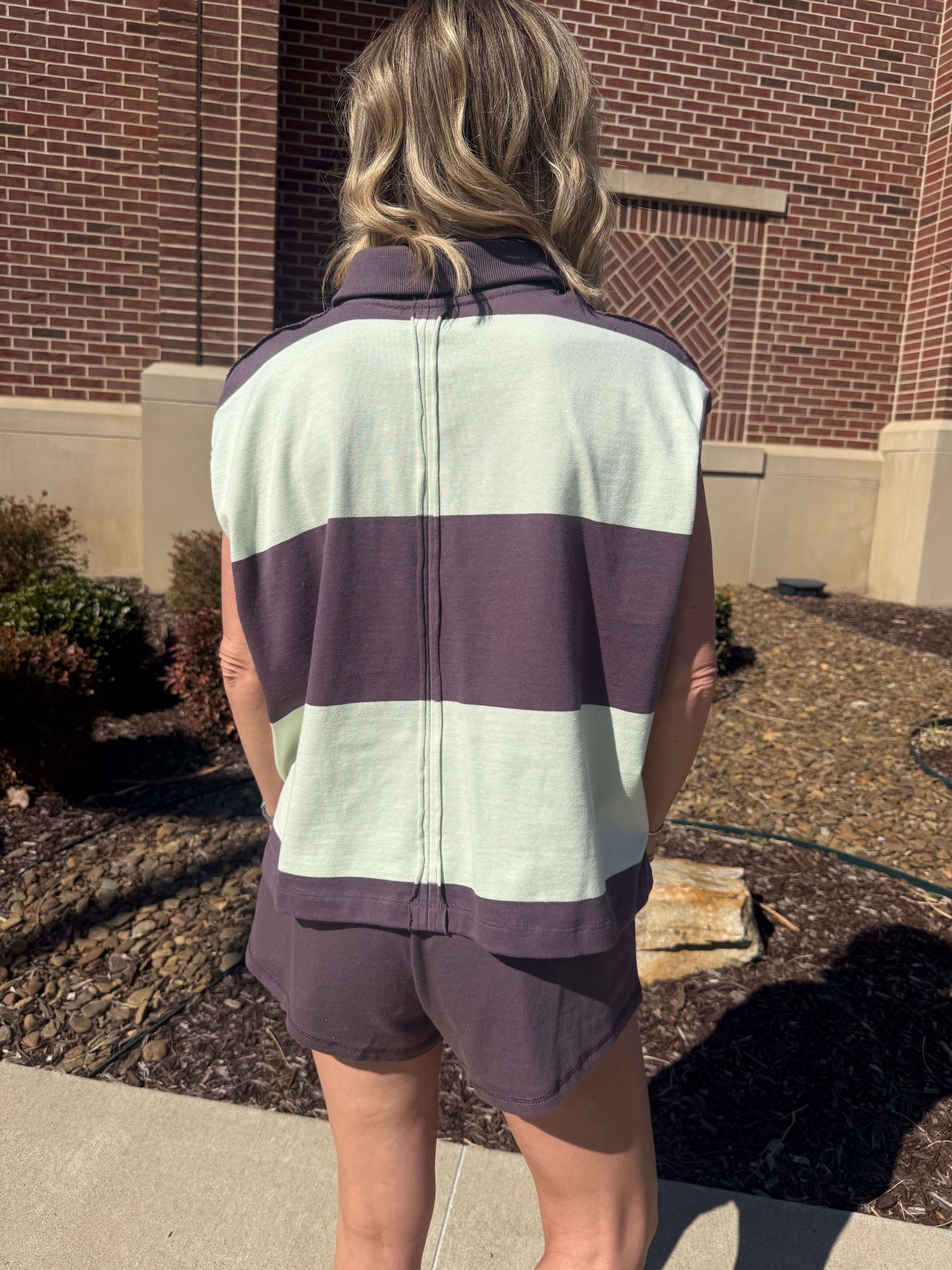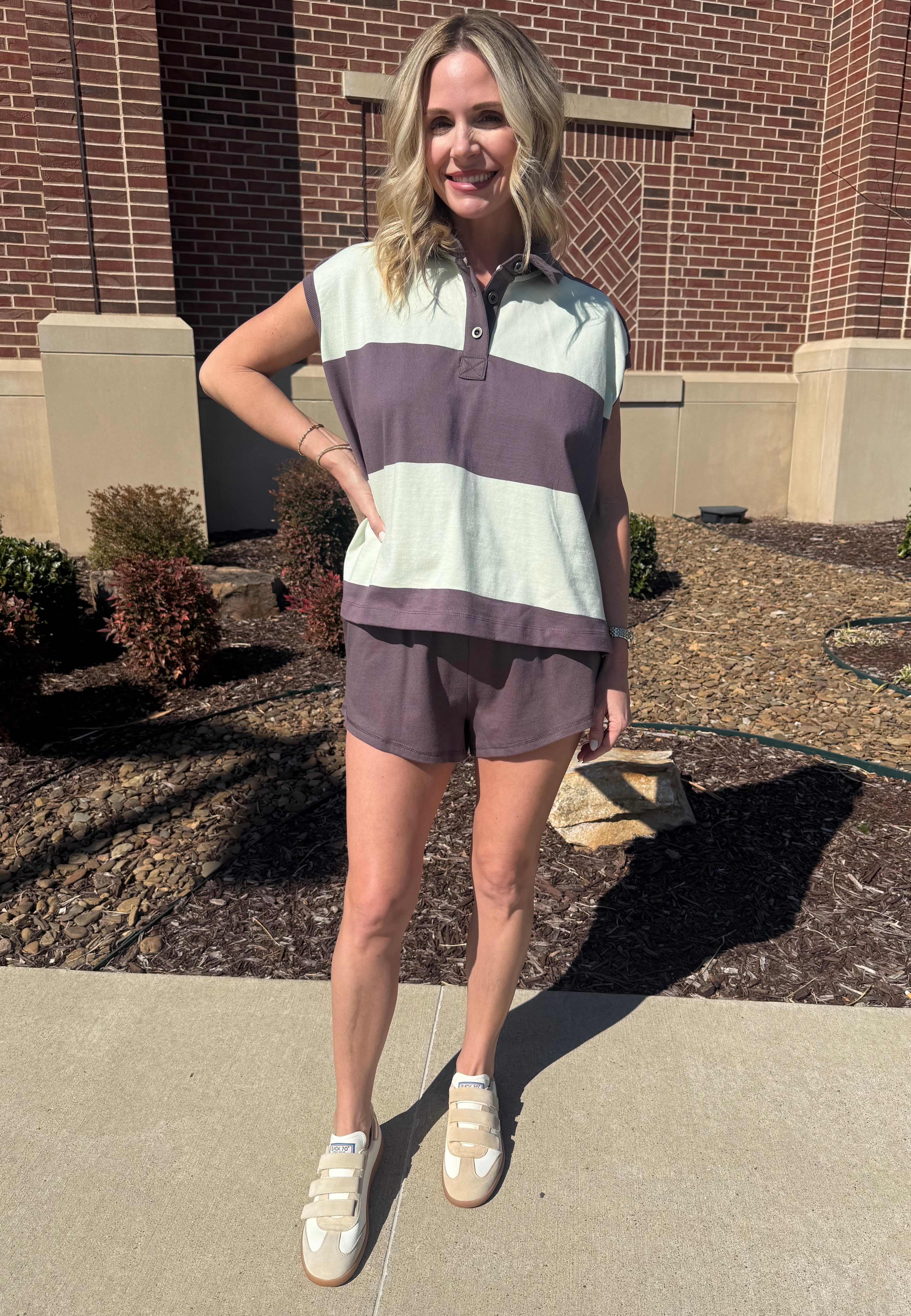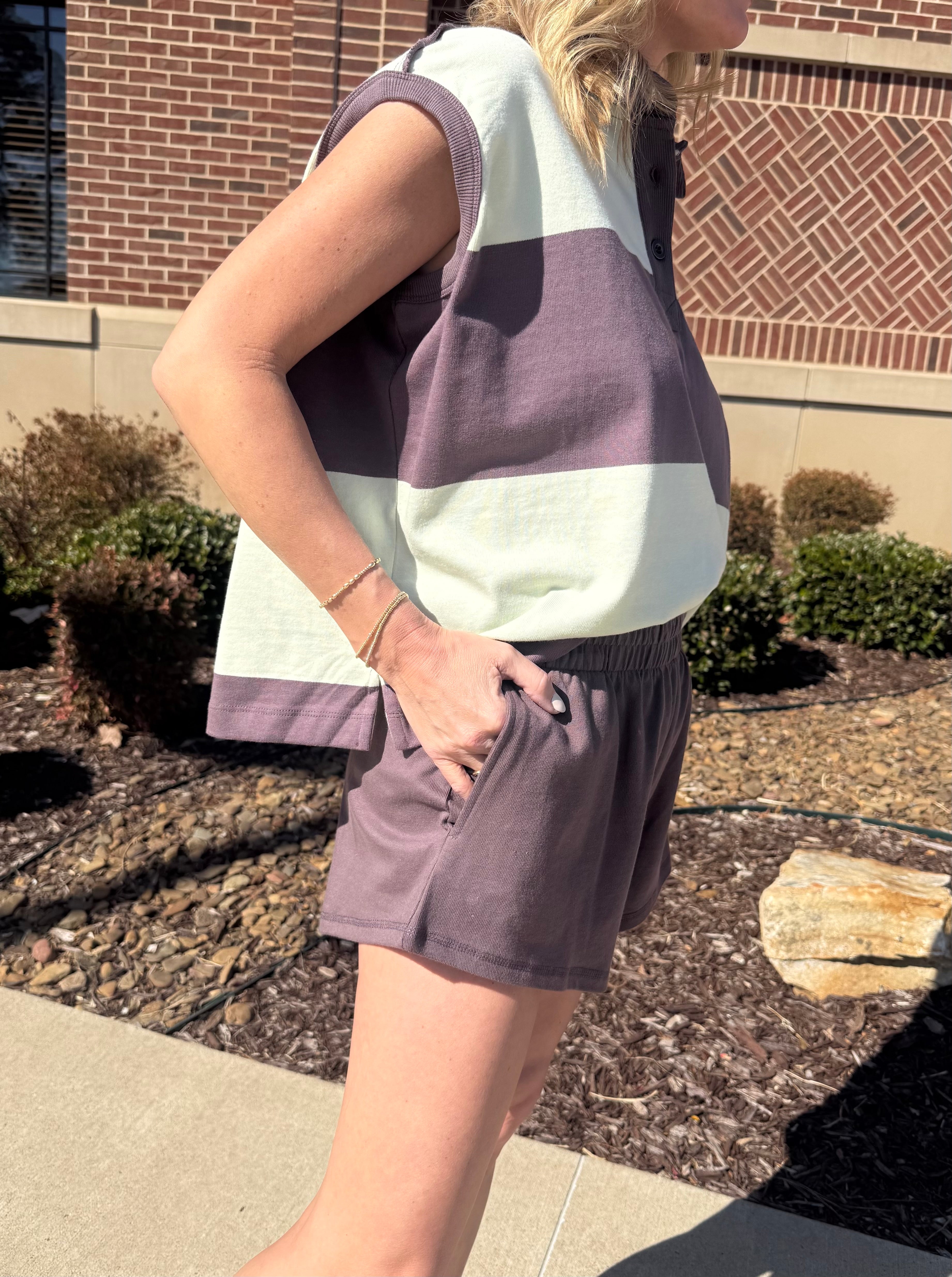 This set is such a fun nod to the polo/rugby trend that’s everywhere right now — sporty, preppy, and effortlessly cool. The top features a relaxed dolman cap sleeve silhouette with bold horizontal stripes in soft mint and rich plum brown. The classic polo collar and button placket give it that vintage rugby feel, while the slightly boxy fit keeps it modern and easy. The capped sleeve and longer hem create a flattering drape that’s comfortable without feeling too oversized. The matching shorts are designed in the coordinating plum brown with a pull-on elastic waistband for an easy, throw-on-and-go fit. They’re soft, lightweight, and finished with a clean hem for a polished athleisure look. SOLD AS A SET.