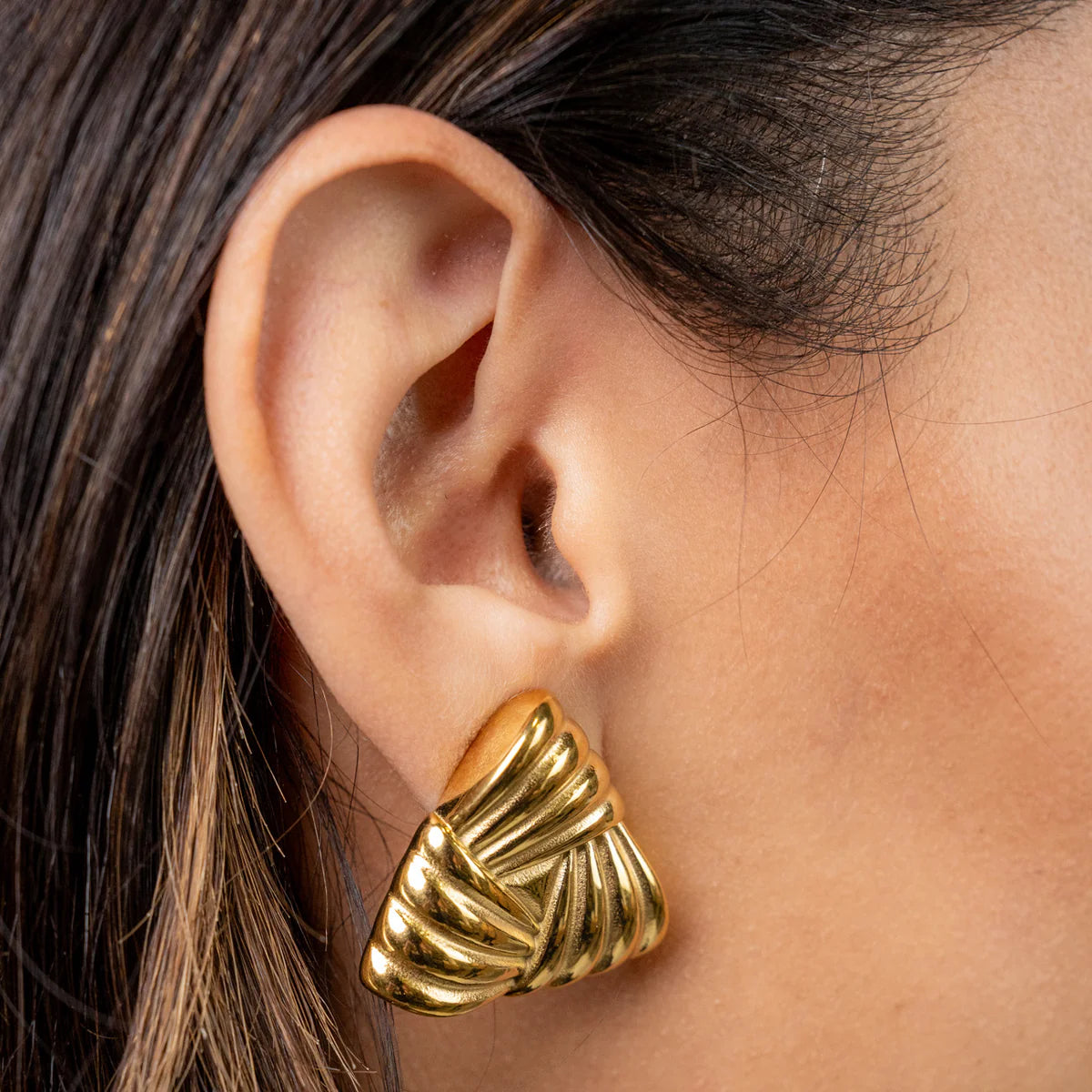 Introducing Abysse Triangle Earrings, the perfect blend of vintage and trendy. The gorgeous textured design adds a touch of elegance to any outfit. These earrings are also water resistant, making them stylish and practical. Elevate your look with these stunning earrings.
