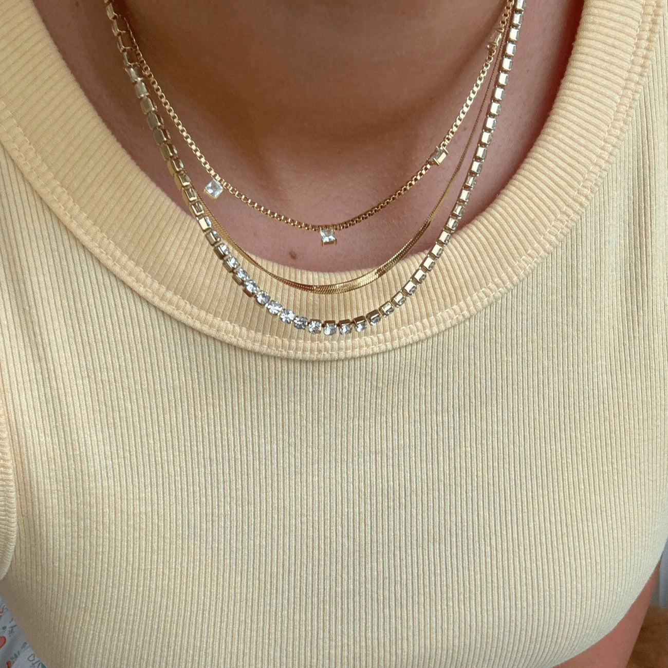 The Elara Layered Necklace combines sparkling layers and herringbone design into a sophisticated layered look. Crafted for easy styling, this water-resistant piece ensures lasting shine and effortless wear, making it a versatile addition to any jewelry collection.