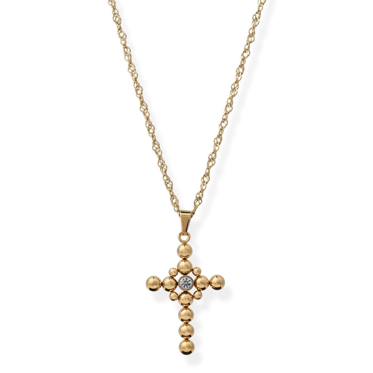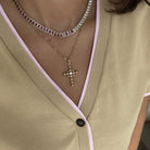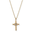 The Ember Cross Necklace features a bold and modern Italian ball point style cross with a sparkly cz accent middle stone. This faith-inspired piece is perfect for daily wear and adds a touch of elegance to any outfit. Stay connected to your beliefs while making a stylish statement.