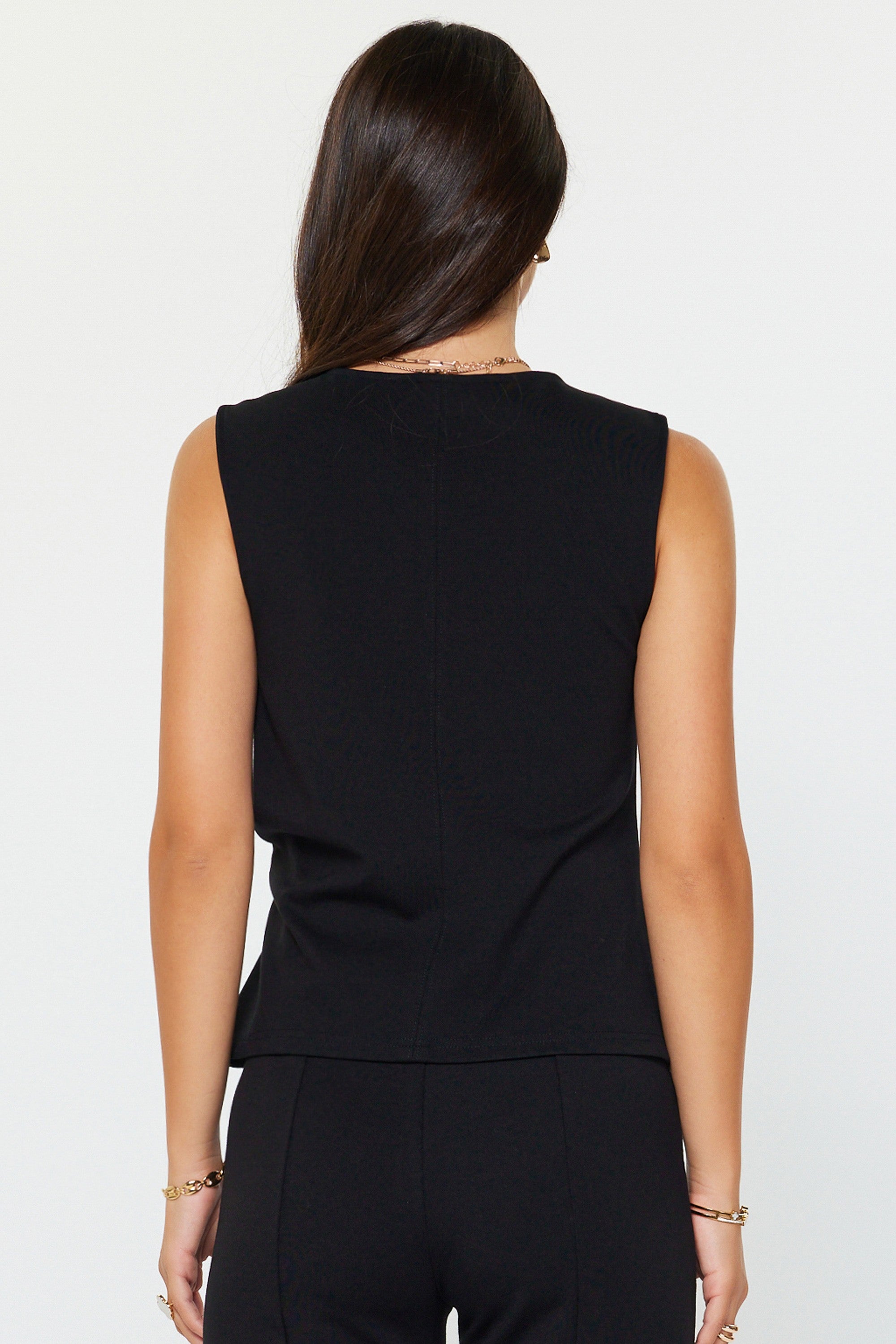 This ponte knit top is a sleek, polished essential designed with a modern, feminine twist. Crafted from a smooth, structured ponte fabric with comfortable stretch, it offers a flattering, body-skimming fit that holds its shape beautifully. The sleeveless silhouette features a classic crew neckline, while the subtle side twist detail at the waist creates soft draping that enhances the figure without feeling clingy. Finished with a clean hem and streamlined back, this top easily transitions from work to evening and pairs effortlessly with tailored trousers or denim for a more relaxed look.