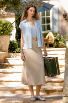 An effortlessly elevated midi skirt crafted from a breathable linen-viscose blend that gives you the perfect balance of structure and fluid movement. Designed on the bias, it drapes beautifully over the body for a flattering, elongating silhouette. The soft neutral tone makes it endlessly versatile, while the included woven raffia belt adds a touch of texture and a naturally polished finish. Fully lined for comfort and coverage, this piece feels as good as it looks.