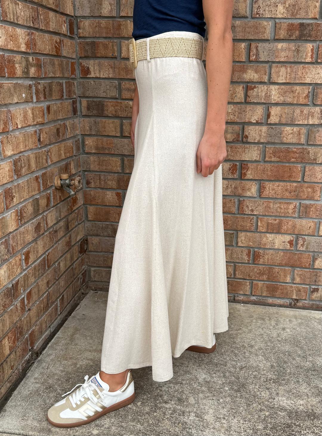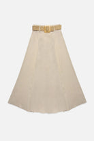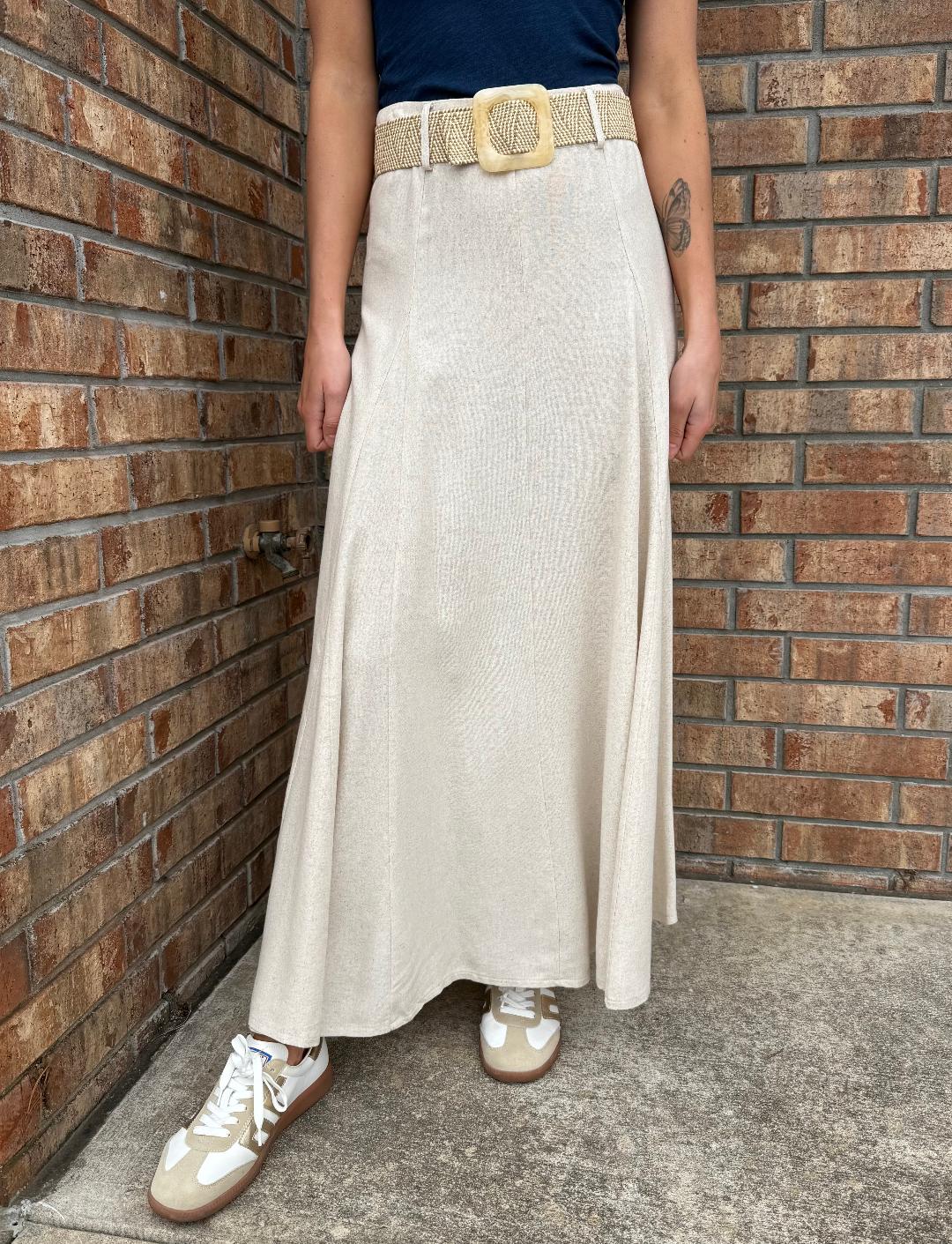 This skirt is crafted from a breathable linen–viscose blend that feels light, airy, and perfect for warm days. This neutral beauty has subtle paneling that creates a flared A-line drape, giving it a polished look while still feeling relaxed and easy to wear. Designed with a flattering silhouette that skims the body without clinging, it’s finished with a removable raffia belt that adds a natural, textured touch and defines the waist beautifully. Effortless and versatile, this skirt pairs just as well with a simple tank as it does with a breezy blouse for an elevated, everyday look.