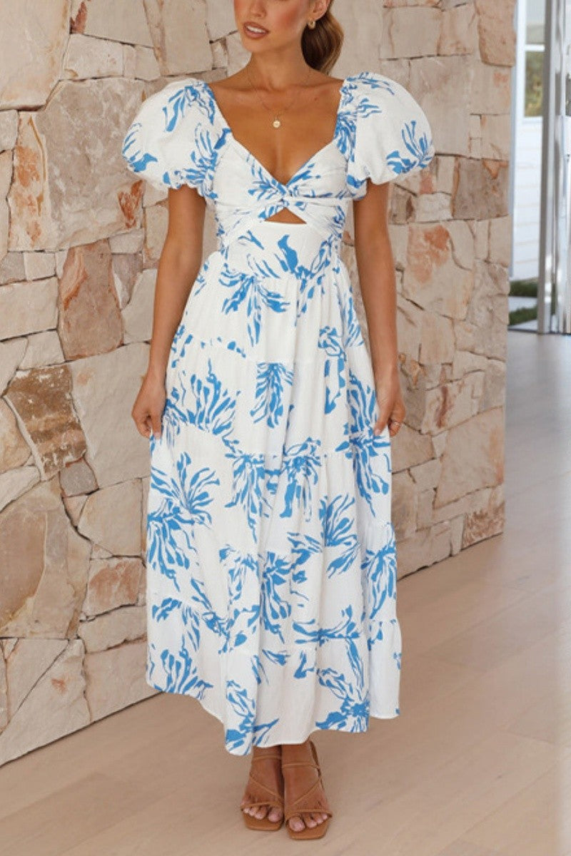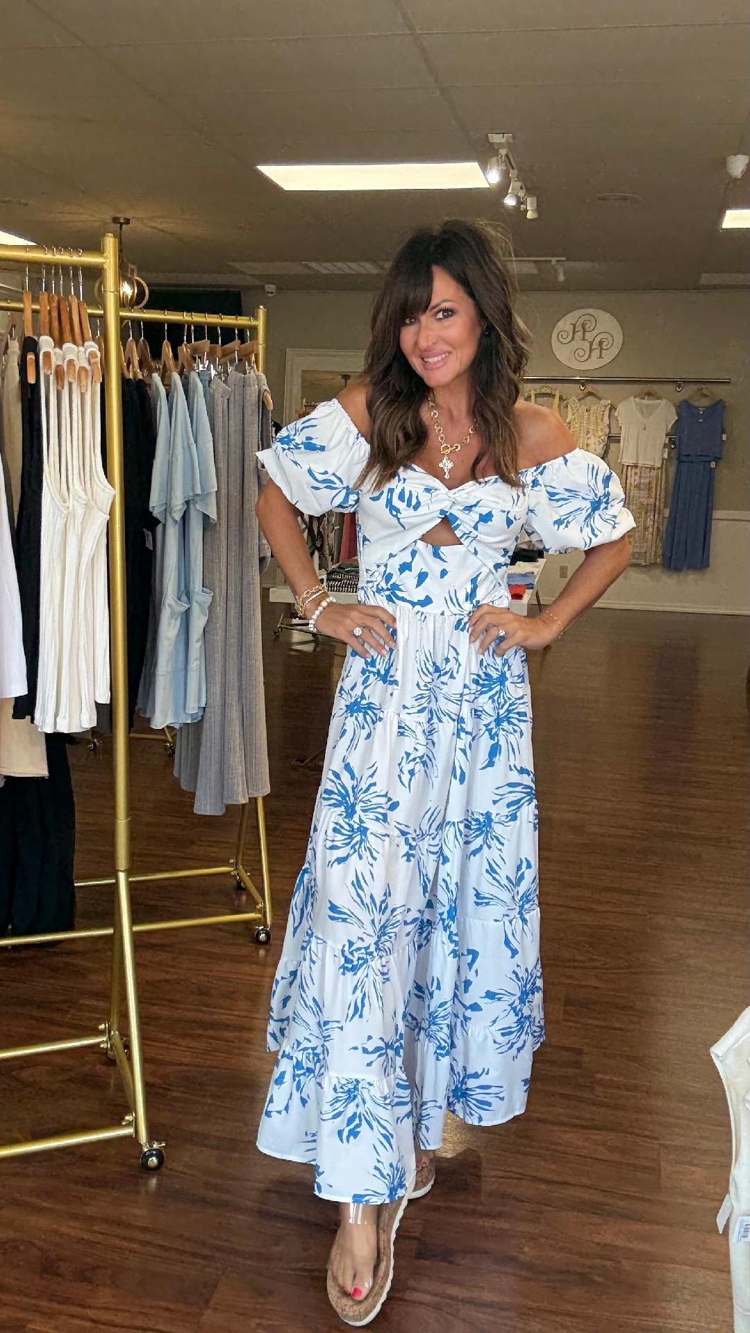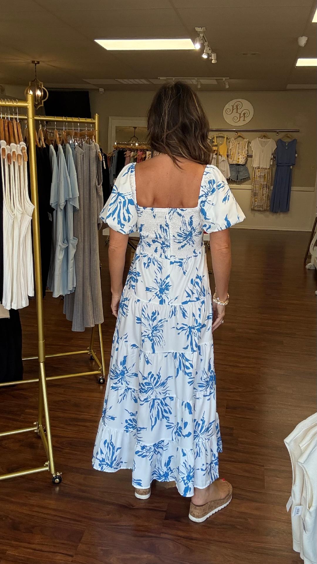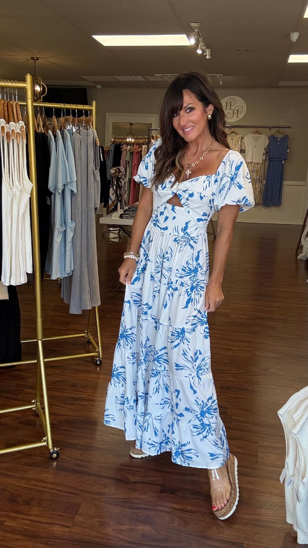 Say hello to effortless elegance in this white and blue abstract floral maxi dress. Featuring a twist-front bust with a subtle cutout, flattering puff sleeves, and a flowy tiered skirt, it’s both playful and polished. The smocked back with hidden zipper ensures a comfy, flexible fit, while the bold botanical print adds a pop of coastal charm. Dress it up with heels or down with sandals—this piece is vacation-ready and event-approved.