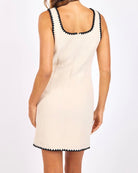 This textured mini dress is the definition of effortless polish with a playful twist. Crafted from a subtly woven fabric that gives it soft structure and dimension, it features a flattering scoop neckline and wide straps for a classic, easy fit. Black scalloped embroidered trim outlines the neckline, straps, faux front pockets, and hem—adding the prettiest contrast detail against the neutral base. The tailored silhouette skims the body without feeling tight, and a hidden back zipper keeps the finish clean and streamlined. Chic on its own with boots or heels, and equally cute layered with a jacket or cardigan or a fitted top layered underneath, this is one of those timeless pieces you can style through all the seasons that feels both classic and fresh.