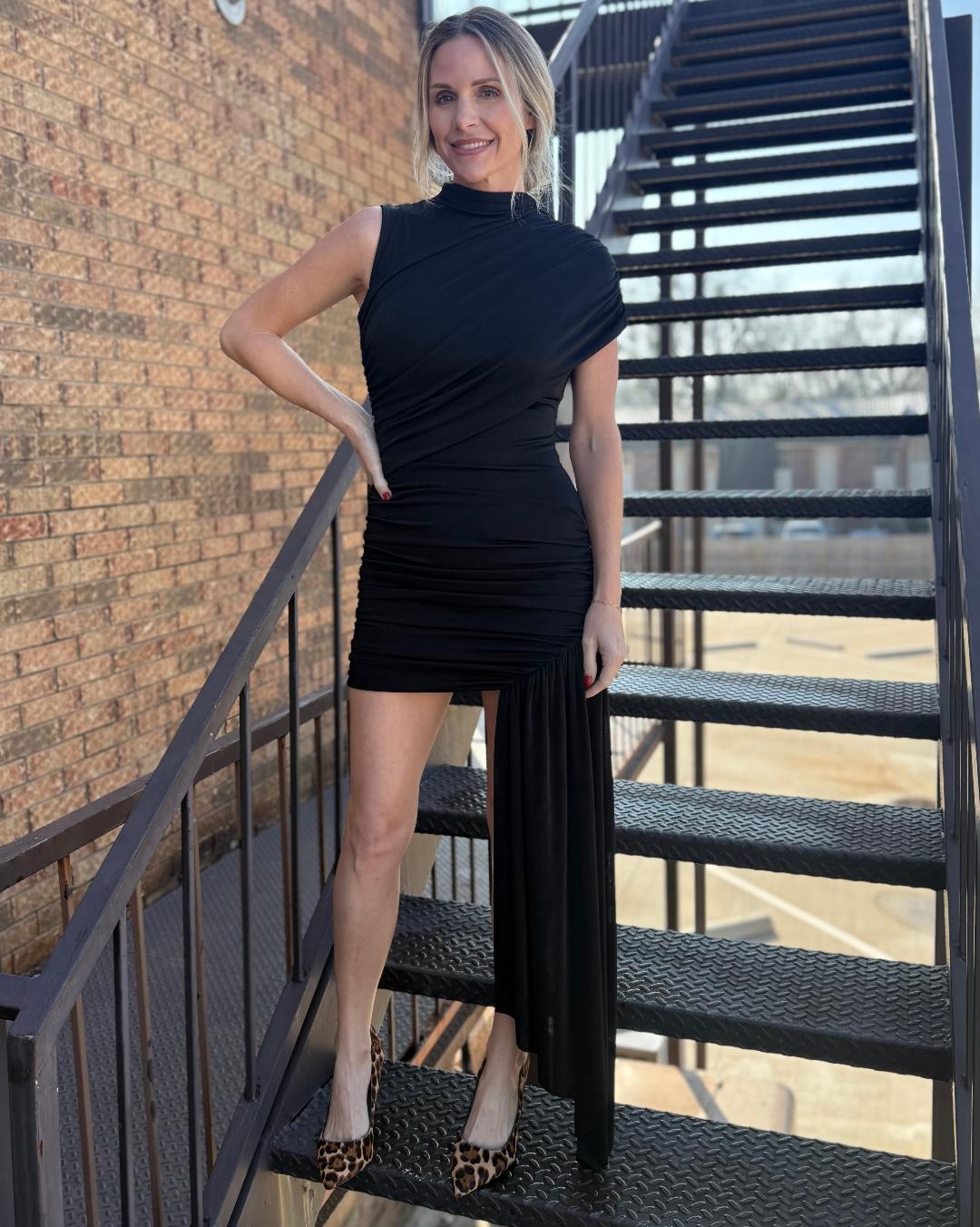 This striking black mini dress is designed to make an unforgettable statement. Crafted from a smooth, stretchy fabric, it features an asymmetrical, one-shoulder-inspired neckline created by elegant draping across the bodice. The fitted silhouette is enhanced with gathered detailing through the waist and hips, flattering the figure while adding texture and dimension. A dramatic asymmetric hemline is finished with a flowing draped panel that cascades from one side, giving the dress movement and a bold, fashion-forward edge. Sleek yet sultry, this piece is perfect for nights out, cocktail events, or any occasion that calls for confident, elevated style.
