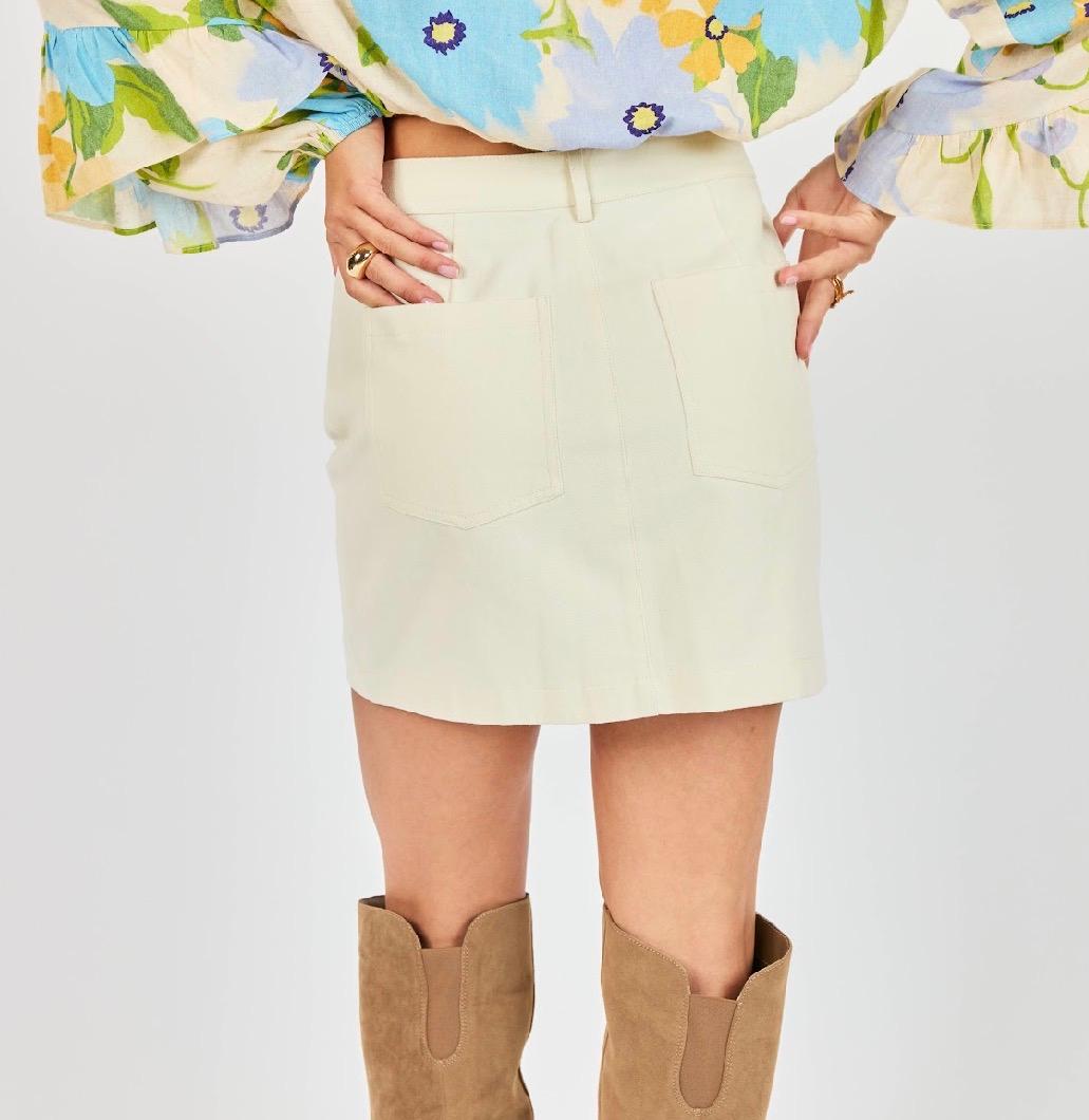This non-stretch denim mini skirt is a crisp, structured staple with a clean, tailored feel. Designed with a high-rise waist and classic mini length, it features a smooth front with a subtle button-and-zip closure and roomy patch pockets that add a utility-inspired touch. The sturdy denim holds its shape beautifully, giving it that true vintage-style fit that feels polished and intentional. Finished in a soft cream wash, it’s the perfect neutral to pair with feminine blouses, tanks, cozy knits, statement boots or sandals for an effortlessly styled look season after season.