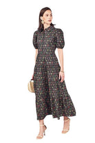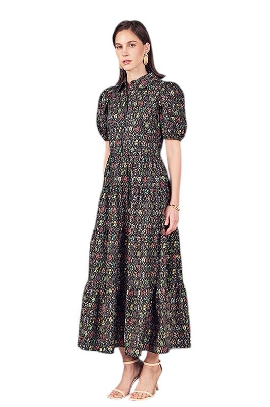 Crafted from crisp, breathable cotton poplin, this tiered maxi dress features a beautifully detailed print that adds depth and charm to its timeless silhouette. Designed with a structured button-front bodice, short puff sleeves, and a flattering fitted waist, it flows into a softly tiered skirt that moves with ease. Thoughtful side pockets add everyday functionality, while the lightweight cotton fabrication keeps it comfortable and polished from day to night. Perfect for work, church, brunch, showers, or dressed up with heels for special occasions.