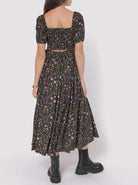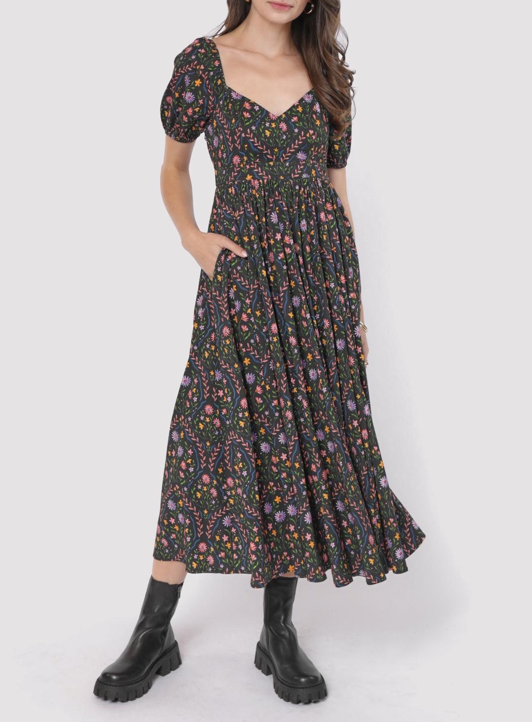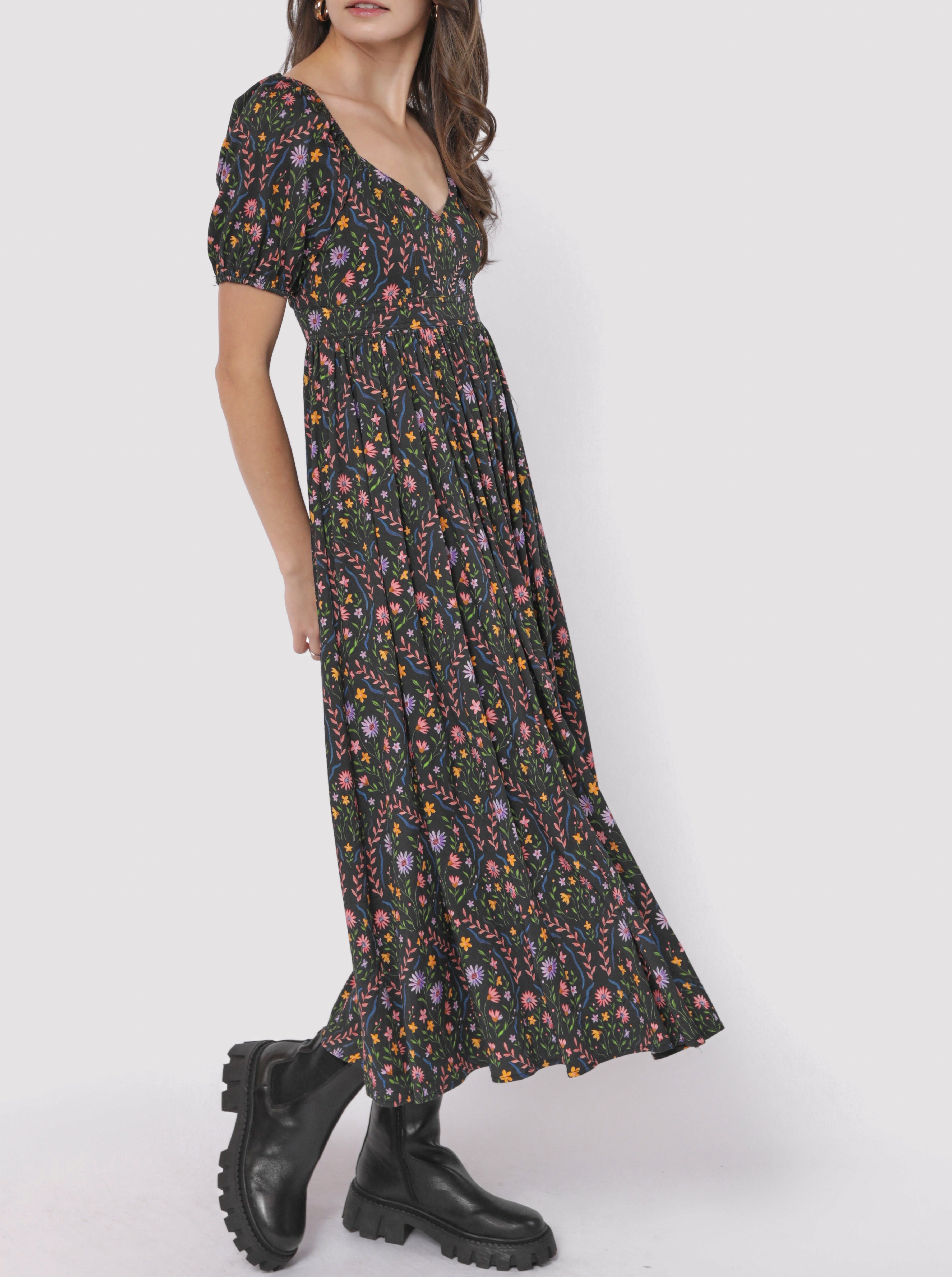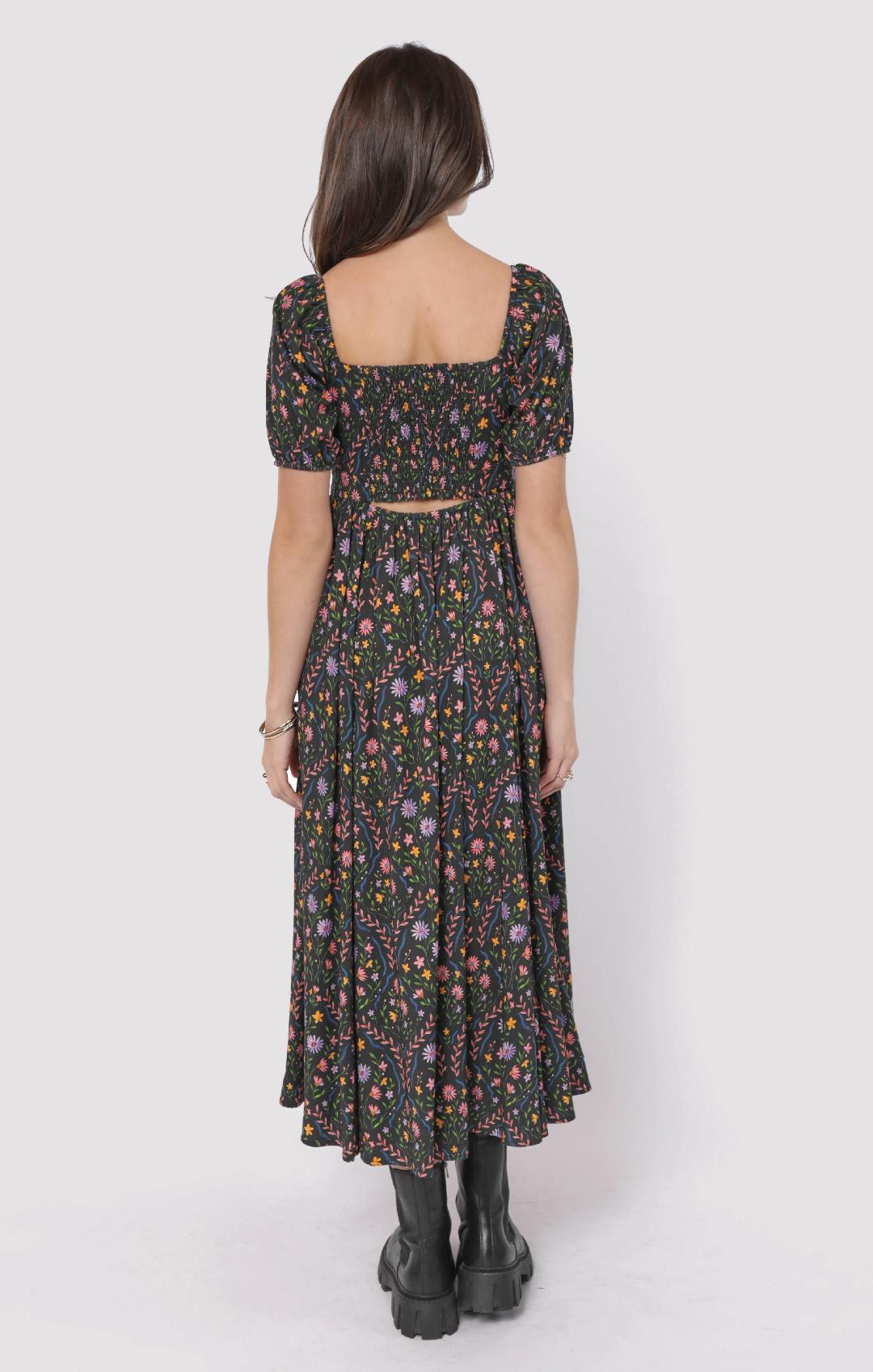 A little sweet, a little unexpected — the Garden Party Cutout Maxi Dress brings whimsical charm with a modern twist. Featuring a romantic sweetheart neckline and puff sleeves, this flowy black-based maxi is covered in a vibrant floral print with hints of lavender, coral, yellow, and green. The smocked bodice offers a flattering fit, while the surprise back cutout adds a playful peek of skin. Finished with pockets and a breezy tiered skirt, it’s perfect for brunches, outdoor weddings, or simply feeling your prettiest any day of the week.