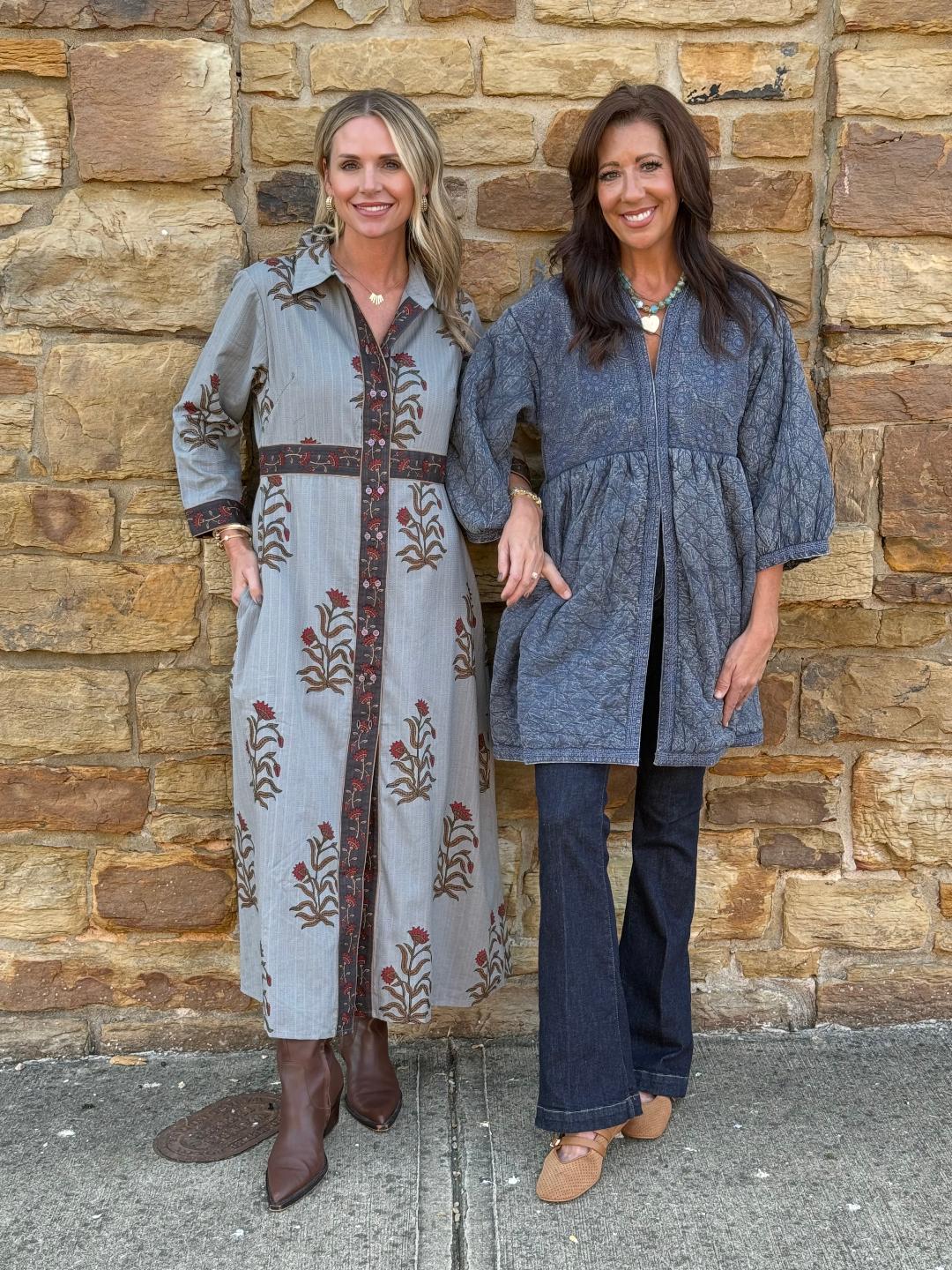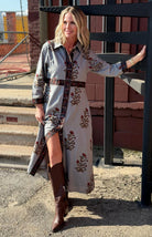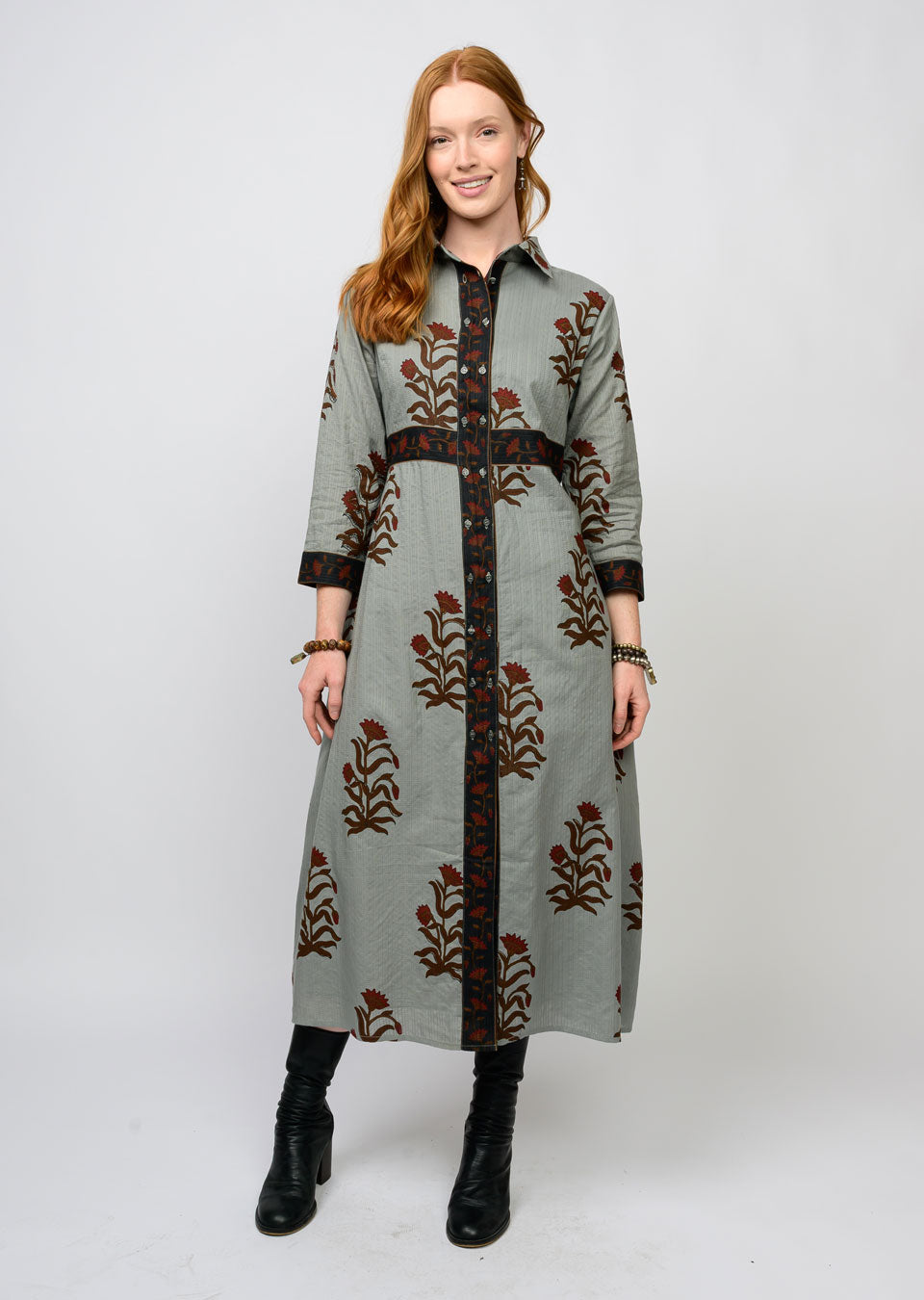 This long-sleeve midi dress brings a sophisticated boho feel with its tailored shirt-dress silhouette and statement embroidery throughout. Designed in a soft sage base with rich brown and red hand blocked floral motifs, it features a collared neckline, double button-front closure, and a defined waist accentuated by contrast bands. The double-button detailing down the front adds both style and structure, while the midi length offers versatile wear — pair it with tall boots for fall or dress it up with heels for a polished look.