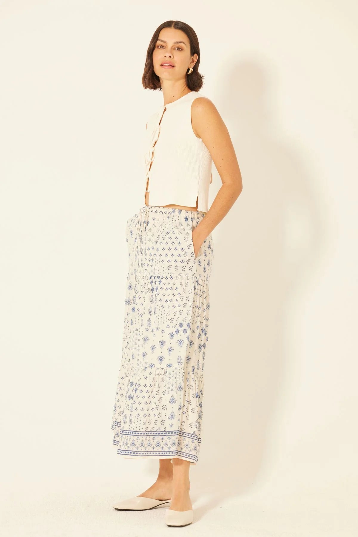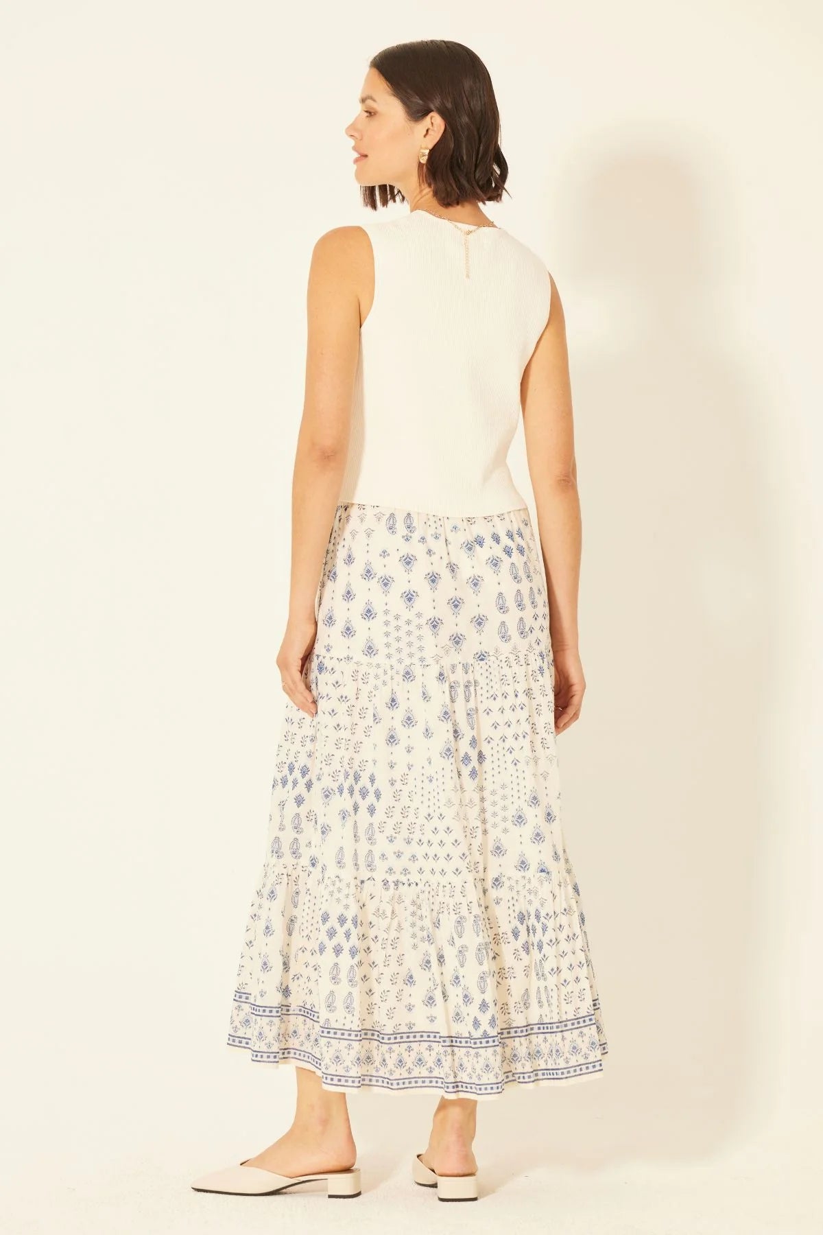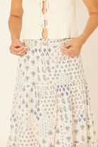 The Hollycrest Blue Print Skirt is a soft and breezy midi that brings a touch of bohemian charm to your everyday rotation. Crafted from lightweight cotton, this tiered silhouette features a flowy fit with an elastic drawstring waistband for all-day comfort. The ivory base is adorned with an intricate blue block-print motif that gives it an artisanal, globally inspired feel. Finished with hidden side pockets and a border-printed hem, it’s the perfect piece to pair with tanks, blouses, or cropped knits for an effortlessly elevated look.
