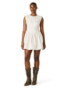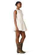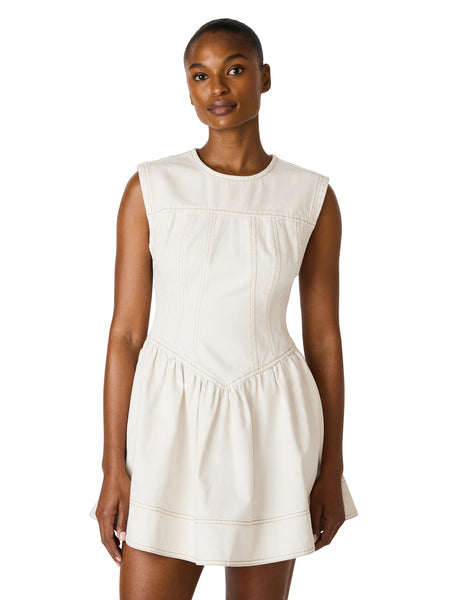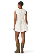 The Irinna Dress in a sand color features refined tailoring with meticulous stitched detailing throughout, creating a polished silhouette. The high neckline offers sophisticated coverage, while the functional back zipper provides an elegant closure and easy wear. This mini denim dress combines contemporary design with expert craftsmanship, making it an essential piece for elevated everyday styling or special occasions.